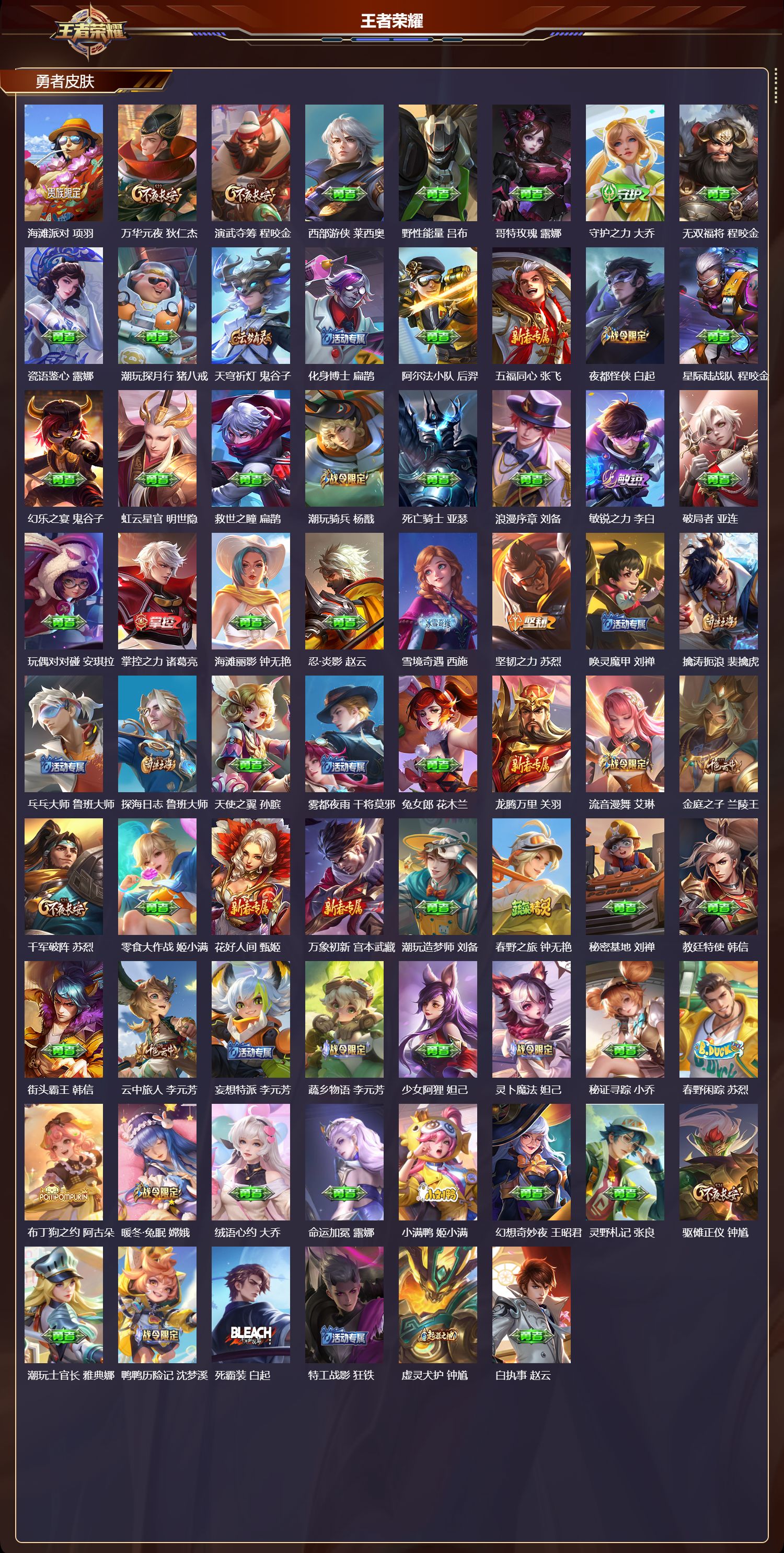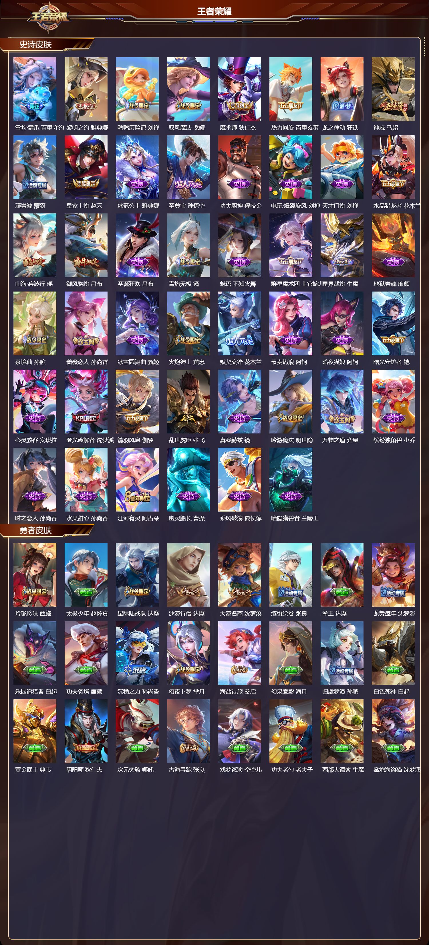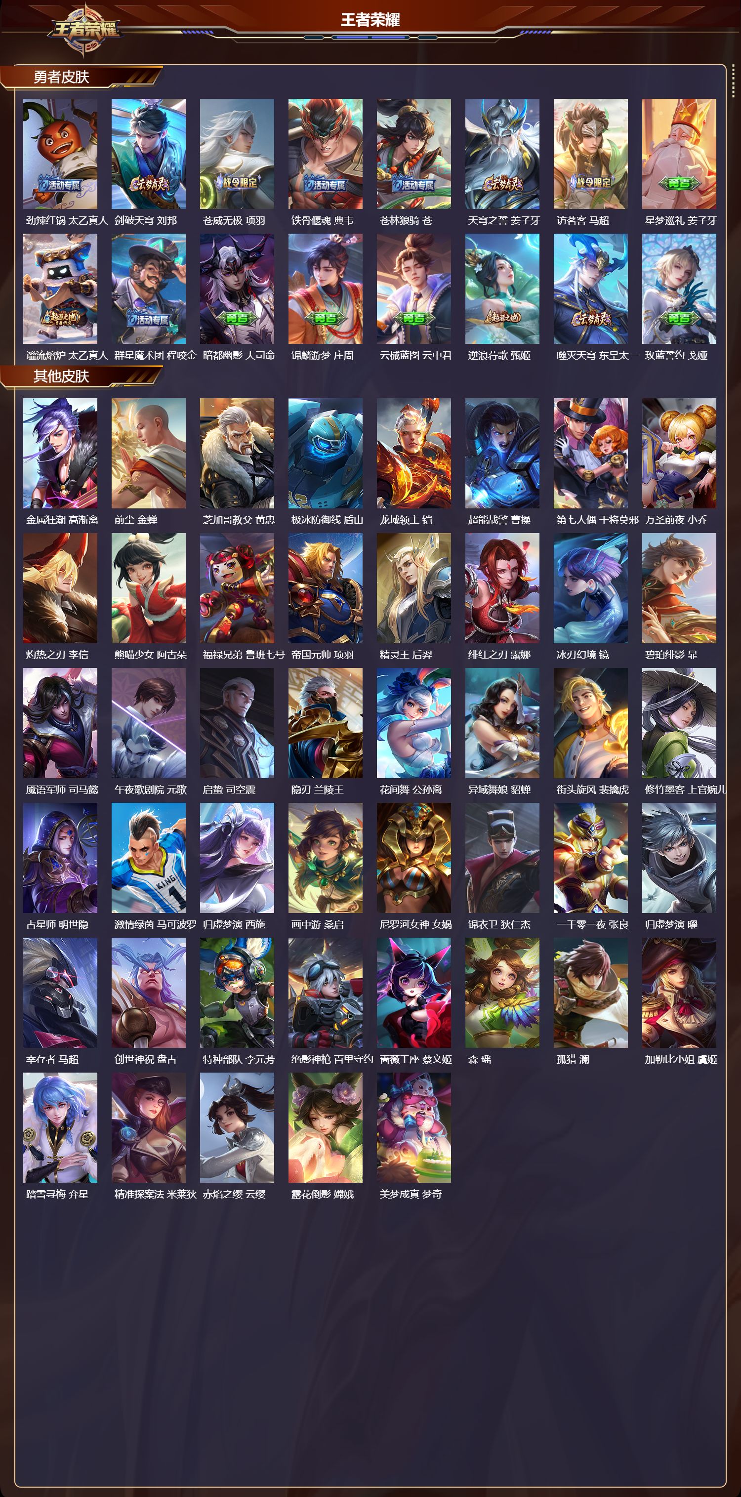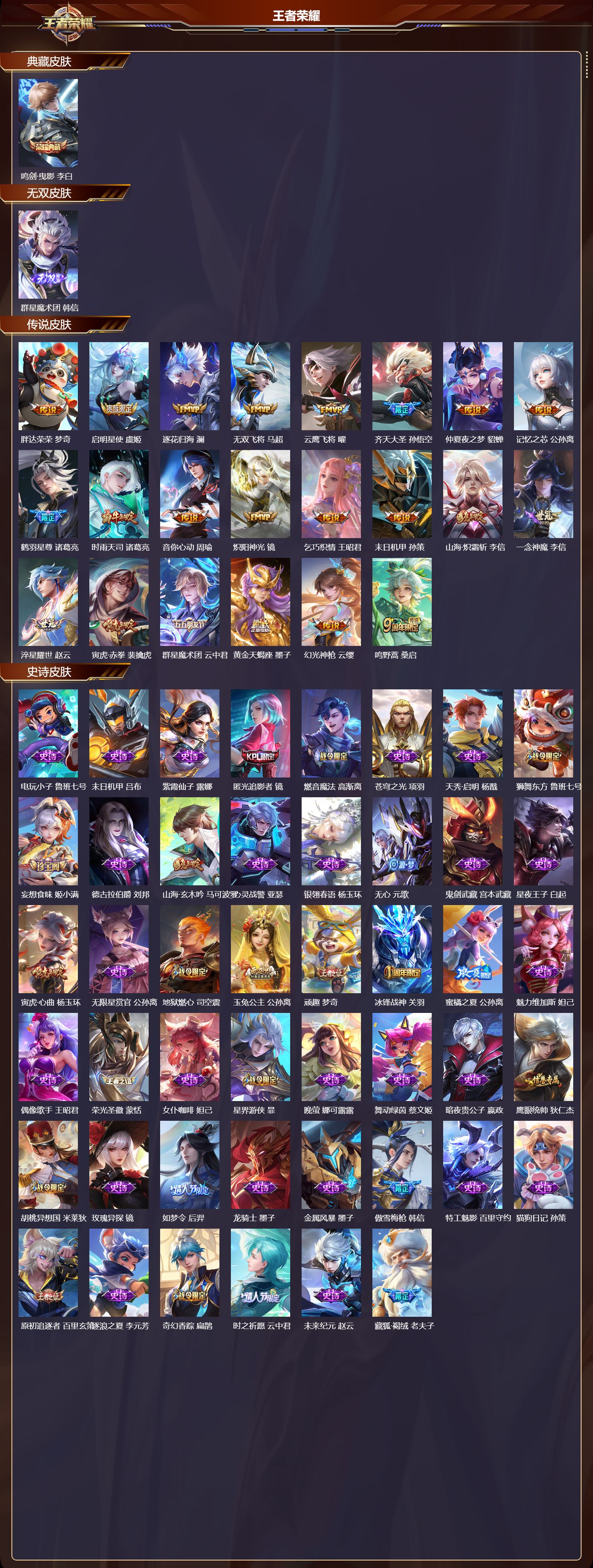 _2115801-q/最强王者/271皮肤/123英雄/1典藏/0珍品无双/1无双/0珍品传说/22传说/92史诗/7稀有英雄 【1典藏皮肤】鸣剑·曳影李白 【1无双皮肤】群星魔术团韩信 【22传说皮肤】胖达荣荣梦奇启明星使虞姬逐花归海澜无双飞将马超云鹰飞将曜齐天大圣孙悟空仲夏夜之梦貂蝉记忆之芯公孙离鹤羽星尊诸葛亮时雨天司诸葛亮音你心动周瑜炽阳神光镜乞巧织情王昭君末日机甲孙策山海·炽霜斩李信一念神魔李信淬星耀世赵云寅虎·赤拳裴擒虎群星魔术团云中君黄金天蝎座墨子幻光神呛云缨鸣野蒿桑启 【92史诗皮肤】电玩小子鲁班七号末日机甲吕布紫霞仙子露娜匿光追影者镜燃音魔法高渐离苍穹之光项羽天秀·启明杨戬狮舞东方鲁班七号妄想食味姬小满德古拉伯爵刘邦山海·玄木吟马可波罗心灵战警亚瑟银翎春语杨玉环无心元歌鬼剑武藏宫本武藏星夜王子白起寅虎·心曲杨玉环无限星赏官公孙离地狱燃心司空震玉兔公主公孙离顽趣梦奇冰锋战神关羽蜜橘之夏公孙离魅力维加斯妲己偶像歌手王昭君荣光圣徽蒙恬女仆咖啡妲己星界游侠暃晚萤娜可露露舞动绿茵蔡文姬暗夜贵公子嬴政鹰眼统帅狄仁杰胡桃异想国米莱狄玫瑰异探镜如梦令后羿龙骑士墨子金属风暴墨子傲雪梅呛韩信特工魅影百里守约猫狗日记孙策原初追逐者百里玄策逐浪之夏李元芳奇幻香踪扁鹊时之祈愿云中君未来纪元赵云藏狐·褐绒老夫子雪豹·霜爪百里守约黎明之约雅典娜鸭鸭历险记刘禅驭风魔法戈娅魔术师狄仁杰热力回旋百里玄策龙之律动狂铁神威马超顽岩魄蒙犽皇家上将赵云冰冠公主雅典娜至尊宝孙悟空功夫厨神程咬金电玩·爆裂旋风刘禅天才门将刘禅水晶猎龙者花木兰山海·碧波行瑶御风骁将吕布圣诞狂欢吕布青焰无极镜魅语不知火舞群星魔术团上官婉儿星界战将牛魔地狱岩魂廉颇茶境仙孙膑蔷薇恋人孙尚香冰雪圆舞曲甄姬火炮绅士黄忠默契交锋花木兰节奏热浪阿轲暗夜猫娘阿轲曙光守护者铠心灵骇客安琪拉匿光破解者沈梦溪箭羽风息伽罗乱世虎臣张飞真我赫兹镜吟游魔法明世隐万物之道弈星缤纷独角兽小乔时之恋人孙尚香水果甜心孙尚香江河有灵阿古朵幽灵船长曹操乘风破浪夏侯惇暗隐猎兽者兰陵王 【110勇者皮肤】玲珑珍味西施太极少年赵怀真星际陆战队达摩沙漠行僧达摩大漠名商沈梦溪缤纷绘卷张良拳王达摩龙舞盛年沈梦溪乐园追猎者白起功夫炙烤廉颇沉稳之力孙尚香幻夜卜梦芈月海盐诗旅桑启幻泉雾影海月归虚梦演孙膑白色死神白起黄金武士典韦阴阳师狄仁杰次元突破哪吒古海寻踪张良戏梦巡演空空儿功夫老勺老夫子西部大镖客牛魔鲨炮海盗猫沈梦溪海滩派对项羽万华元夜狄仁杰演武夺筹程咬金西部游侠莱西奥野性能量吕布哥特玫瑰露娜守护之力大乔无双福将程咬金瓷语鉴心露娜潮玩探月行猪八戒天穹祈灯鬼谷子化身博士扁鹊阿尔法小队后羿五福同心张飞夜都怪侠白起星际陆战队程咬金幻乐之宴鬼谷子虹云星官明世隐救世之瞳扁鹊潮玩骑兵杨戬死亡骑士亚瑟浪漫序章刘备敏锐之力李白破局者亚连玩偶对对碰安琪拉掌控之力诸葛亮海滩丽影钟无艳忍·炎影赵云雪境奇遇西施坚韧之力苏烈唤灵魔甲刘禅擒涛扼浪裴擒虎乓乓大师鲁班大师探海日志鲁班大师天使之翼孙膑雾都夜雨干将莫邪兔女郎花木兰龙腾万里关羽流音漫舞艾琳金庭之子兰陵王千军破阵苏烈零食大作战姬小满花好人间甄姬万象初新宫本武藏潮玩造梦师刘备春野之旅钟无艳秘密基地刘禅教廷特使韩信街头霸王韩信云中旅人李元芳妄想特派李元芳蔬乡物语李元芳少女阿狸妲己灵卜魔法妲己秘证寻踪小乔春野闲踪苏烈布丁狗之约阿古朵暖冬·兔眠嫦娥绒语心约大乔命运加冕露娜小满鸭姬小满幻想奇妙夜王昭君灵野札记张良驱傩正仪钟馗潮玩士官长雅典娜鸭鸭历险记沈梦溪死霸装白起特工战影狂铁虚灵犬护钟馗白执事赵云劲辣红锅太乙真人剑破天穹刘邦苍威无极项羽铁骨偃魂典韦苍林狼骑苍天穹之誓姜子牙访茗客马超星梦巡礼姜子牙谧流熔炉太乙真人群星魔术团程咬金暗都幽影大司命锦麟游梦庄周云械蓝图云中君逆浪荇歌甄姬噬灭天穹东皇太一玫蓝誓约戈娅 【45其他皮肤】金属狂潮高渐离前尘金蝉芝加哥教父黄忠极冰防御线盾山龙域领主铠超能战警曹操第七人偶干将莫邪万圣前夜小乔灼热之刃李信熊喵少女阿古朵福禄兄弟鲁班七号帝国元帅项羽精灵王后羿绯红之刃露娜冰刃幻境镜碧珀绯影暃魇语军师司马懿午夜歌剧院元歌启蛰司空震隐刃兰陵王花间舞公孙离异域舞娘貂蝉街头旋风裴擒虎修竹墨客上官婉儿占星师明世隐激情绿茵马可波罗归虚梦演西施画中游桑启尼罗河女神女娲锦衣卫狄仁杰一千零一夜张良归虚梦演曜幸存者马超创世神祝盘古特种部队李元芳绝影神呛百里守约蔷薇王座蔡文姬森瑶孤猎澜加勒比小姐虞姬踏雪寻梅弈星精准探案法米莱狄赤焰之缨云缨露花倒影嫦娥美梦成真梦奇 【7稀有英雄】不知火舞橘右京夏洛特娜可露露韩信艾琳赵云 营地id:1893026200