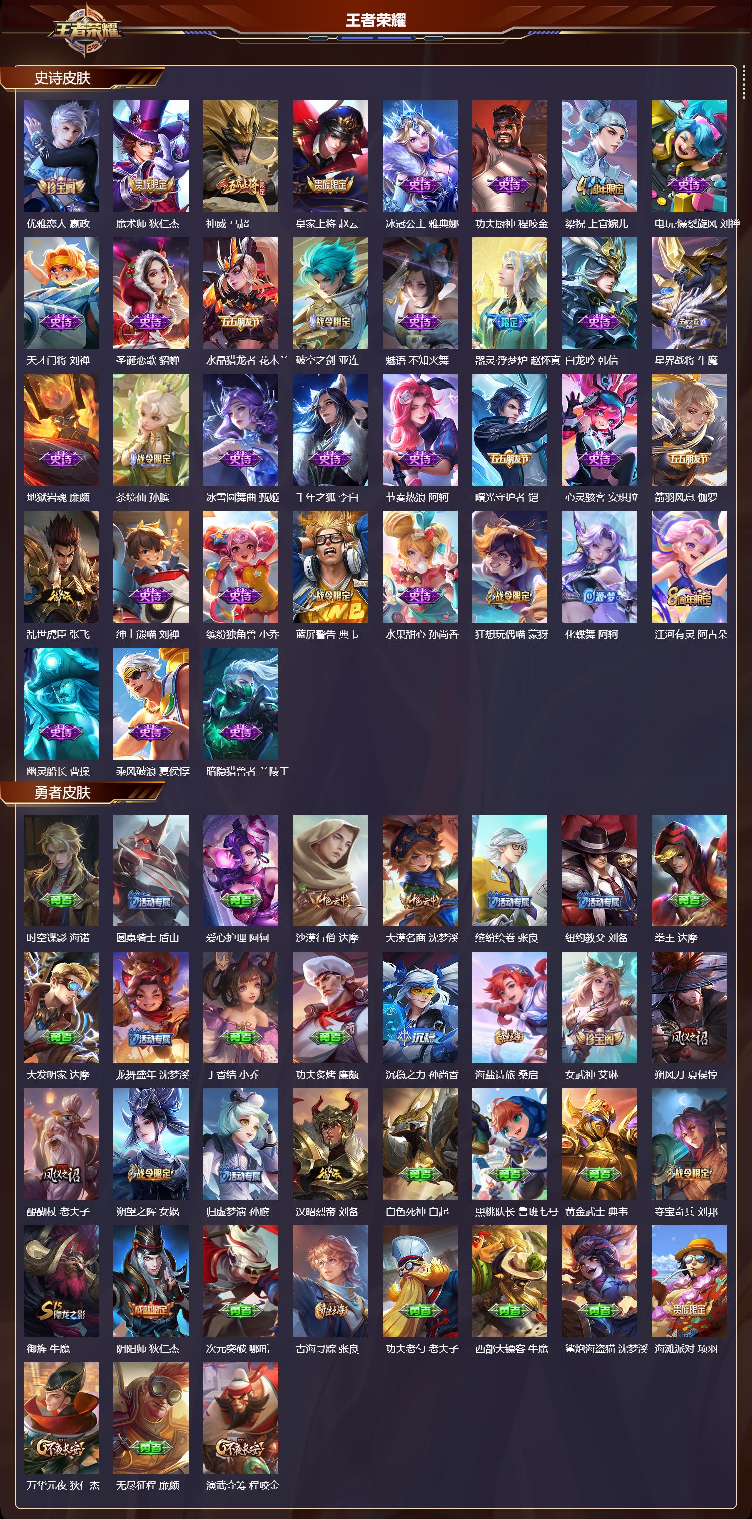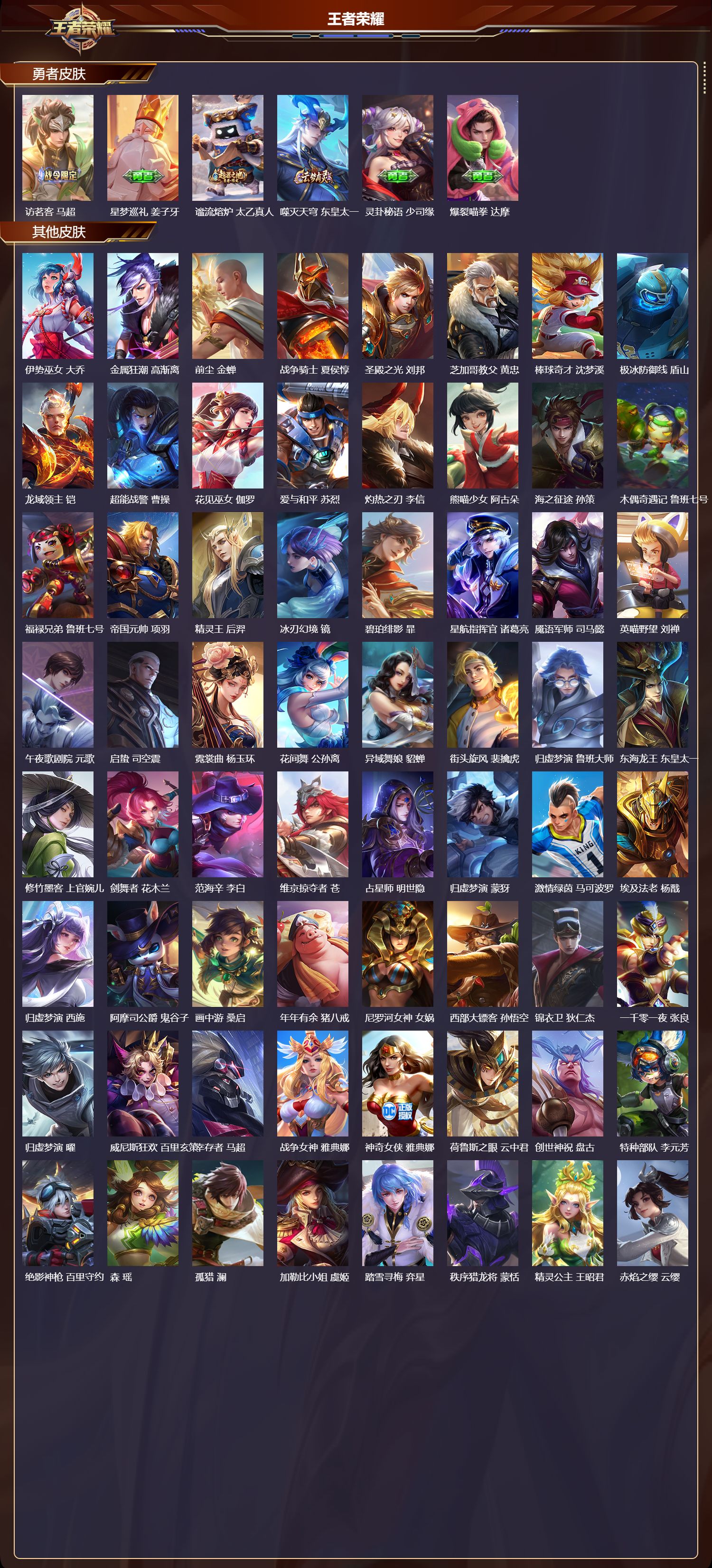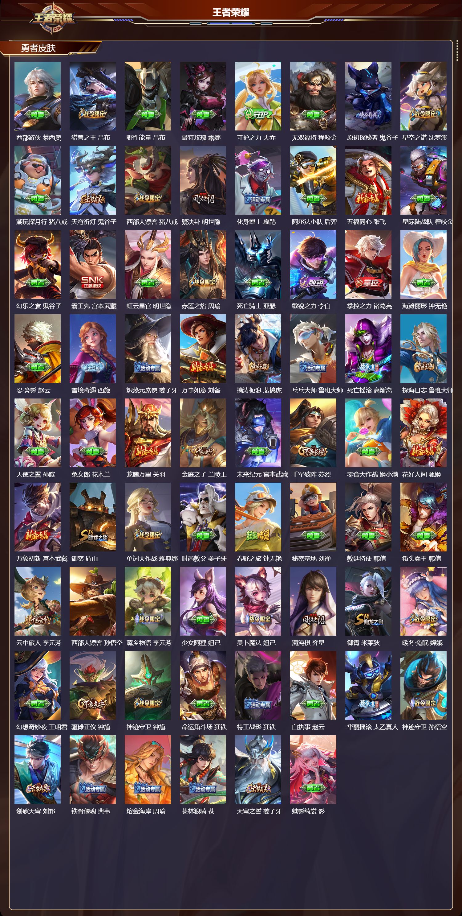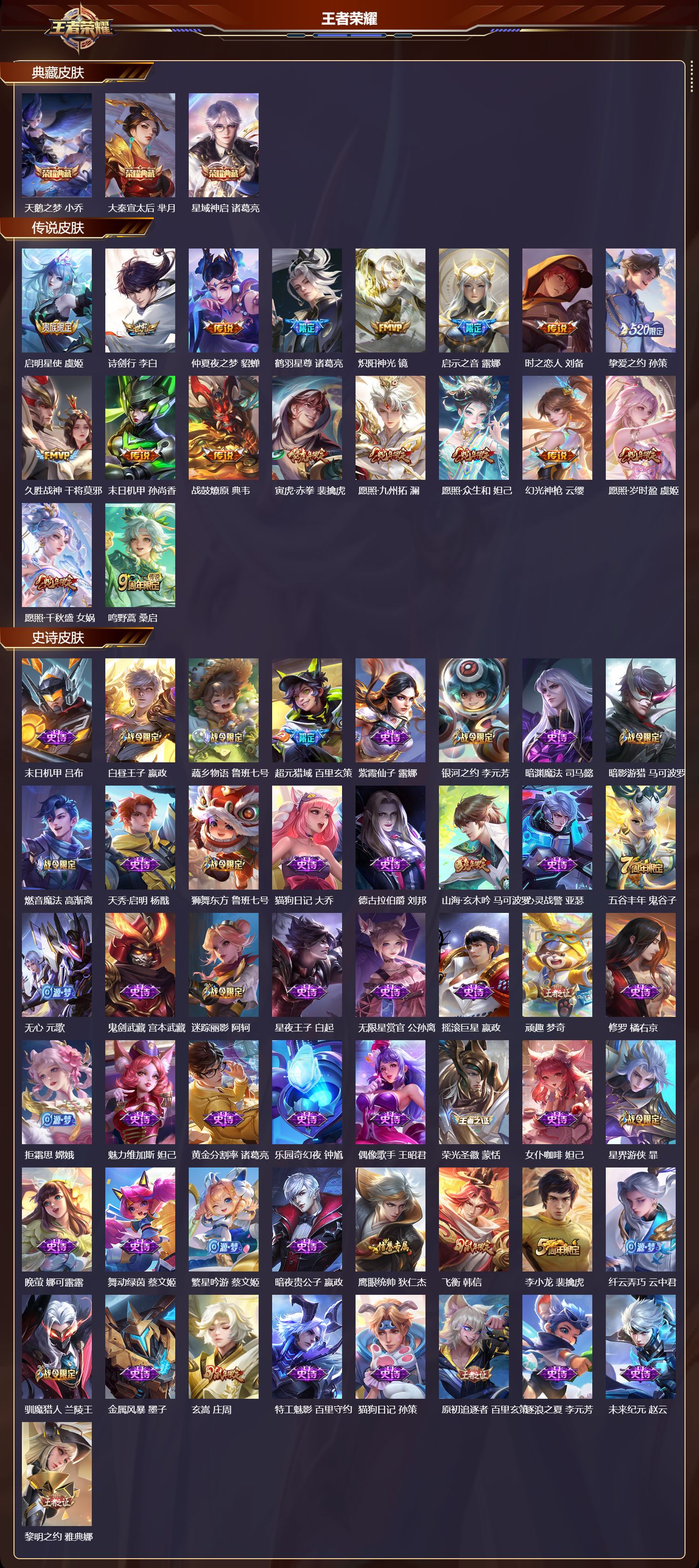 _2115834-q/至尊星耀/284皮肤/123英雄/3典藏/0珍品无双/0无双/0珍品传说/18传说/84史诗/9稀有英雄 【3典藏皮肤】天鹅之梦小乔大秦宣太后芈月星域神启诸葛亮 【18传说皮肤】启明星使虞姬诗剑行李白仲夏夜之梦貂蝉鹤羽星尊诸葛亮炽阳神光镜启示之音露娜时之恋人刘备挚爱之约孙策久胜战神干将莫邪末日机甲孙尚香战鼓燎原典韦寅虎·赤拳裴擒虎愿照·九州拓澜愿照·众生和妲己幻光神呛云缨愿照·岁时盈虞姬愿照·千秋盛女娲鸣野蒿桑启 【84史诗皮肤】末日机甲吕布白昼王子嬴政蔬乡物语鲁班七号超元猎域百里玄策紫霞仙子露娜银河之约李元芳暗渊魔法司马懿暗影游猎马可波罗燃音魔法高渐离天秀·启明杨戬狮舞东方鲁班七号猫狗日记大乔德古拉伯爵刘邦山海·玄木吟马可波罗心灵战警亚瑟五谷丰年鬼谷子无心元歌鬼剑武藏宫本武藏迷踪丽影阿轲星夜王子白起无限星赏官公孙离摇滚巨星嬴政顽趣梦奇修罗橘右京拒霜思嫦娥魅力维加斯妲己黄金分割率诸葛亮乐园奇幻夜钟馗偶像歌手王昭君荣光圣徽蒙恬女仆咖啡妲己星界游侠暃晚萤娜可露露舞动绿茵蔡文姬繁星吟游蔡文姬暗夜贵公子嬴政鹰眼统帅狄仁杰飞衡韩信李小龙裴擒虎纤云弄巧云中君驯魔猎人兰陵王金属风暴墨子玄嵩庄周特工魅影百里守约猫狗日记孙策原初追逐者百里玄策逐浪之夏李元芳未来纪元赵云黎明之约雅典娜优雅恋人嬴政魔术师狄仁杰神威马超皇家上将赵云冰冠公主雅典娜功夫厨神程咬金梁祝上官婉儿电玩·爆裂旋风刘禅天才门将刘禅圣诞恋歌貂蝉水晶猎龙者花木兰破空之剑亚连魅语不知火舞器灵·浮梦炉赵怀真白龙吟韩信星界战将牛魔地狱岩魂廉颇茶境仙孙膑冰雪圆舞曲甄姬千年之狐李白节奏热浪阿轲曙光守护者铠心灵骇客安琪拉箭羽风息伽罗乱世虎臣张飞绅士熊喵刘禅缤纷独角兽小乔蓝屏警告典韦水果甜心孙尚香狂想玩偶喵蒙犽化蝶舞阿轲江河有灵阿古朵幽灵船长曹操乘风破浪夏侯惇暗隐猎兽者兰陵王 【111勇者皮肤】时空谍影海诺圆桌骑士盾山爱心护理阿轲沙漠行僧达摩大漠名商沈梦溪缤纷绘卷张良纽约教父刘备拳王达摩大发明家达摩龙舞盛年沈梦溪丁香结小乔功夫炙烤廉颇沉稳之力孙尚香海盐诗旅桑启女武神艾琳朔风刀夏侯惇醍醐杖老夫子朔望之晖女娲归虚梦演孙膑汉昭烈帝刘备白色死神白起黑桃队长鲁班七号黄金武士典韦夺宝奇兵刘邦御旌牛魔阴阳师狄仁杰次元突破哪吒古海寻踪张良功夫老勺老夫子西部大镖客牛魔鲨炮海盗猫沈梦溪海滩派对项羽万华元夜狄仁杰无尽征程廉颇演武夺筹程咬金西部游侠莱西奥猎兽之王吕布野性能量吕布哥特玫瑰露娜守护之力大乔无双福将程咬金原初探秘者鬼谷子星空之诺沈梦溪潮玩探月行猪八戒天穹祈灯鬼谷子西部大镖客猪八戒疑决卦明世隐化身博士扁鹊阿尔法小队后羿五福同心张飞星际陆战队程咬金幻乐之宴鬼谷子霸王丸宫本武藏虹云星官明世隐赤莲之焰周瑜死亡骑士亚瑟敏锐之力李白掌控之力诸葛亮海滩丽影钟无艳忍·炎影赵云雪境奇遇西施炽热元素使姜子牙万事如意刘备擒涛扼浪裴擒虎乓乓大师鲁班大师死亡摇滚高渐离探海日志鲁班大师天使之翼孙膑兔女郎花木兰龙腾万里关羽金庭之子兰陵王未来纪元宫本武藏千军破阵苏烈零食大作战姬小满花好人间甄姬万象初新宫本武藏御銮盾山单词大作战雅典娜时尚教父姜子牙春野之旅钟无艳秘密基地刘禅教廷特使韩信街头霸王韩信云中旅人李元芳西部大镖客孙悟空蔬乡物语李元芳少女阿狸妲己灵卜魔法妲己混沌棋弈星御霄米莱狄暖冬·兔眠嫦娥幻想奇妙夜王昭君驱傩正仪钟馗神迹守卫钟馗命运角斗场狂铁特工战影狂铁白执事赵云华丽摇滚太乙真人神迹守卫孙悟空剑破天穹刘邦铁骨偃魂典韦熔金海岸周瑜苍林狼骑苍天穹之誓姜子牙魅影绮裳影访茗客马超星梦巡礼姜子牙谧流熔炉太乙真人噬灭天穹东皇太一灵卦秘语少司缘爆裂喵拳达摩 【69其他皮肤】伊势巫女大乔金属狂潮高渐离前尘金蝉战争骑士夏侯惇圣殿之光刘邦芝加哥教父黄忠棒球奇才沈梦溪极冰防御线盾山龙域领主铠超能战警曹操花见巫女伽罗爱与和平苏烈灼热之刃李信熊喵少女阿古朵海之征途孙策木偶奇遇记鲁班七号福禄兄弟鲁班七号帝国元帅项羽精灵王后羿冰刃幻境镜碧珀绯影暃星航指挥官诸葛亮魇语军师司马懿英喵野望刘禅午夜歌剧院元歌启蛰司空震霓裳曲杨玉环花间舞公孙离异域舞娘貂蝉街头旋风裴擒虎归虚梦演鲁班大师东海龙王东皇太一修竹墨客上官婉儿剑舞者花木兰范海辛李白维京掠夺者苍占星师明世隐归虚梦演蒙犽激情绿茵马可波罗埃及法老杨戬归虚梦演西施阿摩司公爵鬼谷子画中游桑启年年有余猪八戒尼罗河女神女娲西部大镖客孙悟空锦衣卫狄仁杰一千零一夜张良归虚梦演曜威尼斯狂欢百里玄策幸存者马超战争女神雅典娜神奇女侠雅典娜荷鲁斯之眼云中君创世神祝盘古特种部队李元芳绝影神呛百里守约森瑶孤猎澜加勒比小姐虞姬踏雪寻梅弈星秩序猎龙将蒙恬精灵公主王昭君赤焰之缨云缨露花倒影嫦娥地府判官钟馗美梦成真梦奇天启骑士关羽圆桌骑士太乙真人 【9稀有英雄】敖隐嬴政不知火舞橘右京夏洛特娜可露露韩信艾琳赵云 营地id:535006702