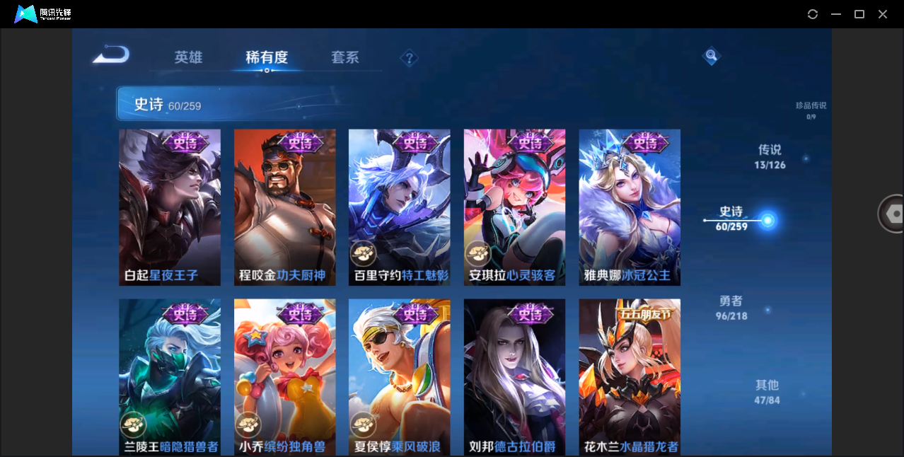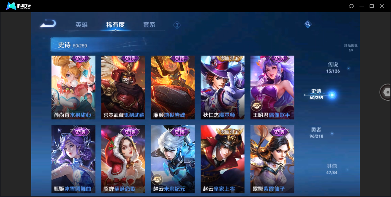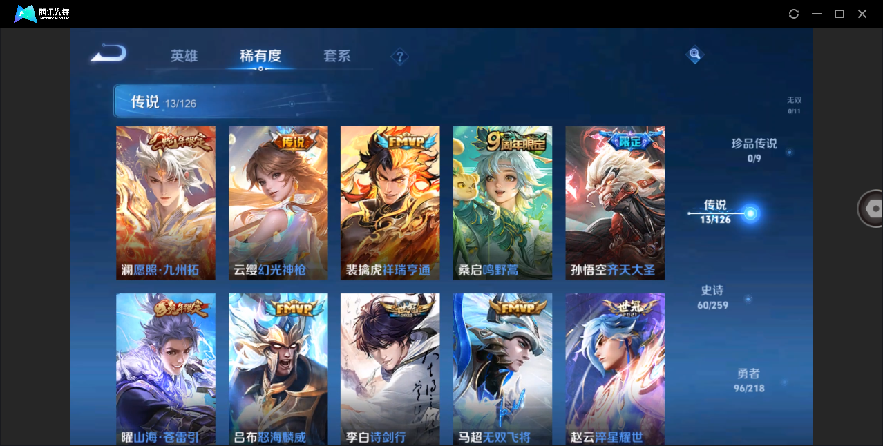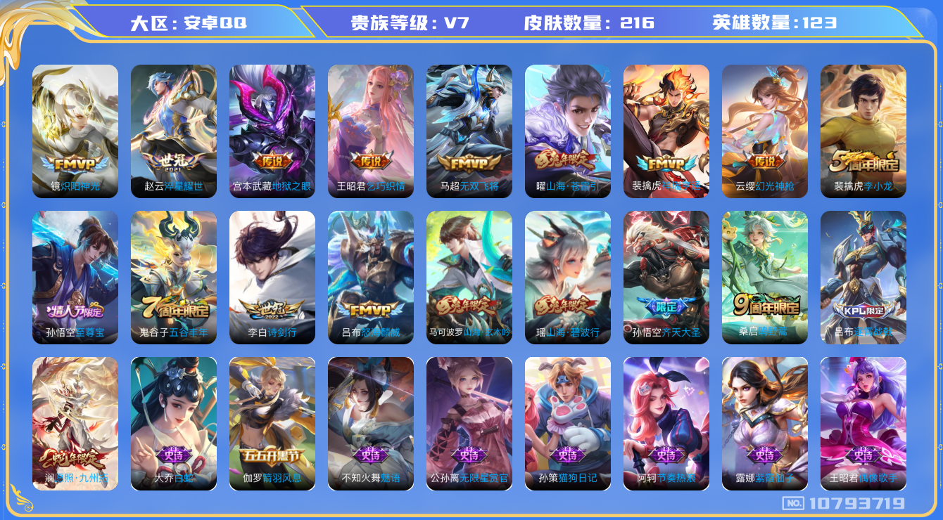 [10793719]实名: 可修改 贵族等级: v7 英雄数: 123 皮肤数: 216 传说皮: 炽阳神光地狱之眼乞巧织情淬星耀世无双飞将山海·苍雷引幻光神呛祥瑞亨通 限定皮: 李小龙至尊宝五谷丰年诗剑行怒海麟威山海·玄木吟山海·碧波行齐天大圣鸣野蒿逐霄战戟愿照·九州拓 亮点: 精品号 澜蛇限 多fmvp 李白世冠 赵云世冠!!!