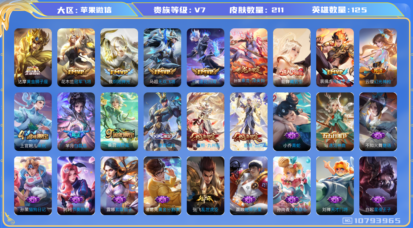 [10793965]【商品标题lj1644 12w小国镜,1.5w金标马超,1.4w金标木兰,1.1w金标裴擒虎,1.1w金标澜,打野64段对抗路53段,小帅号,208皮】:苹果wx-v7-最强王者段位-125英雄-211皮肤-0典藏-0珍品无双-0无双-0珍品传说-12传说-53史诗 【内测皮肤】:艾琳女武神,狂铁特工战影 【传说皮肤】:花木兰冠军飞将,达摩黄金狮子座,镜炽阳神光,马超无双飞将,澜逐花归海,孙策乘龙淬吴钩,貂蝉曦玄引,桑启鸣野蒿,裴擒虎祥瑞亨通,云缨幻光神呛,澜愿照九州拓,司空震愿照山河定 【限定皮肤】:姜子牙天穹之誓,狄仁杰阴阳师,赵云皇家上将,芈月白晶晶,芈月幻夜卜梦,吕布猎兽之王,元歌无心,夏侯惇朔风刀,狄仁杰魔术师,狄仁杰万华元夜,达摩沙漠行僧,项羽海滩派对,程咬金演武夺筹,王昭君午后时光,兰陵王金庭之子,李元芳云中旅人,钟馗驱傩正仪,雅典娜黎明之约,黄忠火炮绅士,苏烈千军破阵,百里玄策原初追逐者,弈星混沌棋,梦奇顽趣,沈梦溪大漠名商,裴擒虎擒涛扼浪,狂铁电玩高手,上官婉儿梁祝,鲁班大师探海日志,桑启海盐诗旅,艾琳女武神,张良古海寻踪,蒙恬荣光圣徽,高渐离燃音魔法,妲己灵卜魔法,鬼谷子天穹祈灯,姬小满妄想食味,孙策乘龙淬吴钩,貂蝉曦玄引,沈梦溪龙舞盛年,刘邦剑破天穹,镜青焰无极,项羽苍威无极,周瑜熔金海岸 【年限皮肤】:孙策乘龙淬吴钩 【赛季限定】:夏侯惇朔风刀,狄仁杰万华元夜,达摩沙漠行僧,程咬金演武夺筹,兰陵王金庭之子,张良古海寻踪,李元芳云中旅人,钟馗驱傩正仪,雅典娜黎明之约,苏烈千军破阵,百里玄策原初追逐者,弈星混沌棋,梦奇顽趣,沈梦溪大漠名商,裴擒虎擒涛扼浪,鲁班大师探海日志,桑启海盐诗旅,鬼谷子天穹祈灯,蒙恬荣光圣徽,刘邦剑破天穹,姜子牙天穹之誓 【战令限定】:芈月幻夜卜梦,吕布猎兽之王,王昭君午后时光,黄忠火炮绅士,狂铁电玩高手,高渐离燃音魔法,妲己灵卜魔法,镜青焰无极,项羽苍威无极 【史诗皮肤】:露娜紫霞仙子,赵云皇家上将,貂蝉圣诞恋歌,狄仁杰魔术师,廉颇地狱岩魂,宫本武藏鬼剑武藏,孙尚香水果甜心,嬴政暗夜贵公子,嬴政摇滚巨星,妲己魅力维加斯,墨子金属风暴,吕布圣诞狂欢,曹操幽灵船长,李白千年之狐,张飞乱世虎臣,花木兰水晶猎龙者,刘邦德古拉伯爵,兰陵王暗隐猎兽者,诸葛亮黄金分割率,铠曙光守护者,刘禅天才门将,白起星夜王子,阿轲节奏热浪,孙策