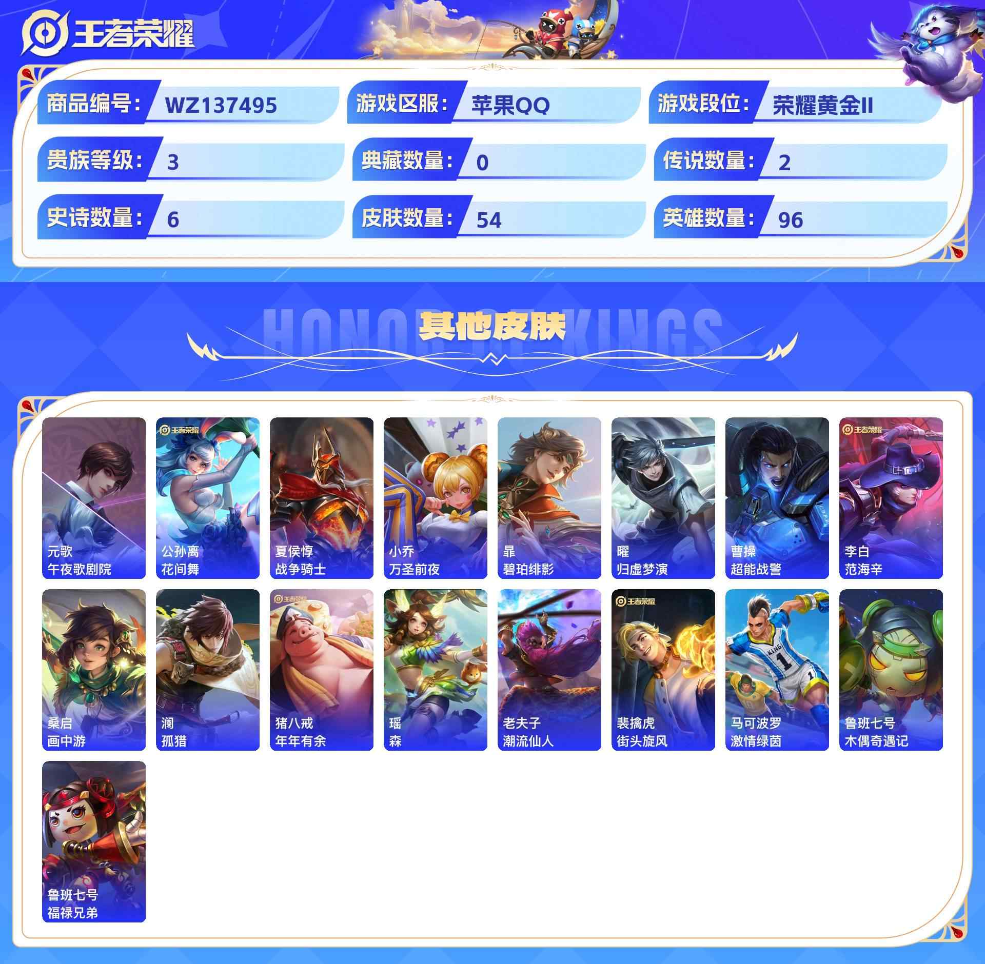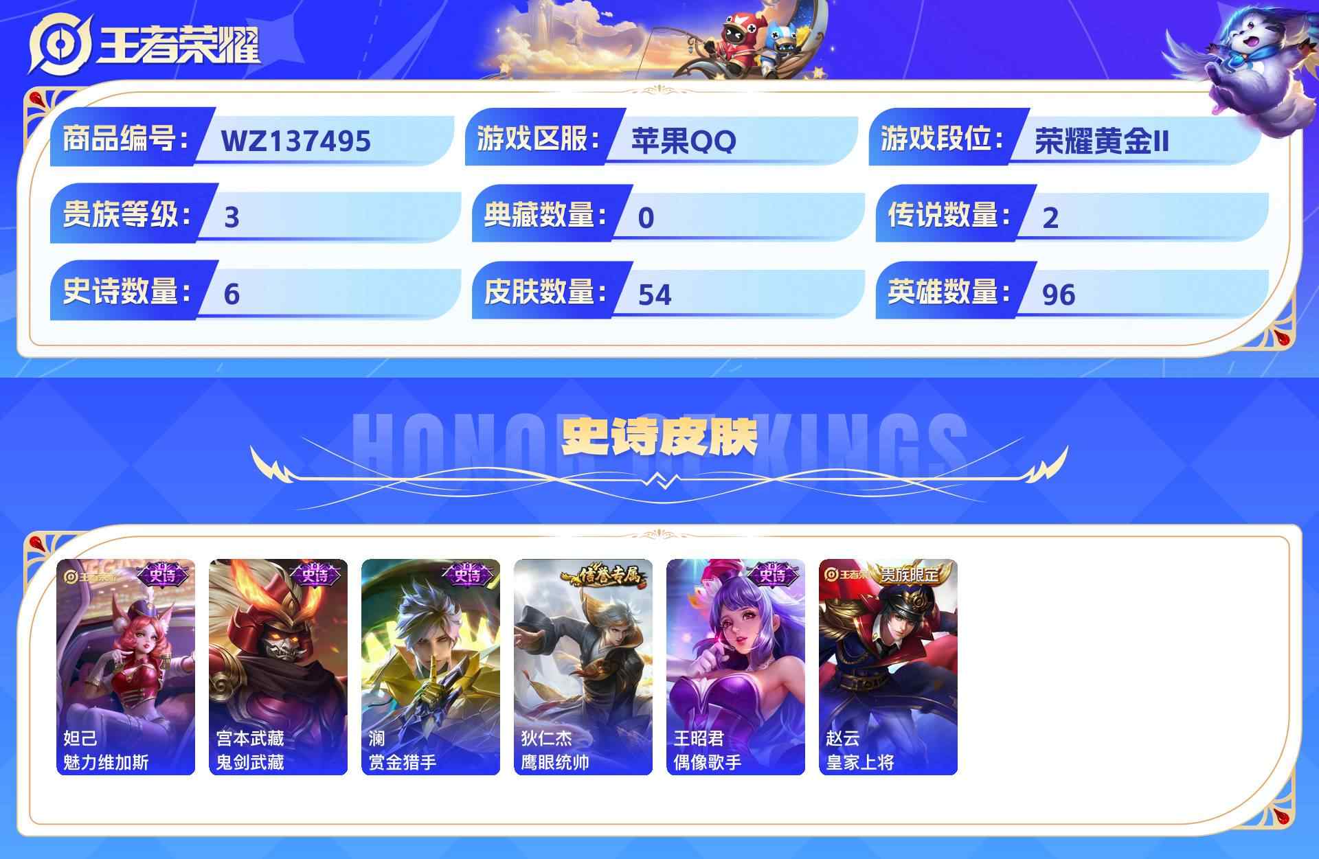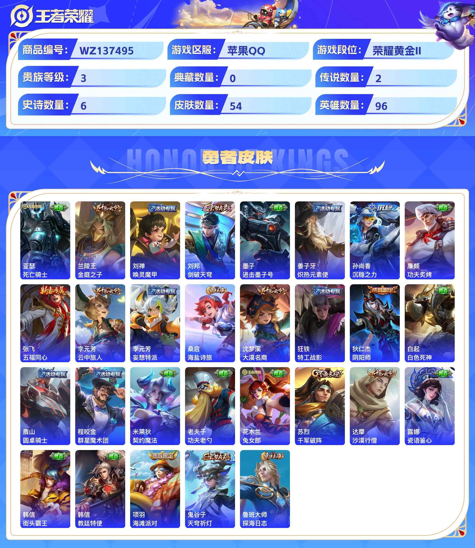 wz137495|苹果qq 54皮 贵族5级 2传说 6史诗 可二次