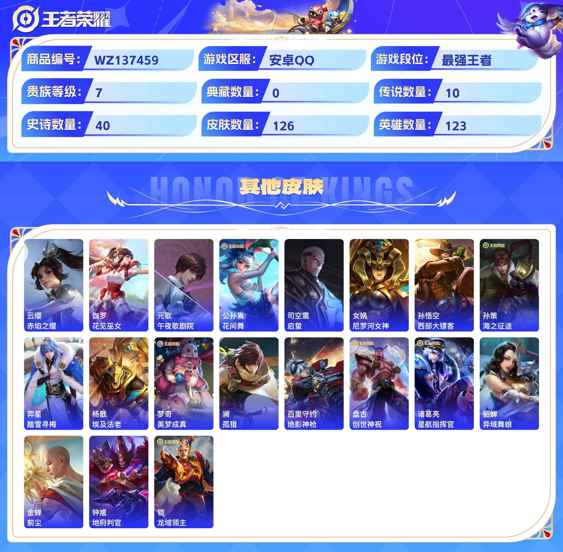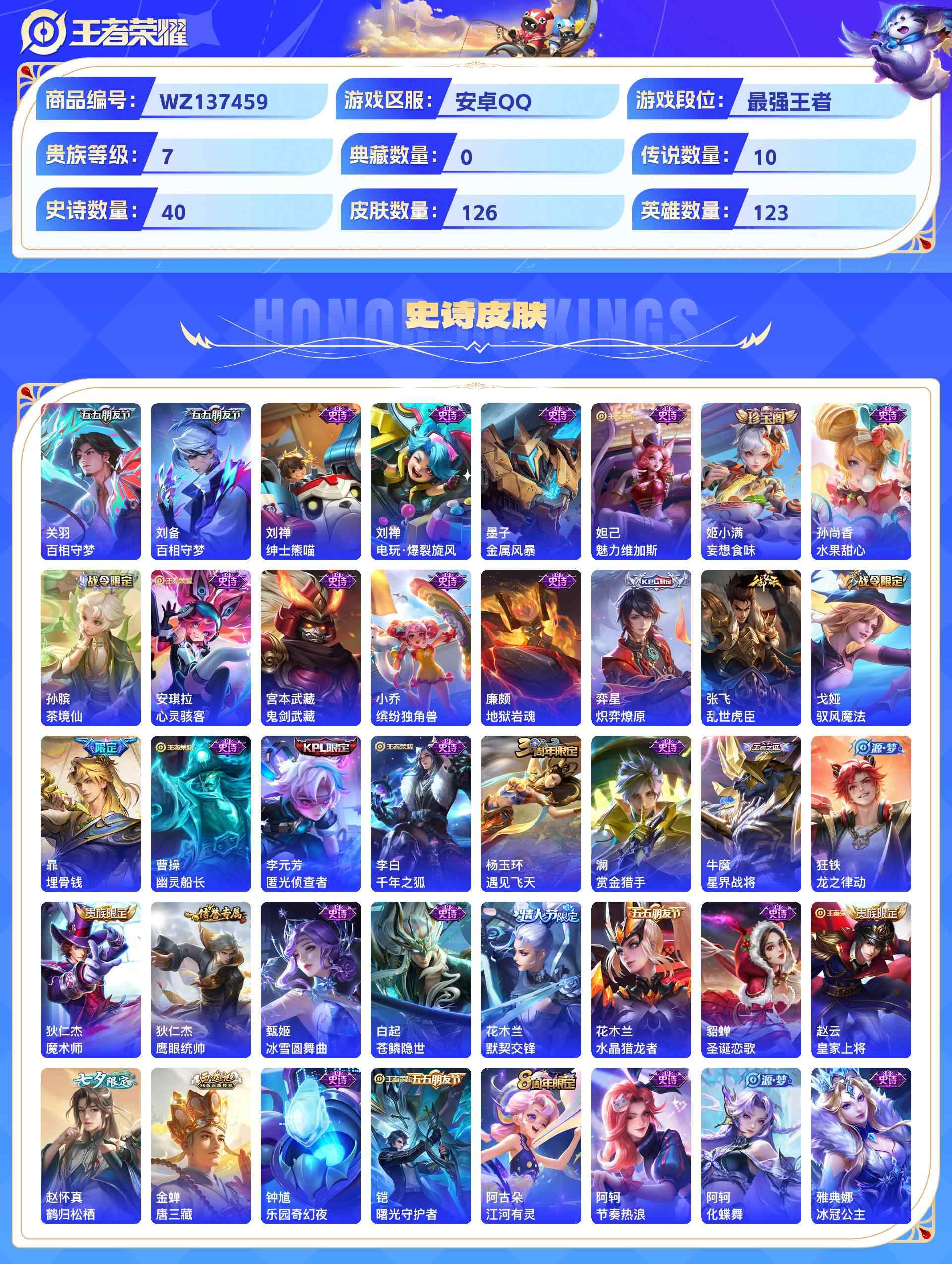 wz137459|安卓qq 126皮 贵族7级 10传说 40史诗 7个性按键 1天幕 可二次