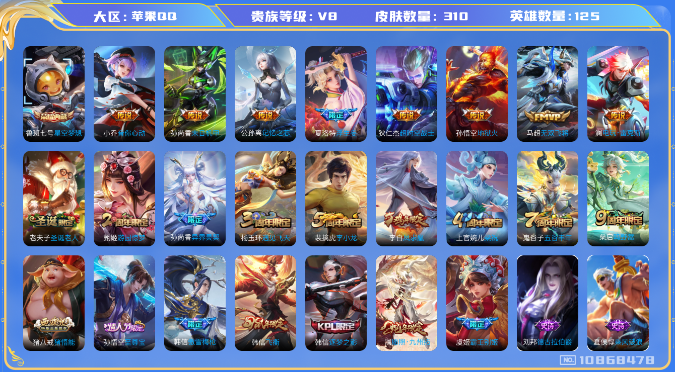[10868478]v8 1典藏 13传说 125英雄 310皮肤 可修改实名 优质装备:星空梦想太空人末日机甲-孙尚香绿蚂蚱地狱火音你心动-小乔超时空战士-狄仁杰无双飞将浮生妄记忆之芯机甲兔电玩·雷克斯 珍宝阁皮:优雅恋人女武神 限定皮:愿照·九州拓澜年限鸣野蒿至尊宝凤求凰白切鸡异界灵契白毛香傲雪梅呛飞衡韩信年限遇见飞天五谷丰年游园惊梦梁祝李小龙逐梦之影霸王别姬-虞姬圣诞老人猪悟能 史诗皮:龙之律动石田雨龙百相守梦-黄忠戍鼓铭心蒙犽顽岩魄百相守梦-周瑜遇见神鹿紫霞仙子黄金分割率特工魅影千年之狐电玩·兔顽号江河有灵百解令蒙犽冰冠公主偶像歌手晚萤电玩·爆裂旋风暗夜猫娘末日机甲-吕布猫狗日记-孙策时之恋人-孙尚香乱世虎臣节奏热浪女仆咖啡摇滚巨星水果甜心绅士熊喵星夜王子心灵骇客功夫厨神德古拉伯爵暗隐猎兽者幽灵船长鬼剑武藏心灵战警舞动绿茵地狱岩魂缤纷独角兽乘风破浪逐浪之夏水晶猎龙者曙光守护者金属风暴原初追逐者圣诞狂欢圣诞恋歌鹰眼统帅魅力维加斯黎明之约赏金猎手无心未来纪元-赵云