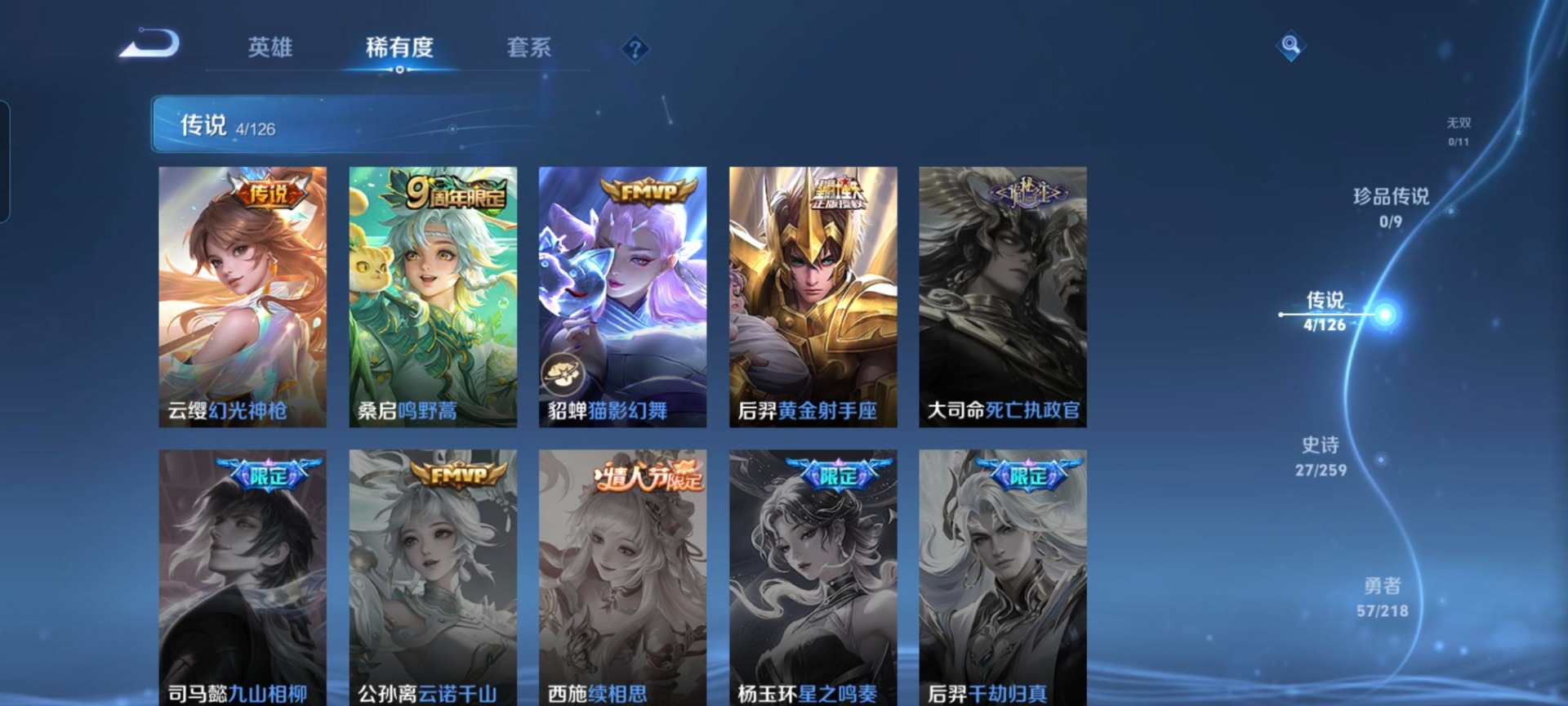 v5 4传说 109英雄 111皮肤 可修改实名 优质装备:黄金射手座猫影幻舞 传说皮:幻光神呛 珍宝阁皮:优雅恋人 限定皮:鸣野蒿至尊宝遇见飞天五谷丰年李小龙 史诗皮:遇见神鹿紫霞仙子偶像歌手时之恋人-孙尚香节奏热浪女仆咖啡水果甜心心灵骇客德古拉伯爵纤云弄巧繁星吟游