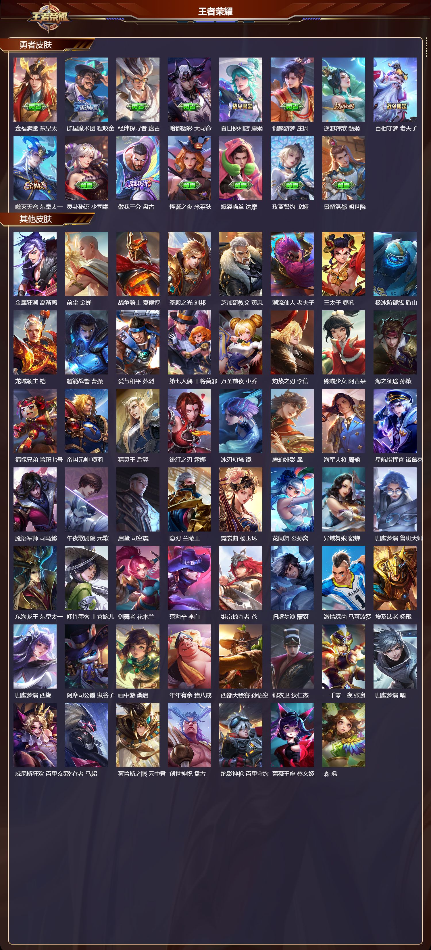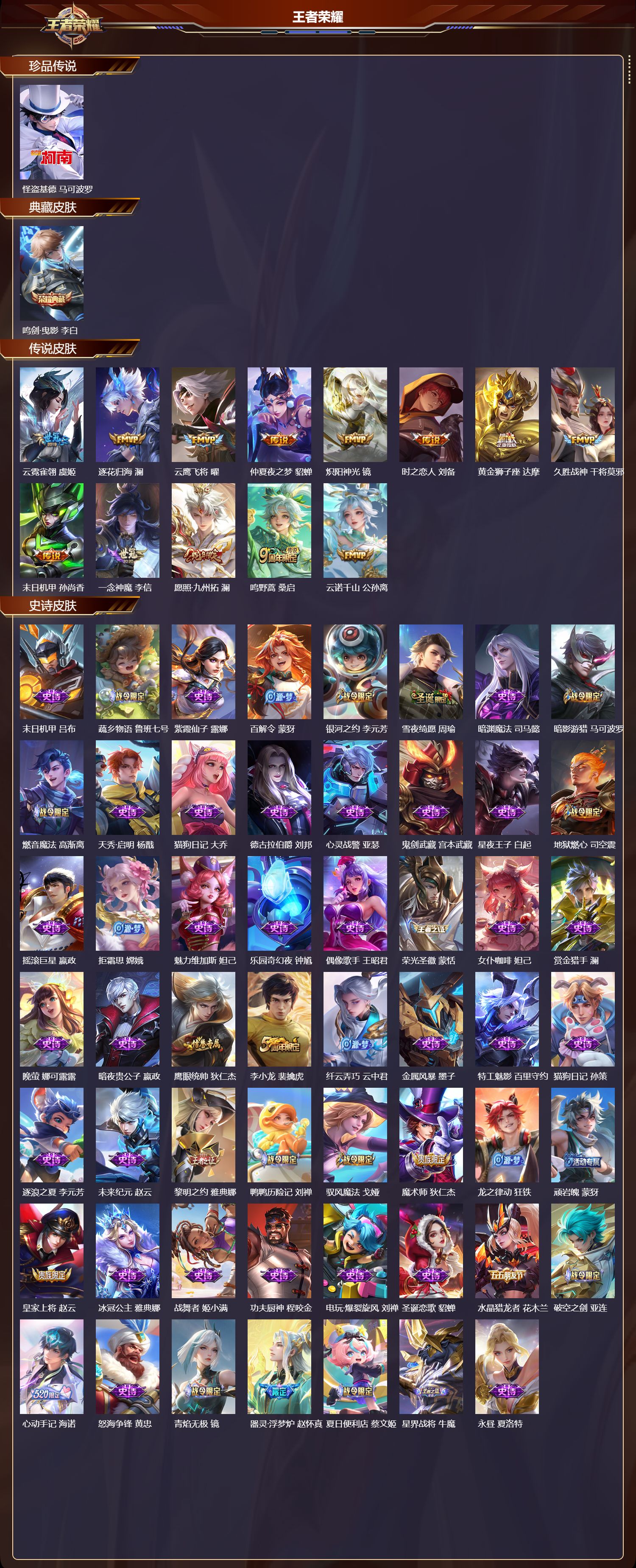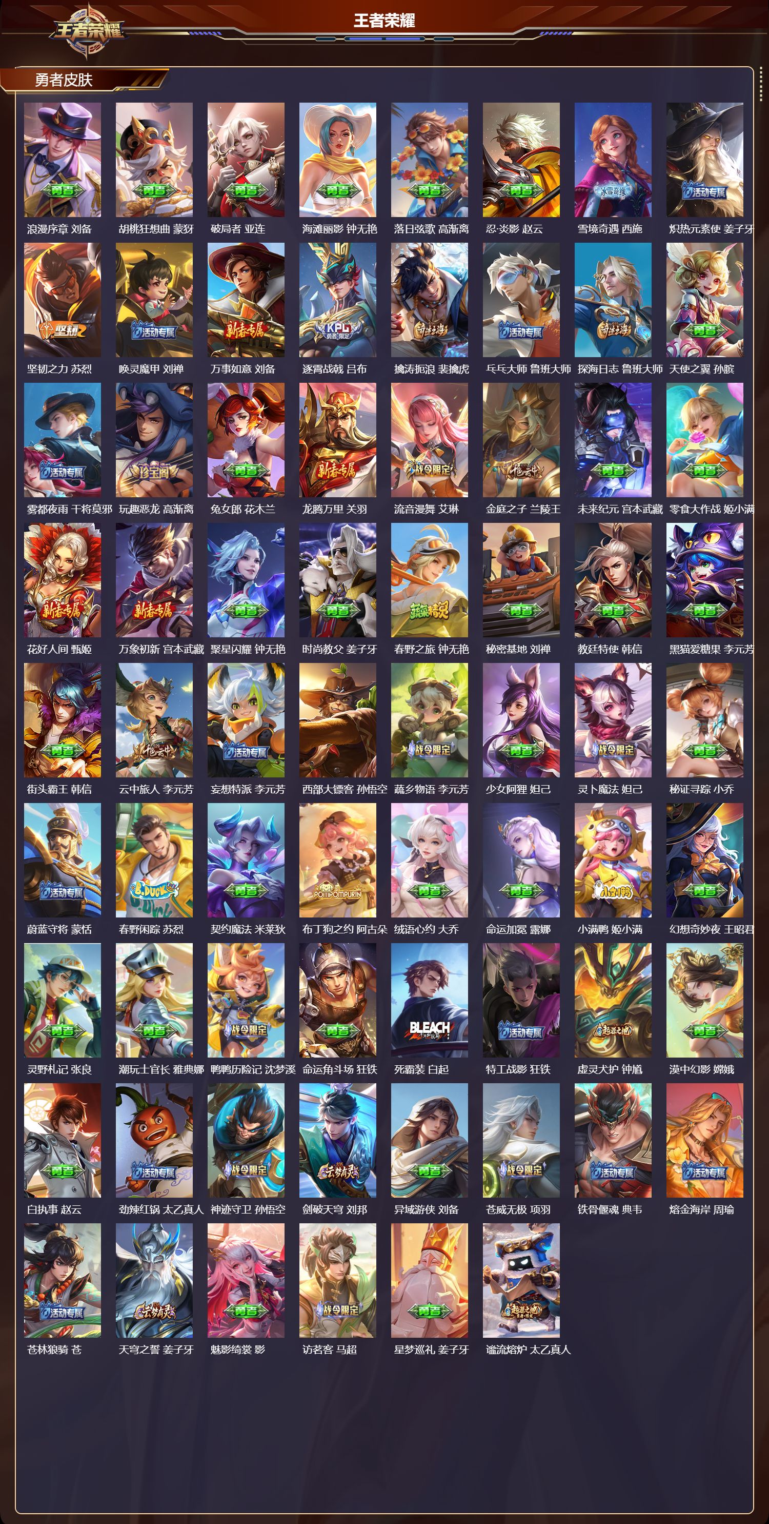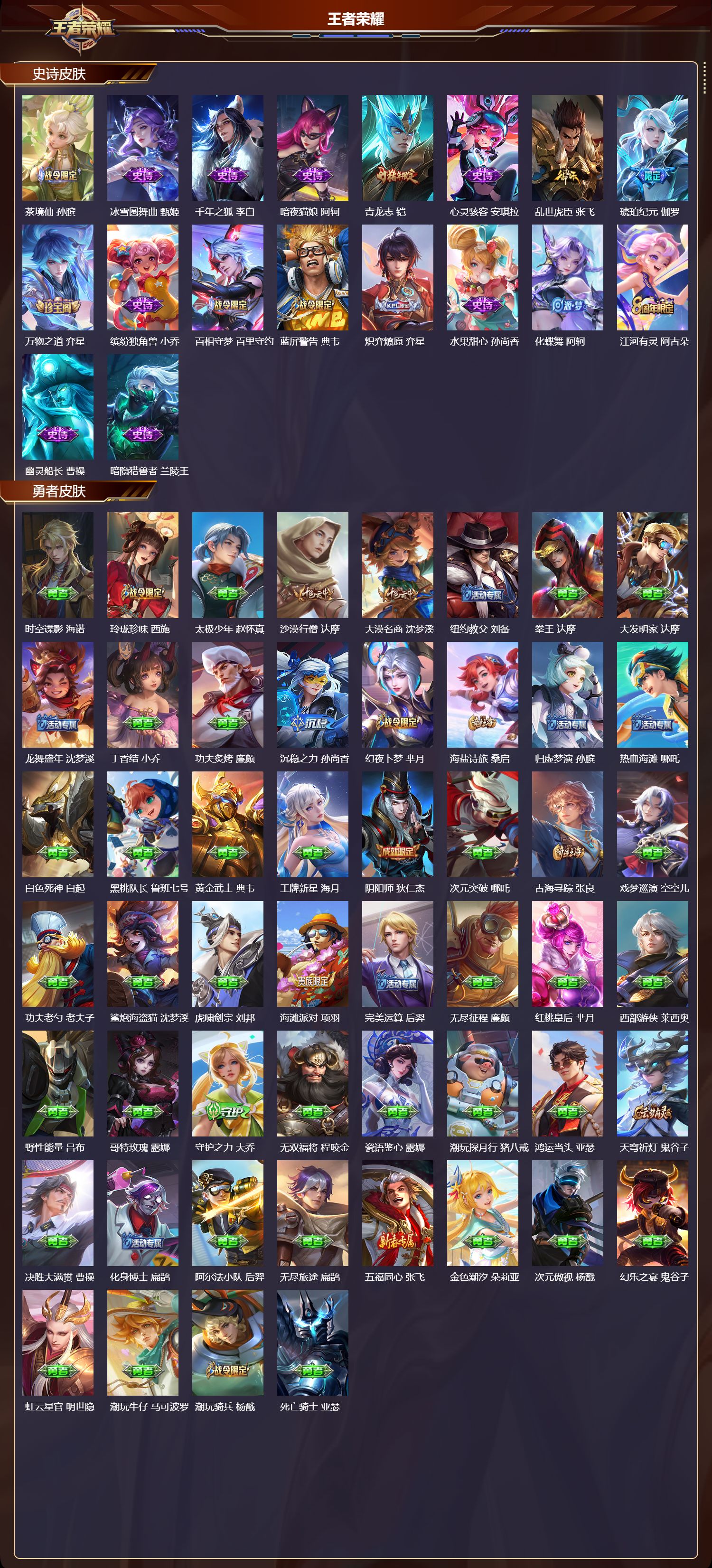 _2131343-q/绝世王者/288皮肤/125英雄/1典藏/0珍品无双/0无双/1珍品传说/13传说/73史诗/9稀有英雄 【1珍品传说】怪盗基德马可波罗 【1典藏皮肤】鸣剑·曳影李白 【13传说皮肤】云霓雀翎虞姬逐花归海澜云鹰飞将曜仲夏夜之梦貂蝉炽阳神光镜时之恋人刘备黄金狮子座达摩久胜战神干将莫邪末日机甲孙尚香一念神魔李信愿照·九州拓澜鸣野蒿桑启云诺千山公孙离 【73史诗皮肤】末日机甲吕布蔬乡物语鲁班七号紫霞仙子露娜百解令蒙犽银河之约李元芳雪夜绮愿周瑜暗渊魔法司马懿暗影游猎马可波罗燃音魔法高渐离天秀·启明杨戬猫狗日记大乔德古拉伯爵刘邦心灵战警亚瑟鬼剑武藏宫本武藏星夜王子白起地狱燃心司空震摇滚巨星嬴政拒霜思嫦娥魅力维加斯妲己乐园奇幻夜钟馗偶像歌手王昭君荣光圣徽蒙恬女仆咖啡妲己赏金猎手澜晚萤娜可露露暗夜贵公子嬴政鹰眼统帅狄仁杰李小龙裴擒虎纤云弄巧云中君金属风暴墨子特工魅影百里守约猫狗日记孙策逐浪之夏李元芳未来纪元赵云黎明之约雅典娜鸭鸭历险记刘禅驭风魔法戈娅魔术师狄仁杰龙之律动狂铁顽岩魄蒙犽皇家上将赵云冰冠公主雅典娜战舞者姬小满功夫厨神程咬金电玩·爆裂旋风刘禅圣诞恋歌貂蝉水晶猎龙者花木兰破空之剑亚连心动手记海诺怒海争锋黄忠青焰无极镜器灵·浮梦炉赵怀真夏日便利店蔡文姬星界战将牛魔永昼夏洛特茶境仙孙膑冰雪圆舞曲甄姬千年之狐李白暗夜猫娘阿轲青龙志铠心灵骇客安琪拉乱世虎臣张飞琥珀纪元伽罗万物之道弈星缤纷独角兽小乔百相守梦百里守约蓝屏警告典韦炽弈燎原弈星水果甜心孙尚香化蝶舞阿轲江河有灵阿古朵幽灵船长曹操暗隐猎兽者兰陵王 【137勇者皮肤】时空谍影海诺玲珑珍味西施太极少年赵怀真沙漠行僧达摩大漠名商沈梦溪纽约教父刘备拳王达摩大发明家达摩龙舞盛年沈梦溪丁香结小乔功夫炙烤廉颇沉稳之力孙尚香幻夜卜梦芈月海盐诗旅桑启归虚梦演孙膑热血海滩哪吒白色死神白起黑桃队长鲁班七号黄金武士典韦王牌新星海月阴阳师狄仁杰次元突破哪吒古海寻踪张良戏梦巡演空空儿功夫老勺老夫子鲨炮海盗猫沈梦溪虎啸剑宗刘邦海滩派对项羽完美运算后羿无尽征程廉颇红桃皇后芈月西部游侠莱西奥野性能量吕布哥特玫瑰露娜守护之力大乔无双福将程咬金瓷语鉴心露娜潮玩探月行猪八戒鸿运当头亚瑟天穹祈灯鬼谷子决胜大满贯曹操化身博士扁鹊阿尔法小队后羿无尽旅途扁鹊五福同心张飞金色潮汐朵莉亚次元傲视杨戬幻乐之宴鬼谷子虹云星官明世隐潮玩牛仔马可波罗潮玩骑兵杨戬死亡骑士亚瑟浪漫序章刘备胡桃狂想曲蒙犽破局者亚连海滩丽影钟无艳落日弦歌高渐离忍·炎影赵云雪境奇遇西施炽热元素使姜子牙坚韧之力苏烈唤灵魔甲刘禅万事如意刘备逐霄战戟吕布擒涛扼浪裴擒虎乓乓大师鲁班大师探海日志鲁班大师天使之翼孙膑雾都夜雨干将莫邪玩趣恶龙高渐离兔女郎花木兰龙腾万里关羽流音漫舞艾琳金庭之子兰陵王未来纪元宫本武藏零食大作战姬小满花好人间甄姬万象初新宫本武藏聚星闪耀钟无艳时尚教父姜子牙春野之旅钟无艳秘密基地刘禅教廷特使韩信黑猫爱糖果李元芳街头霸王韩信云中旅人李元芳妄想特派李元芳西部大镖客孙悟空蔬乡物语李元芳少女阿狸妲己灵卜魔法妲己秘证寻踪小乔蔚蓝守将蒙恬春野闲踪苏烈契约魔法米莱狄布丁狗之约阿古朵绒语心约大乔命运加冕露娜小满鸭姬小满幻想奇妙夜王昭君灵野札记张良潮玩士官长雅典娜鸭鸭历险记沈梦溪命运角斗场狂铁死霸装白起特工战影狂铁虚灵犬护钟馗漠中幻影嫦娥白执事赵云劲辣红锅太乙真人神迹守卫孙悟空剑破天穹刘邦异域游侠刘备苍威无极项羽铁骨偃魂典韦熔金海岸周瑜苍林狼骑苍天穹之誓姜子牙魅影绮裳影访茗客马超星梦巡礼姜子牙谧流熔炉太乙真人金福满堂东皇太一群星魔术团程咬金经纬探寻者盘古暗都幽影大司命夏日便利店虞姬锦麟游梦庄周逆浪荇歌甄姬百相守梦老夫子噬灭天穹东皇太一灵卦秘语少司缘敬我三分盘古怪诞之夜米莱狄爆裂喵拳达摩玫蓝誓约戈娅景韶洛都明世隐 【64其他皮肤】金属狂潮高渐离前尘金蝉战争骑士夏侯惇圣殿之光刘邦芝加哥教父黄忠潮流仙人老夫子三太子哪吒极冰防御线盾山龙域领主铠超能战警曹操爱与和平苏烈第七人偶干将莫邪万圣前夜小乔灼热之刃李信熊喵少女阿古朵海之征途孙策福禄兄弟鲁班七号帝国元帅项羽精灵王后羿绯红之刃露娜冰刃幻境镜碧珀绯影暃海军大将周瑜星航指挥官诸葛亮魇语军师司马懿午夜歌剧院元歌启蛰司空震隐刃兰陵王霓裳曲杨玉环花间舞公孙离异域舞娘貂蝉归虚梦演鲁班大师东海龙王东皇太一修竹墨客上官婉儿剑舞者花木兰范海辛李白维京掠夺者苍归虚梦演蒙犽激情绿茵马可波罗埃及法老杨戬归虚梦演西施阿摩司公爵鬼谷子画中游桑启年年有余猪八戒西部大镖客孙悟空锦衣卫狄仁杰一千零一夜张良归虚梦演曜威尼斯狂欢百里玄策幸存者马超荷鲁斯之眼云中君创世神祝盘古绝影神呛百里守约蔷薇王座蔡文姬森瑶孤猎澜踏雪寻梅弈星秩序猎龙将蒙恬精准探案法米莱狄精灵公主王昭君赤焰之缨云缨露花倒影嫦娥地府判官钟馗怪盗基德马可波罗 【9稀有英雄】敖隐嬴政不知火舞橘右京夏洛特娜可露露韩信艾琳赵云 营地id: