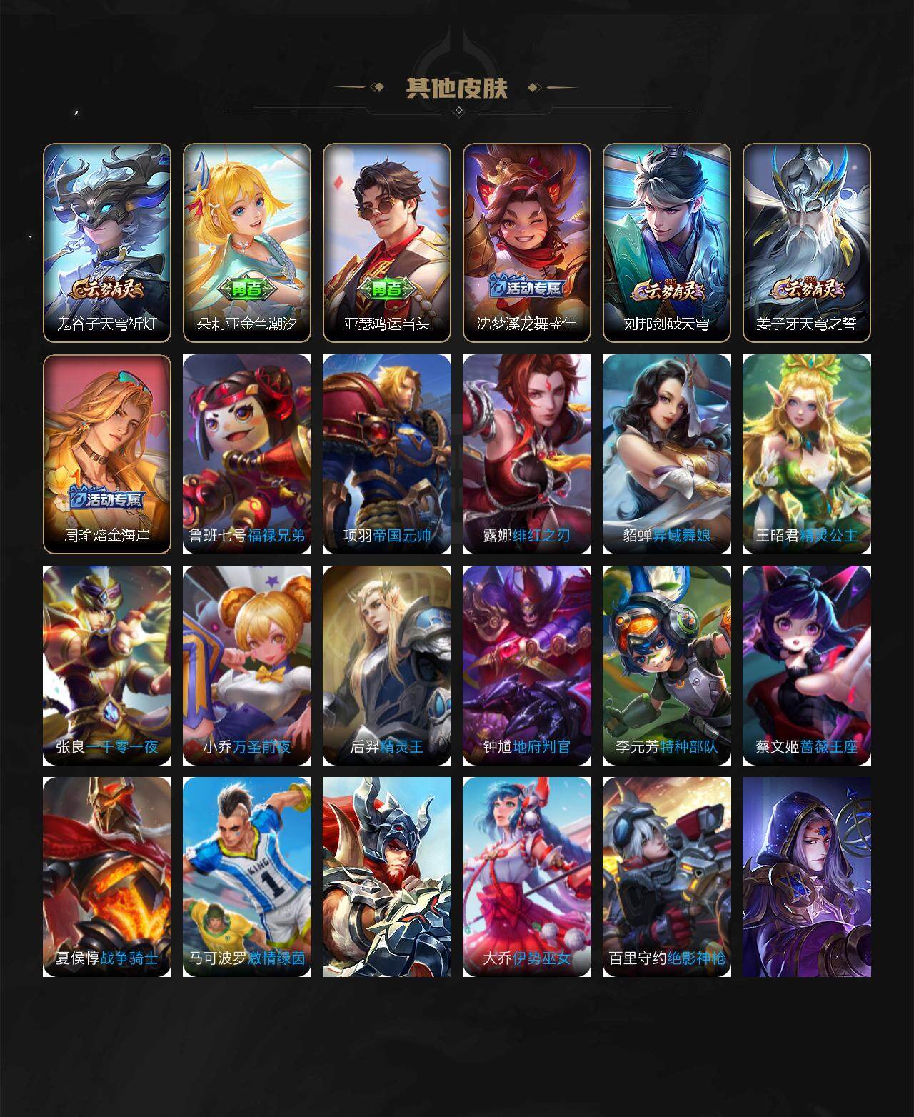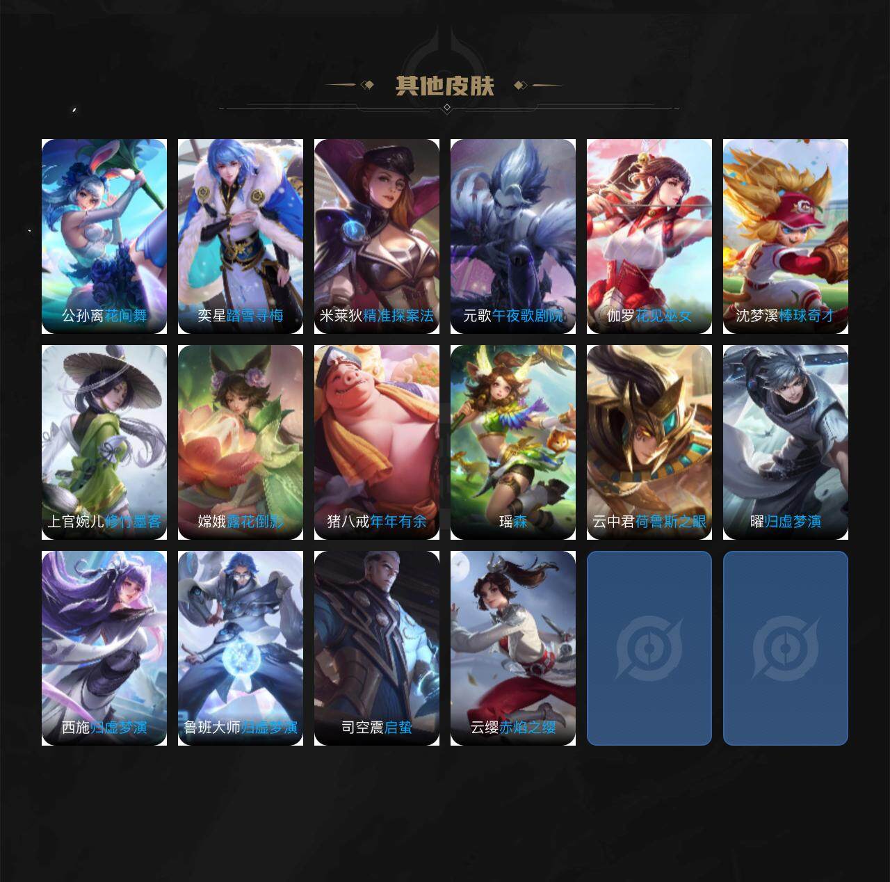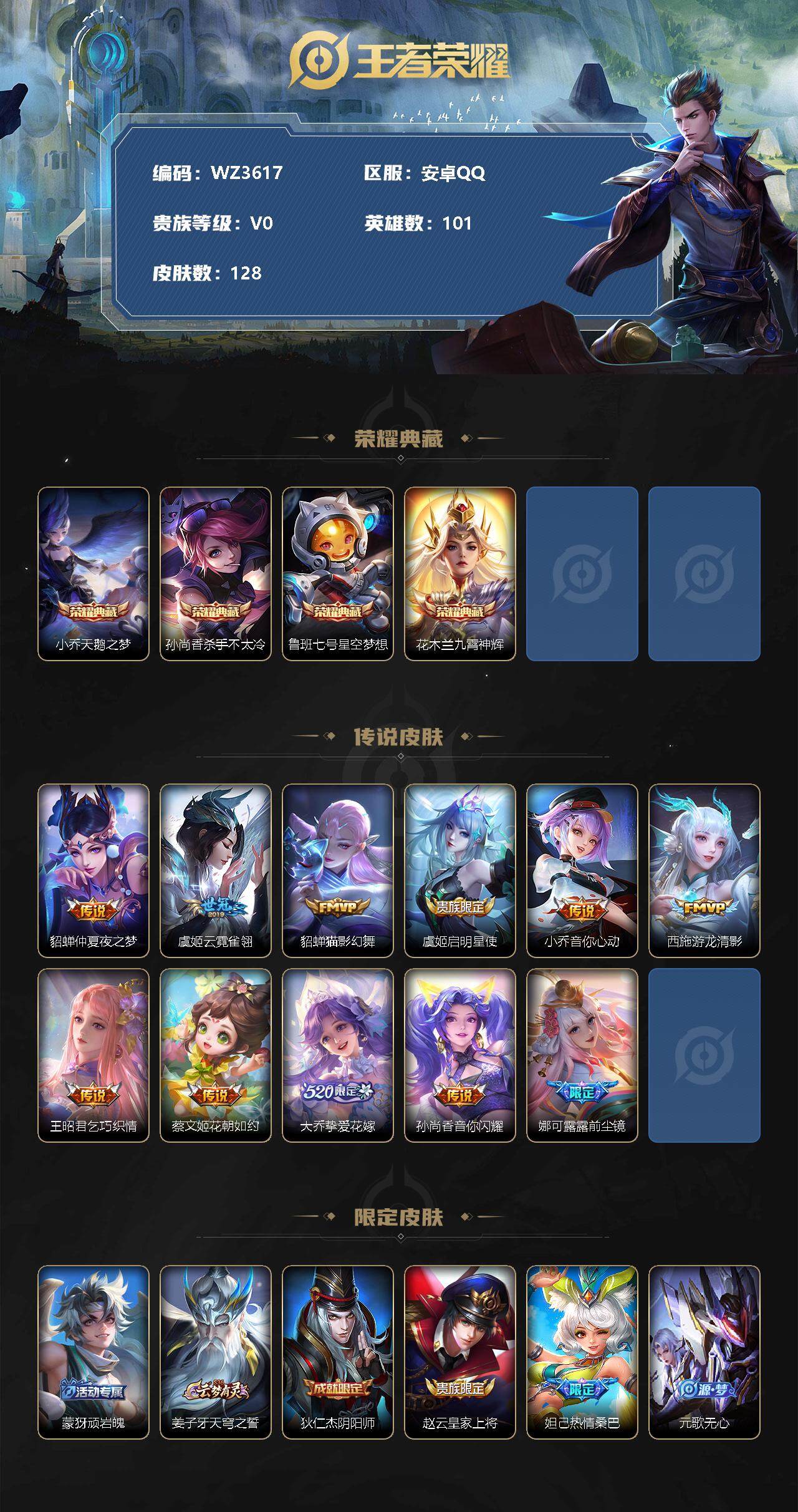 【女号】至尊星耀iv段位-101英雄-128皮肤-4典藏-0珍品无双-0无双-0珍品传说-11传说-31史诗 【荣耀典藏】:小乔天鹅之梦,孙尚香杀手不太冷,鲁班七号星空梦想,花木兰九霄神辉 【传说皮肤】:貂蝉仲夏夜之梦,虞姬云霓雀翎,貂蝉猫影幻舞,虞姬启明星使,小乔音你心动,西施游龙清影,王昭君乞巧织情,蔡文姬花朝如约,大乔挚爱花嫁,孙尚香音你闪耀,娜可露露前尘镜 【限定皮肤】:蒙犽顽岩魄,姜子牙天穹之誓,狄仁杰阴阳师,赵云皇家上将,妲己热情桑巴,元歌无心,狄仁杰魔术师,达摩沙漠行僧,项羽海滩派对,王昭君午后时光,兰陵王金庭之子,娜可露露前尘镜,李元芳云中旅人,虞姬启明星使,鬼谷子五谷丰年,大乔挚爱花嫁,沈梦溪大漠名商,裴擒虎擒涛扼浪,狂铁电玩高手,鲁班大师探海日志,桑启海盐诗旅,鬼谷子天穹祈灯,沈梦溪龙舞盛年,刘邦剑破天穹,周瑜熔金海岸 【赛季限定】:达摩沙漠行僧,兰陵王金庭之子,李元芳云中旅人,沈梦溪大漠名商,裴擒虎擒涛扼浪,鲁班大师探海日志,桑启海盐诗旅,鬼谷子天穹祈灯,刘邦剑破天穹,姜子牙天穹之誓 【战令限定】:王昭君午后时光,狂铁电玩高手 【史诗皮肤】:露娜紫霞仙子,赵云皇家上将,貂蝉圣诞恋歌,狄仁杰魔术师,孙尚香水果甜心,妲己魅力维加斯,妲己女仆咖啡,吕布圣诞狂欢,刘禅绅士熊喵,妲己热情桑巴,雅典娜冰冠公主,安琪拉心灵骇客,蔡文姬舞动绿茵,刘禅天才门将,李元芳逐浪之夏,阿轲节奏热浪,孙策猫狗日记,大乔猫狗日记,伽罗箭羽风息,狄仁杰鹰眼统帅,大乔白蛇,小乔青蛇,瑶遇见神鹿,西施诗语江南,安琪拉时之奇旅,貂蝉唤灵魅影,狂铁电玩高手,鬼谷子五谷丰年,元歌无心,蒙犽顽岩魄,姬小满战舞者 【其他皮肤】:项羽海滩派对,韩信教廷特使,韩信街头霸王,露娜哥特玫瑰,阿轲爱心护理,赵云忍炎影,芈月红桃皇后,牛魔西部大镖客,扁鹊化身博士,安琪拉玩偶对对碰,妲己少女阿狸,典韦黄金武士,亚瑟死亡骑士,达摩拳王,花木兰兔女郎,宫本武藏万象初新,后羿阿尔法小队,狄仁杰阴阳师,刘备汉昭烈帝,李元芳黑猫爱糖果,王昭君幻想奇妙夜,孙尚香沉稳之力,诸葛亮掌控之力,大乔守护之力,小乔丁香结,吕布野性能量,孙膑归虚梦演,盾山圆桌骑士,鲁班大师乓乓大师,达摩沙漠行僧,程咬金无双福将,兰陵王金庭之子,王昭君午后时光,沈梦溪大漠名商,蒙犽胡桃狂想曲,李元芳云中旅人,戈娅危途狂花,桑启海盐诗旅,海月幻泉雾影,裴擒虎擒涛扼浪,鲁班大师探海日志,李元芳妄想特派,鬼谷子天穹祈灯,朵莉亚金色潮汐,亚瑟鸿运当头,沈梦溪龙舞盛年,刘邦剑破天穹,姜子牙天穹之誓,周瑜熔金海岸,鲁班七号福禄兄弟,项羽帝国元帅,露娜绯红之刃,貂蝉异域舞娘,王昭君精灵公主,张良一千零一夜,小乔万圣前夜,后羿精灵王,钟馗地府判官,李元芳特种部队,蔡文姬蔷薇王座,夏侯惇战争骑士,马可波罗激情绿茵,苍维京掠夺者,大乔伊势巫女,百里守约绝影神呛,明世隐占星师,公孙离花间舞,弈星踏雪寻梅,米莱狄精准探案法,元歌午夜歌剧院,伽罗花见巫女,沈梦溪棒球奇才,上官婉儿修竹墨客,嫦娥露花倒影,猪八戒年年有余,瑶森,云中君荷鲁斯之眼,曜归虚梦演,西施归虚梦演,鲁班大师归虚梦演,司空震启蛰,云缨赤焰之缨 【营地id】:1756110525