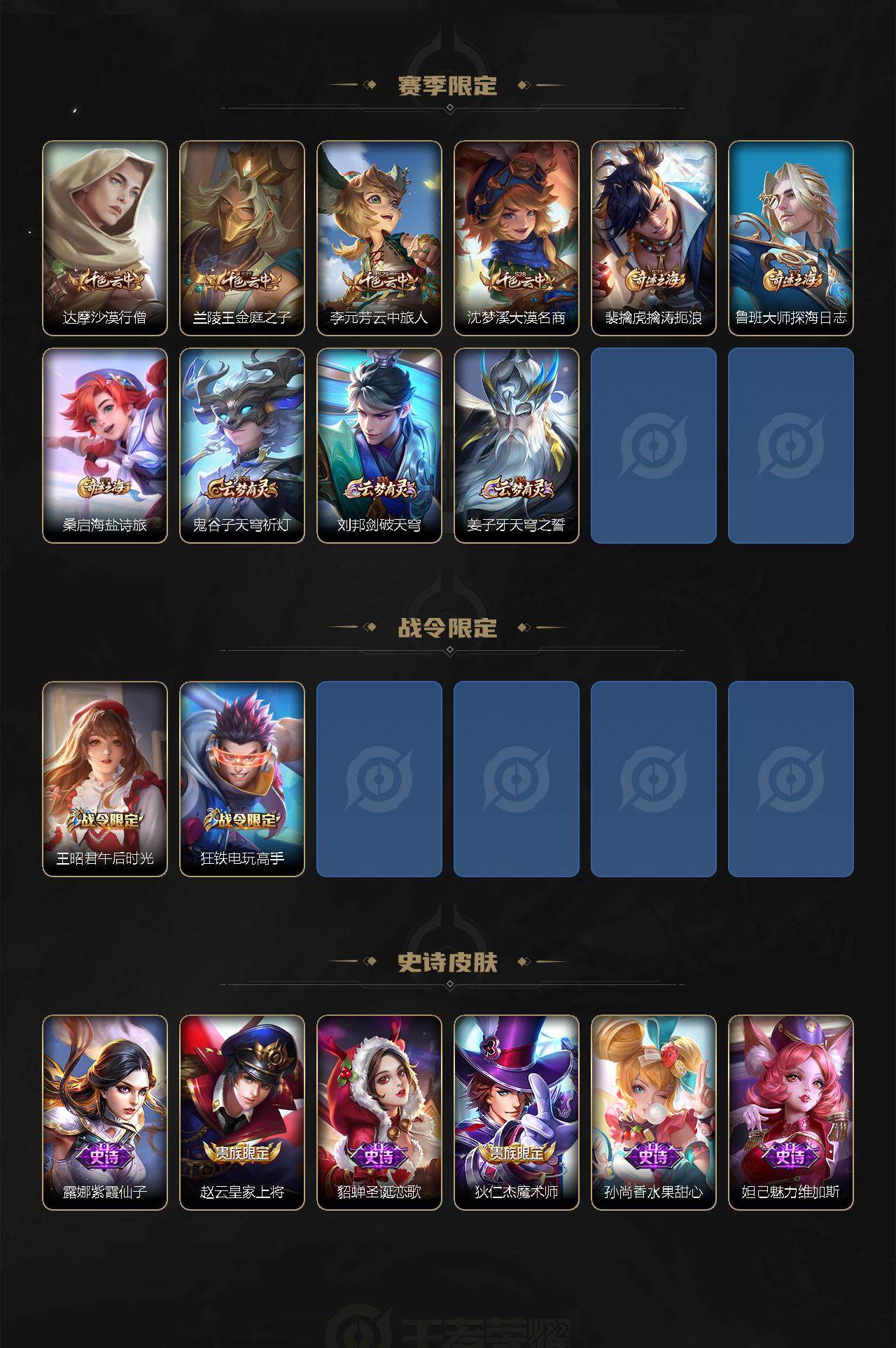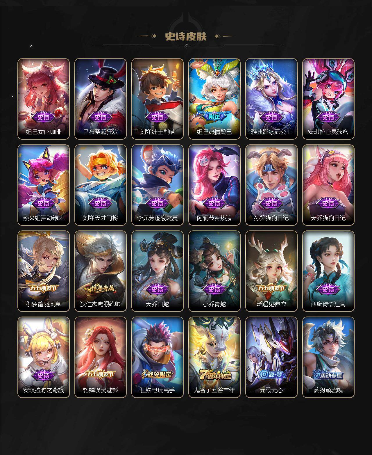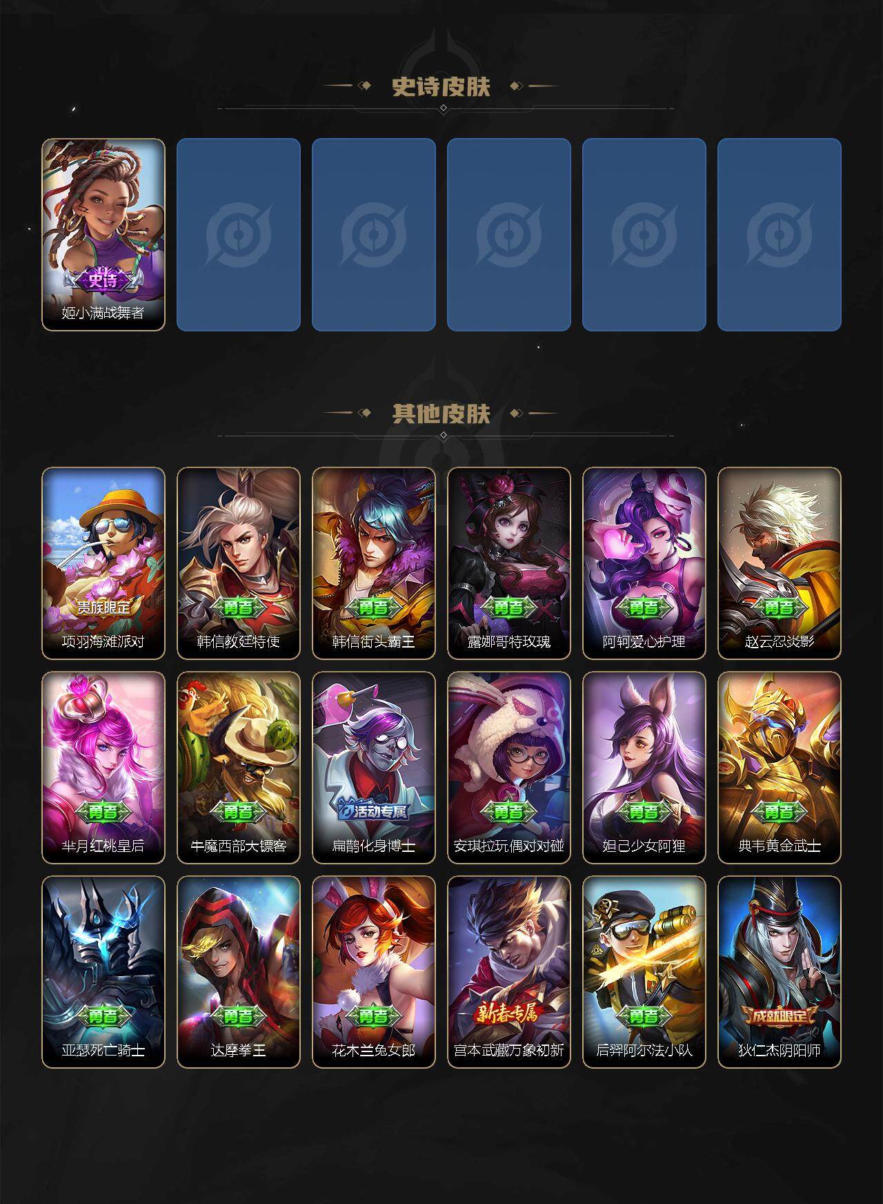 【女号】至尊星耀iv段位-101英雄-128皮肤-4典藏-0珍品无双-0无双-0珍品传说-11传说-31史诗 【荣耀典藏】:小乔天鹅之梦,孙尚香杀手不太冷,鲁班七号星空梦想,花木兰九霄神辉 【传说皮肤】:貂蝉仲夏夜之梦,虞姬云霓雀翎,貂蝉猫影幻舞,虞姬启明星使,小乔音你心动,西施游龙清影,王昭君乞巧织情,蔡文姬花朝如约,大乔挚爱花嫁,孙尚香音你闪耀,娜可露露前尘镜 【限定皮肤】:蒙犽顽岩魄,姜子牙天穹之誓,狄仁杰阴阳师,赵云皇家上将,妲己热情桑巴,元歌无心,狄仁杰魔术师,达摩沙漠行僧,项羽海滩派对,王昭君午后时光,兰陵王金庭之子,娜可露露前尘镜,李元芳云中旅人,虞姬启明星使,鬼谷子五谷丰年,大乔挚爱花嫁,沈梦溪大漠名商,裴擒虎擒涛扼浪,狂铁电玩高手,鲁班大师探海日志,桑启海盐诗旅,鬼谷子天穹祈灯,沈梦溪龙舞盛年,刘邦剑破天穹,周瑜熔金海岸 【赛季限定】:达摩沙漠行僧,兰陵王金庭之子,李元芳云中旅人,沈梦溪大漠名商,裴擒虎擒涛扼浪,鲁班大师探海日志,桑启海盐诗旅,鬼谷子天穹祈灯,刘邦剑破天穹,姜子牙天穹之誓 【战令限定】:王昭君午后时光,狂铁电玩高手 【史诗皮肤】:露娜紫霞仙子,赵云皇家上将,貂蝉圣诞恋歌,狄仁杰魔术师,孙尚香水果甜心,妲己魅力维加斯,妲己女仆咖啡,吕布圣诞狂欢,刘禅绅士熊喵,妲己热情桑巴,雅典娜冰冠公主,安琪拉心灵骇客,蔡文姬舞动绿茵,刘禅天才门将,李元芳逐浪之夏,阿轲节奏热浪,孙策猫狗日记,大乔猫狗日记,伽罗箭羽风息,狄仁杰鹰眼统帅,大乔白蛇,小乔青蛇,瑶遇见神鹿,西施诗语江南,安琪拉时之奇旅,貂蝉唤灵魅影,狂铁电玩高手,鬼谷子五谷丰年,元歌无心,蒙犽顽岩魄,姬小满战舞者 【其他皮肤】:项羽海滩派对,韩信教廷特使,韩信街头霸王,露娜哥特玫瑰,阿轲爱心护理,赵云忍炎影,芈月红桃皇后,牛魔西部大镖客,扁鹊化身博士,安琪拉玩偶对对碰,妲己少女阿狸,典韦黄金武士,亚瑟死亡骑士,达摩拳王,花木兰兔女郎,宫本武藏万象初新,后羿阿尔法小队,狄仁杰阴阳师,刘备汉昭烈帝,李元芳黑猫爱糖果,王昭君幻想奇妙夜,孙尚香沉稳之力,诸葛亮掌控之力,大乔守护之力,小乔丁香结,吕布野性能量,孙膑归虚梦演,盾山圆桌骑士,鲁班大师乓乓大师,达摩沙漠行僧,程咬金无双福将,兰陵王金庭之子,王昭君午后时光,沈梦溪大漠名商,蒙犽胡桃狂想曲,李元芳云中旅人,戈娅危途狂花,桑启海盐诗旅,海月幻泉雾影,裴擒虎擒涛扼浪,鲁班大师探海日志,李元芳妄想特派,鬼谷子天穹祈灯,朵莉亚金色潮汐,亚瑟鸿运当头,沈梦溪龙舞盛年,刘邦剑破天穹,姜子牙天穹之誓,周瑜熔金海岸,鲁班七号福禄兄弟,项羽帝国元帅,露娜绯红之刃,貂蝉异域舞娘,王昭君精灵公主,张良一千零一夜,小乔万圣前夜,后羿精灵王,钟馗地府判官,李元芳特种部队,蔡文姬蔷薇王座,夏侯惇战争骑士,马可波罗激情绿茵,苍维京掠夺者,大乔伊势巫女,百里守约绝影神呛,明世隐占星师,公孙离花间舞,弈星踏雪寻梅,米莱狄精准探案法,元歌午夜歌剧院,伽罗花见巫女,沈梦溪棒球奇才,上官婉儿修竹墨客,嫦娥露花倒影,猪八戒年年有余,瑶森,云中君荷鲁斯之眼,曜归虚梦演,西施归虚梦演,鲁班大师归虚梦演,司空震启蛰,云缨赤焰之缨 【营地id】:1756110525