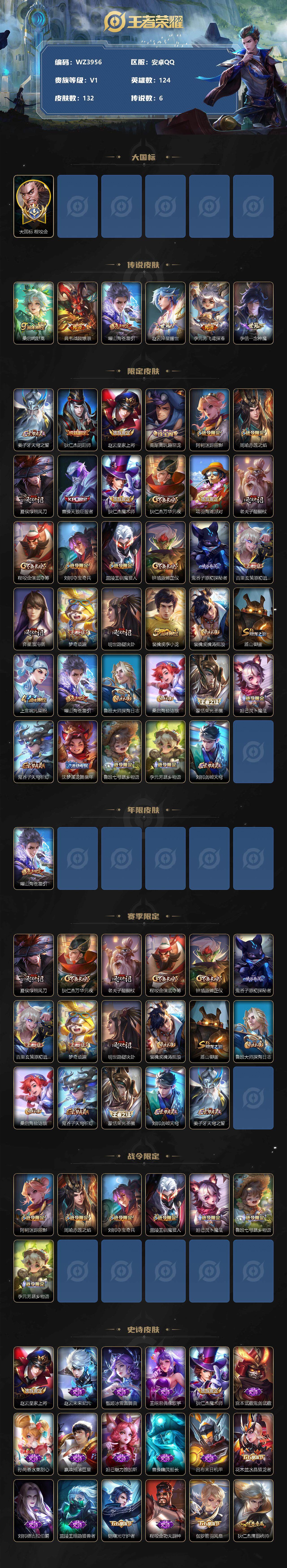 【大国标程咬金】【巅峰小魔方】v1-尊贵铂金ii段位-124英雄-132皮肤-0典藏-0珍品无双-0无双-0珍品传说-6传说-30史诗 【传说皮肤】:桑启鸣野蒿,典韦战鼓燎原,曜山海苍雷引,赵云淬星耀世,李元芳飞鸢探春,李信一念神魔 【限定皮肤】:姜子牙天穹之誓,狄仁杰阴阳师,赵云皇家上将,高渐离玩趣恶龙,阿轲迷踪丽影,周瑜赤莲之焰,夏侯惇朔风刀,曹操天狼征服者,狄仁杰魔术师,狄仁杰万华元夜,项羽海滩派对,老夫子醍醐杖,程咬金演武夺筹,刘邦夺宝奇兵,兰陵王驯魔猎人,钟馗驱傩正仪,鬼谷子原初探秘者,百里玄策原初追逐者,弈星混沌棋,梦奇顽趣,明世隐疑决卦,裴擒虎李小龙,裴擒虎擒涛扼浪,盾山御銮,上官婉儿梁祝,曜山海苍雷引,鲁班大师探海日志,桑启海盐诗旅,蒙恬荣光圣徽,妲己灵卜魔法,鬼谷子天穹祈灯,沈梦溪龙舞盛年,鲁班七号蔬乡物语,李元芳蔬乡物语,刘邦剑破天穹 【年限皮肤】:曜山海苍雷引 【赛季限定】:夏侯惇朔风刀,狄仁杰万华元夜,老夫子醍醐杖,程咬金演武夺筹,钟馗驱傩正仪,鬼谷子原初探秘者,百里玄策原初追逐者,弈星混沌棋,梦奇顽趣,明世隐疑决卦,裴擒虎擒涛扼浪,盾山御銮,鲁班大师探海日志,桑启海盐诗旅,鬼谷子天穹祈灯,蒙恬荣光圣徽,刘邦剑破天穹,姜子牙天穹之誓 【战令限定】:阿轲迷踪丽影,周瑜赤莲之焰,刘邦夺宝奇兵,兰陵王驯魔猎人,妲己灵卜魔法,鲁班七号蔬乡物语,李元芳蔬乡物语 【史诗皮肤】:赵云皇家上将,赵云未来纪元,甄姬冰雪圆舞曲,王昭君偶像歌手,狄仁杰魔术师,宫本武藏鬼剑武藏,孙尚香水果甜心,嬴政摇滚巨星,妲己魅力维加斯,曹操幽灵船长,吕布末日机甲,花木兰水晶猎龙者,刘邦德古拉伯爵,兰陵王暗隐猎兽者,铠曙光守护者,程咬金功夫厨神,伽罗箭羽风息,狄仁杰鹰眼统帅,兰陵王驯魔猎人,上官婉儿梁祝,曹操天狼征服者,娜可露露晚萤,阿轲迷踪丽影,百里玄策原初追逐者,裴擒虎李小龙,沈梦溪月团寄思,梦奇顽趣,刘禅电玩爆裂旋风,妲己灵卜魔法,蒙恬荣光圣徽,鲁班七号蔬乡物语 【其他皮肤】:项羽海滩派对,韩信街头霸王,露娜哥特玫瑰,达摩大发明家,赵云忍炎影,程咬金星际陆战队,程咬金爱与正义,牛魔西部大镖客,安琪拉玩偶对对碰,孙膑天使之翼,妲己少女阿狸,亚瑟死亡骑士,达摩拳王,花木兰兔女郎,刘备万事如意,宫本武藏万象初新,狄仁杰阴阳师,刘备汉昭烈帝,关羽龙腾万里,钟无艳海滩丽影,狂铁命运角斗场,孙尚香沉稳之力,诸葛亮掌控之力,苏烈坚韧之力,吕布野性能量,盾山御銮,高渐离玩趣恶龙,姜子牙炽热元素使,夏侯惇朔风刀,周瑜赤莲之焰,弈星混沌棋,哪吒次元突破,明世隐疑决卦,刘邦夺宝奇兵,盾山圆桌骑士,老夫子醍醐杖,鬼谷子原初探秘者,狄仁杰万华元夜,程咬金演武夺筹,钟馗驱傩正仪,鲁班大师乓乓大师,程咬金无双福将,蒙恬蔚蓝守将,桑启海盐诗旅,猪八戒潮玩探月行,牛魔牛运亨通,裴擒虎擒涛扼浪,太乙真人劲辣红锅,鲁班大师探海日志,鬼谷子天穹祈灯,妲己灵卜魔法,廉颇功夫炙烤,沈梦溪龙舞盛年,钟无艳春野之旅,李元芳蔬乡物语,扁鹊无尽旅途,刘邦剑破天穹,盘古经纬探寻者,姜子牙天穹之誓,东皇太一噬灭天穹,干将莫邪雾都夜雨,太乙真人谧流熔炉,西施雪境奇遇,鲁班七号福禄兄弟,貂蝉异域舞娘,程咬金华尔街大亨,曹操超能战警,张良一千零一夜,兰陵王隐刃,李白范海辛,李元芳特种部队,夏侯惇战争骑士,马可波罗激情绿茵,苍维京掠夺者,杨戬埃及法老,太乙真人圆桌骑士,黄忠芝加哥教父,铠龙域领主,百里玄策威尼斯狂欢,苏烈爱与和平,梦奇美梦成真,公孙离花间舞,裴擒虎街头旋风,弈星踏雪寻梅,孙策海之征途,伽罗花见巫女,李信灼热之刃,上官婉儿修竹墨客,猪八戒年年有余,盘古创世神祝,曜归虚梦演,西施归虚梦演,鲁班大师归虚梦演,蒙犽归虚梦演,司空震启蛰,暃碧珀绯影 【内测皮肤】:高渐离玩趣恶龙 【营地id】:58160305 大国标程咬金 小魔方