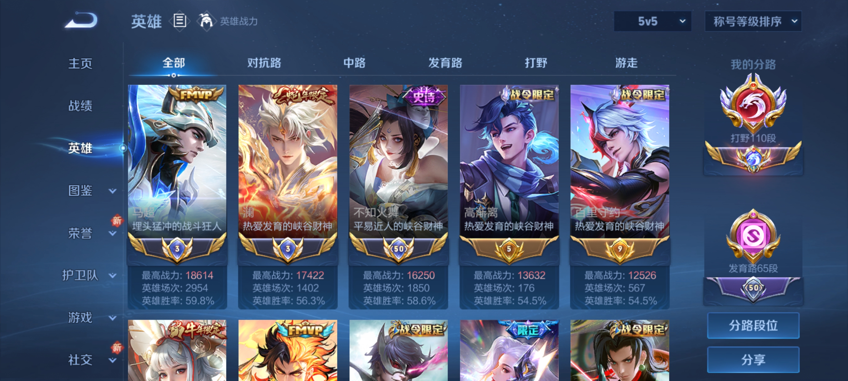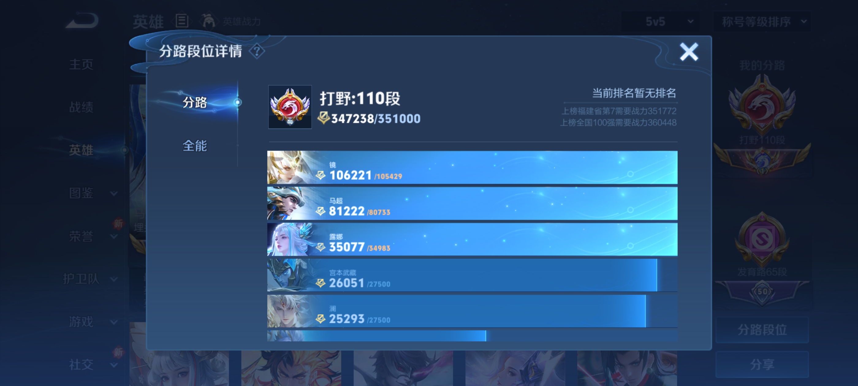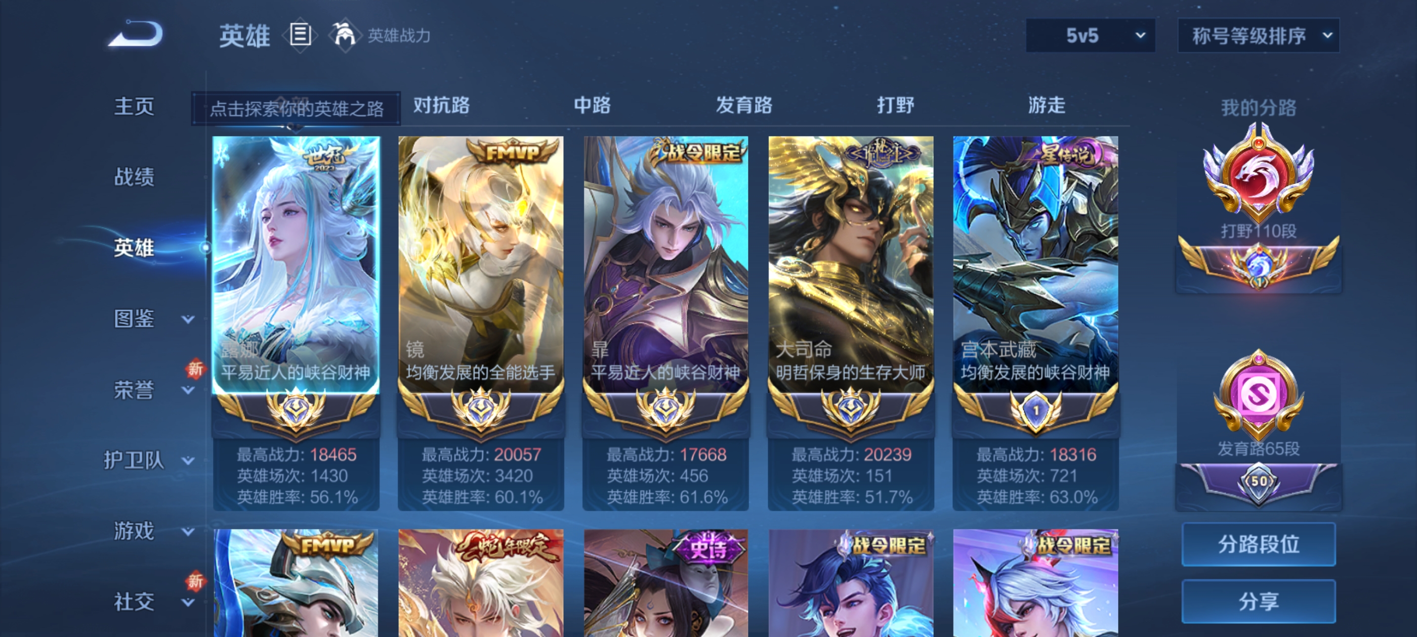 打野110段 小魔方 大国标露娜1.8w战力 大国标镜2w战力 大国标暃1.7w战力 大国标大司命2w战力 小国标宫本武藏1.8w战力 小国标马超1.8w战力 小国标澜1.7w战力 小国标不知火舞1.6w战力