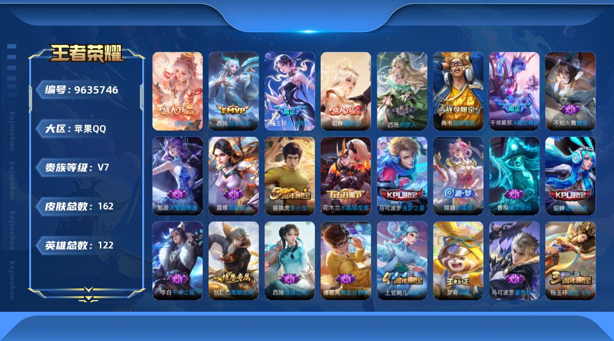 61段中路,1大国1小国,2.1w战大国西施,1.2w战小国杨玉环,魔方亮苹果q-v7-尊贵铂金i段位-122英雄-162皮肤-4传说-38史诗 【传说皮肤】:西施续相思,杨玉环星之鸣奏,貂蝉曦玄引,西施游龙清影 【限定皮肤】:白起狰,姜子牙天穹之誓,狄仁杰阴阳师,虞姬凯尔特女王,赵云皇家上将,嬴