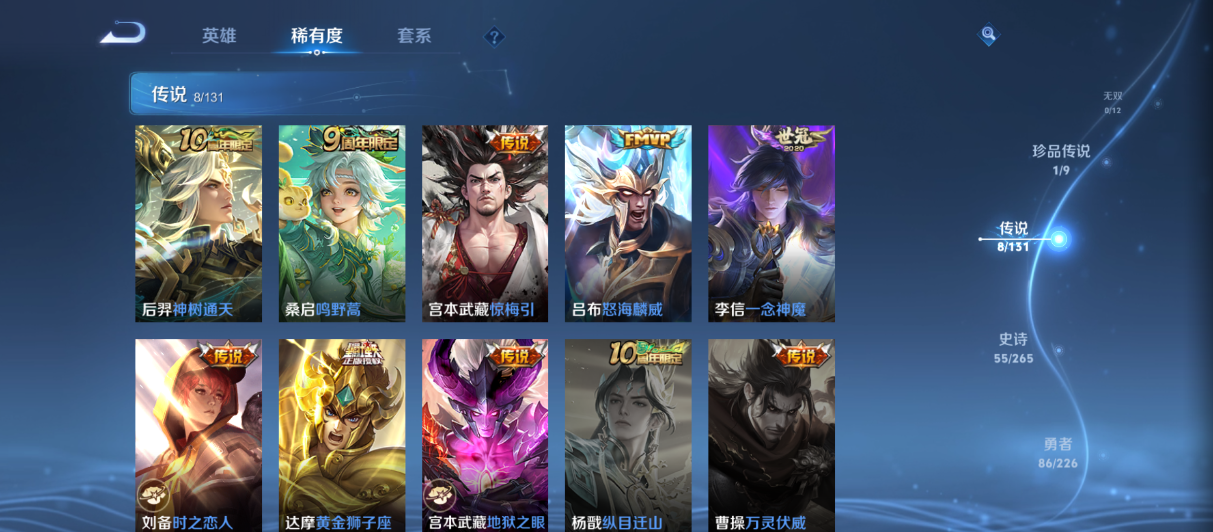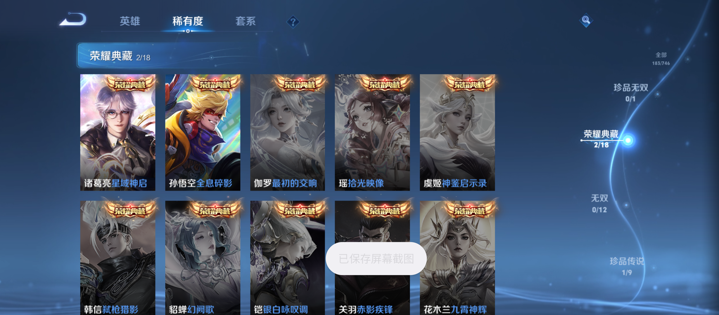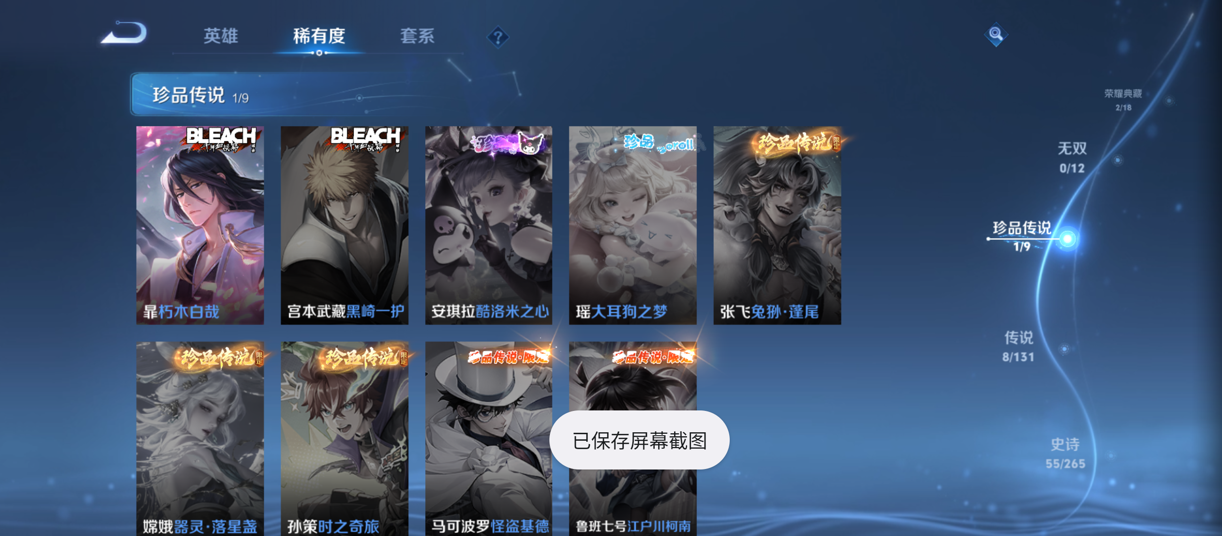 v7 183皮 2 典藏 星域神启,全息碎影 1 珍品传说 朽木白哉 8传说 55史诗 幽灵船长,梁祝,织梦人,涂山容容,守夜人,偶像歌手,龙之律动,石田雨龙,化蝶舞,百相守梦,圣诞恋歌,绅士熊喵,顽趣,心灵骇客,心灵战警,电玩高手,鬼剑武藏,破空之剑,末日机甲,特工魅影,江河有灵,未来纪元,原初追逐者,女仆咖啡,火炮绅士,星夜王子,乘风破浪,暗夜猫娘,逐浪之夏,傲雪梅呛,猪悟能,苍穹之光,猫狗日记,天狼溯光者,纤云弄巧,冰冠公主,圣诞狂欢,魔术师,狂想玩偶喵,暗隐猎兽者,冰雪圆舞曲,李小龙,迷踪丽影,龙胆,鹰眼统帅,黄金分割率,至尊宝,无限星赏官,皇家上将,千年之狐,大圣娶亲,青龙志,白龙吟,魅力维加斯,水果甜心