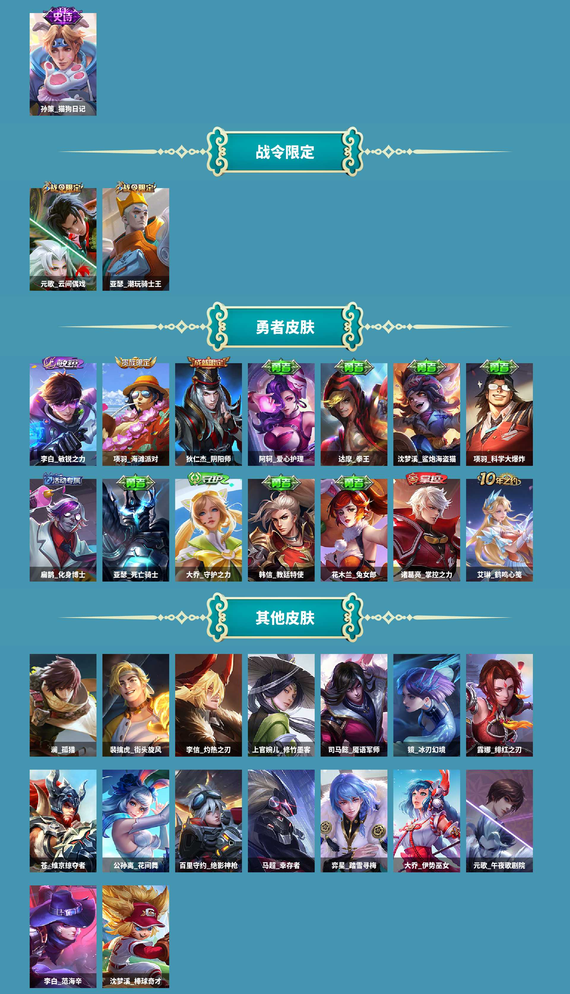 al627462 【准万战金标元歌-2传说后裔神树通天,镜炽阳神光-花木兰情人节限定】 皮肤数60 传说皮肤数2 史诗皮肤数13 英雄数78 贵族等级【文本】贵族4级 【贵族4级】 限定皮肤23 赛季限定15 史诗皮肤13 战令限定2 勇者皮肤29 其他皮肤16 限定皮肤:鬼谷子天穹祈灯,鲁班大师探海日志,裴擒虎擒涛扼浪,桑启海盐诗旅,李元芳云中旅人,元歌无心,沈梦溪大漠名商,百里玄策原初追逐者,兰陵王金庭之子,达摩沙漠行僧,苏烈千军破阵,钟馗驱傩正仪,程咬金演武夺筹,元歌云间偶戏,项羽海滩派对,花木兰默契交锋,狄仁杰万华元夜,亚瑟潮玩骑士王,裴擒虎李小龙,鬼谷子原初探秘者,狄仁杰鹰眼统帅,狄仁杰阴阳师,老夫子醍醐杖; 赛季限定:鬼谷子天穹祈灯,鲁班大师探海日志,裴擒虎擒涛扼浪,桑启海盐诗旅,李元芳云中旅人,沈梦溪大漠名商,百里玄策原初追逐者,兰陵王金庭之子,达摩沙漠行僧,苏烈千军破阵,钟馗驱傩正仪,程咬金演武夺筹,狄仁杰万华元夜,鬼谷子原初探秘者,老夫子醍醐杖; 史诗皮肤:廉颇地狱岩魂,孙尚香水果甜心,墨子龙骑士,孙策猫狗日记,元歌无心,曹操幽灵船长,宫本武藏鬼剑武藏,百里玄策原初追逐者,元歌云间偶戏,花木兰默契交锋,裴擒虎李小龙,狄仁杰鹰眼统帅,妲己魅力维加斯; 战令限定:元歌云间偶戏,亚瑟潮玩骑士王; 勇者皮肤:达摩拳王,艾琳鹤鸣心笺,阿轲爱心护理,鬼谷子天穹祈灯,鲁班大师探海日志,裴擒虎擒涛扼浪,扁鹊化身博士,桑启海盐诗旅,李元芳云中旅人,沈梦溪大漠名商,兰陵王金庭之子,达摩沙漠行僧,苏烈千军破阵,钟馗驱傩正仪,程咬金演武夺筹,大乔守护之力,韩信教廷特使,李白敏锐之力,项羽海滩派对,狄仁杰万华元夜,亚瑟潮玩骑士王,沈梦溪鲨炮海盗猫,项羽科学大爆炸,花木兰兔女郎,诸葛亮掌控之力,鬼谷子原初探秘者,狄仁杰阴阳师,老夫子醍醐杖,亚瑟死亡骑士; 其他皮肤:大乔伊势巫女,澜孤猎,公孙离花间舞,司马懿魇语军师,百里守约绝影神呛,镜冰刃幻境,上官婉儿修竹墨客,露娜绯红之刃,弈星踏雪寻梅,李信灼热之刃,马超幸存者,沈梦溪棒球奇才,苍维京掠夺者,李白范海辛,元歌午夜歌剧院,裴擒虎街头旋风;