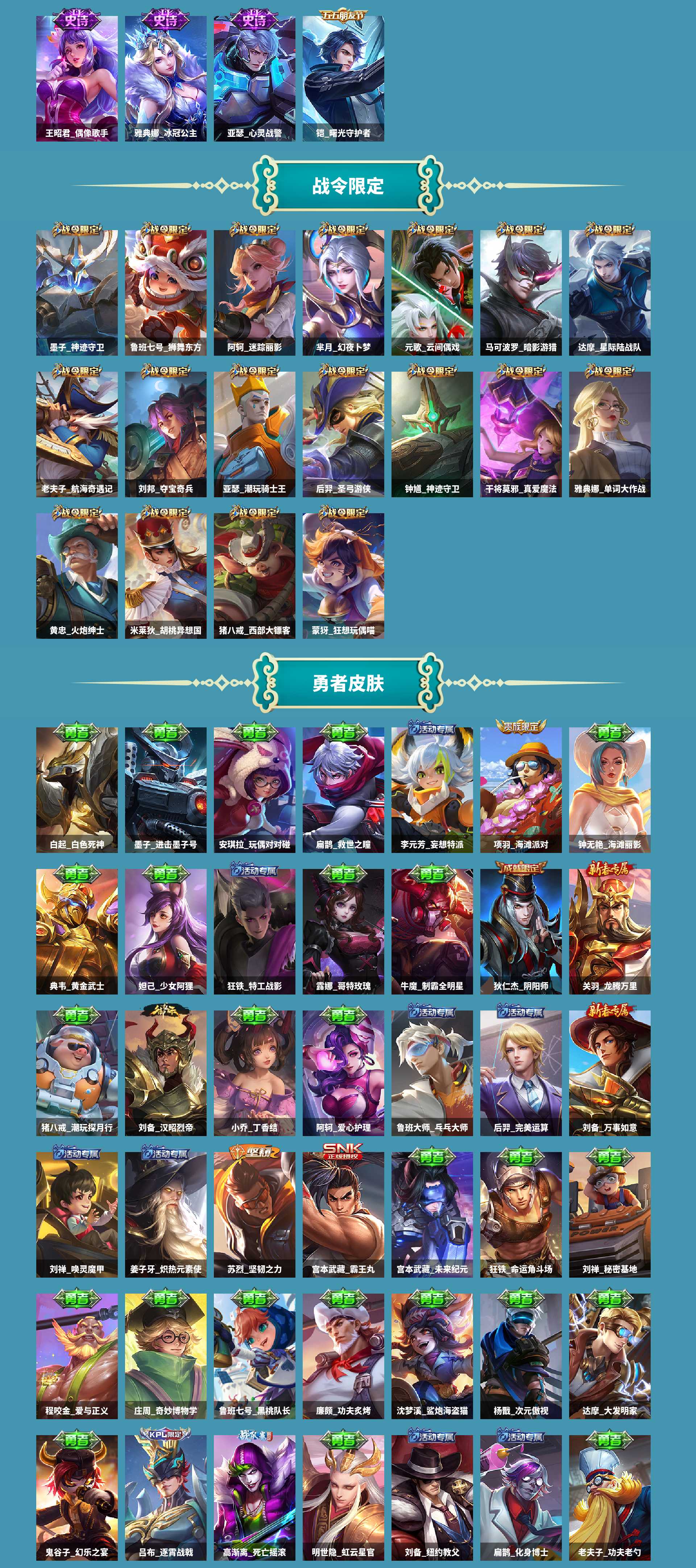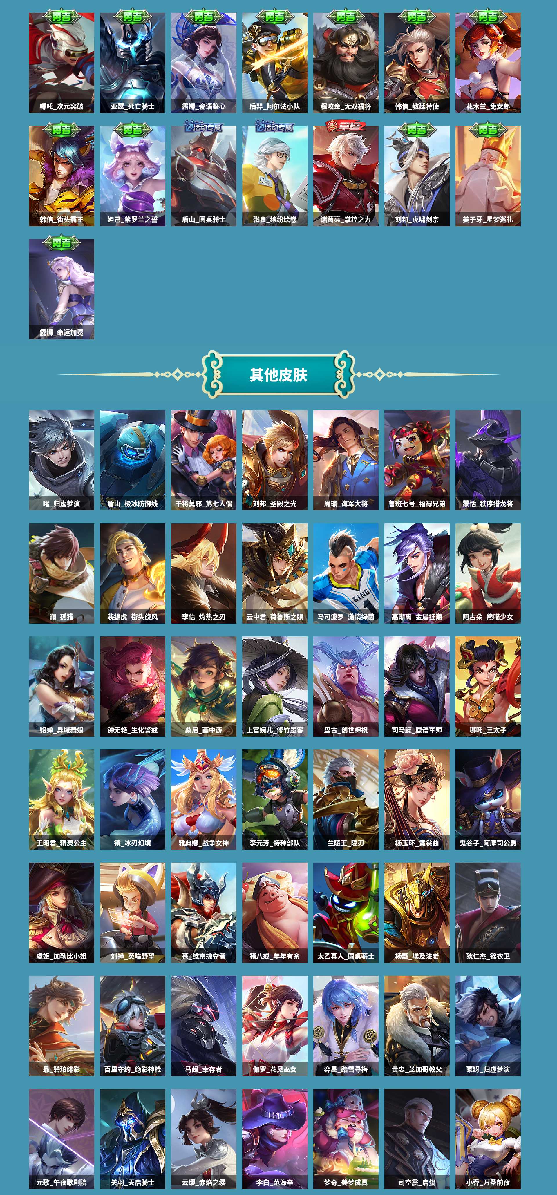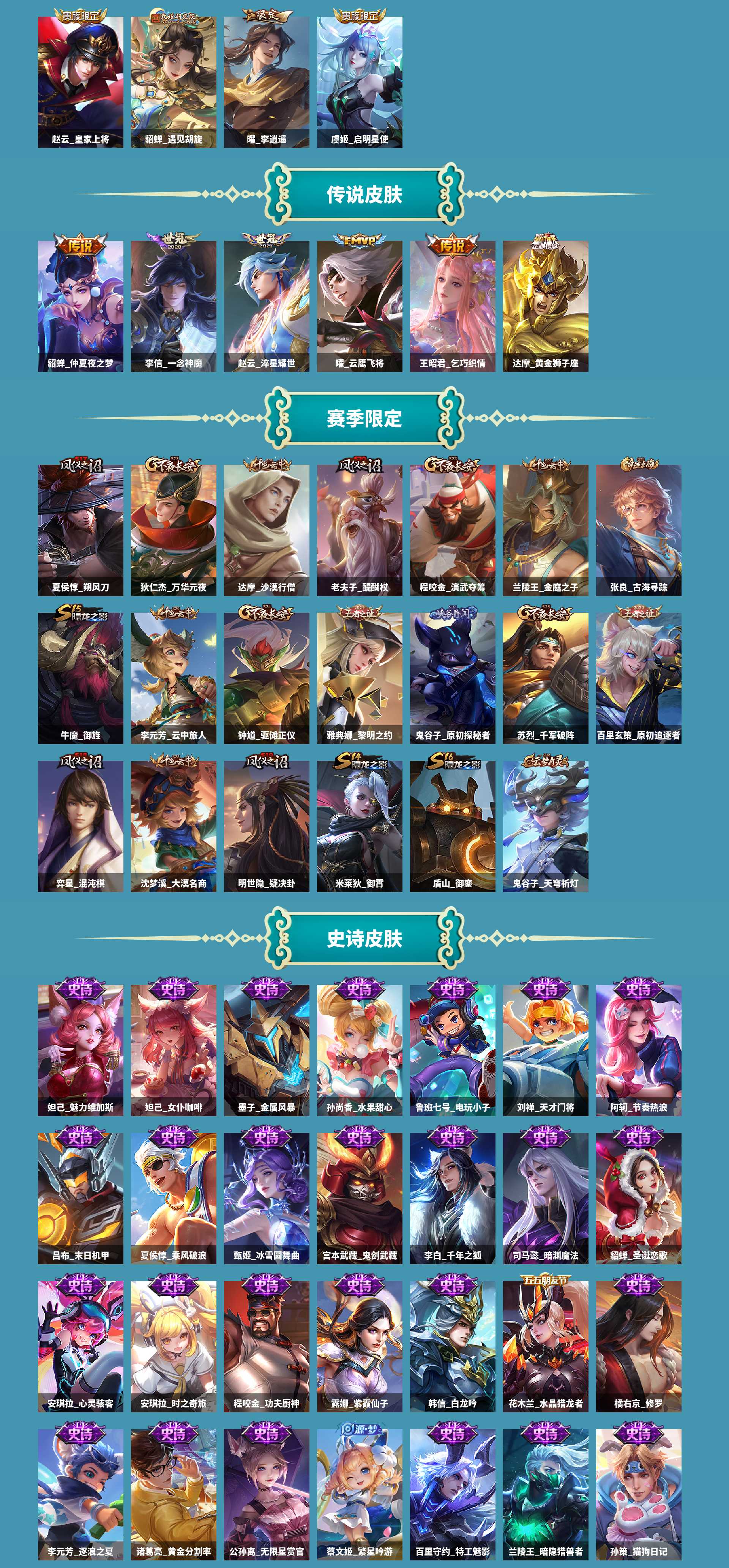 al627591 【特价1无双李白碎月剑心传说皮肤:虞姬启明星使,貂蝉遇见胡旋,赵云淬星耀世,王昭君乞巧织情,曜李,貂蝉仲夏夜之梦,达摩黄金狮子座,兰陵王默契交锋,诸葛亮时雨天司,李信一念神魔,曜云鹰飞将,铠曙光守护者】 皮肤数216 无双皮肤数1 传说皮肤数11 史诗皮肤数65 英雄数127 贵族等级【文本】贵族7级 【贵族7级】 【不可排位】 无双皮肤1 内测皮肤1 年限皮肤2 限定皮肤71 赛季限定20 史诗皮肤65 战令限定18 勇者皮肤85 其他皮肤54 无双皮肤:李白碎月剑心; 内测皮肤:艾琳女武神; 年限皮肤:马超神威,诸葛亮时雨天司; 限定皮肤:吕布逐霄战戟,鬼谷子天穹祈灯,蒙犽百解令,虞姬启明星使,张良古海寻踪,鬼谷子五谷丰年,李元芳云中旅人,沈梦溪大漠名商,兰陵王金庭之子,镜匿光追影者,露娜一生所爱,韩信傲雪梅呛,黄忠火炮绅士,芈月幻夜卜梦,达摩沙漠行僧,雅典娜黎明之约,嫦娥拒霜思,庄周高山流水,干将莫邪真爱魔法,马超神威,杨玉环遇见飞天,后羿圣弓游侠,貂蝉遇见胡旋,苏烈千军破阵,老夫子航海奇遇记,墨子神迹守卫,艾琳女武神,韩信逐梦之影,钟馗驱傩正仪,伽罗天狼溯光者,米莱狄胡桃异想国,曜李,达摩星际陆战队,程咬金演武夺筹,高渐离死亡摇滚,元歌云间偶戏,干将莫邪冰霜恋舞曲,花木兰默契交锋,孙膑天狼运算者,兰陵王默契交锋,诸葛亮时雨天司,芈月白晶晶,狄仁杰万华元夜,亚瑟潮玩骑士王,云中君纤云弄巧,蒙犽狂想玩偶喵,裴擒虎李小龙,雅典娜单词大作战,鬼谷子原初探秘者,百里玄策原初追逐者,马可波罗暗影游猎,蔡文姬繁星吟游,狄仁杰魔术师,猪八戒西部大镖客,老夫子醍醐杖,上官婉儿天狼绘梦者,阿轲迷踪丽影,孙悟空至尊宝,刘邦夺宝奇兵,明世隐疑决卦,赵云皇家上将,狄仁杰鹰眼统帅,项羽海滩派对,弈星混沌棋,夏侯惇朔风刀,鲁班七号狮舞东方,钟馗神迹守卫,狄仁杰阴阳师,盾山御銮,牛魔御旌,米莱狄御霄; 赛季限定:鬼谷子天穹祈灯,张良古海寻踪,李元芳云中旅人,沈梦溪大漠名商,兰陵王金庭之子,达摩沙漠行僧,雅典娜黎明之约,苏烈千军破阵,钟馗驱傩正仪,程咬金演武夺筹,狄仁杰万华元夜,鬼谷子原初探秘者,百里玄策原初追逐者,老夫子醍醐杖,明世隐疑决卦,弈星混沌棋,夏侯惇朔风刀,盾山御銮,牛魔御旌,米莱狄御霄; 史诗皮肤:程咬金功夫厨神,王昭君偶像歌手,妲己女仆咖啡,兰陵王暗隐猎兽者,李元芳逐浪之夏,夏侯惇乘风破浪,百里守约特工魅影,甄姬冰雪圆舞曲,蒙犽百解令,雅典娜冰冠公主,鬼谷子五谷丰年,鲁班七号电玩小子,宫本武藏鬼剑武藏,镜匿光追影者,露娜一生所爱,露娜紫霞仙子,司马懿暗渊魔法,韩信傲雪梅呛,刘禅天才门将,黄忠火炮绅士,安琪拉心灵骇客,吕布末日机甲,雅典娜黎明之约,花木兰水晶猎龙者,嫦娥拒霜思,庄周高山流水,干将莫邪真爱魔法,马超神威,阿轲节奏热浪,杨玉环遇见飞天,安琪拉时之奇旅,老夫子航海奇遇记,韩信逐梦之影,伽罗天狼溯光者,米莱狄胡桃异想国,貂蝉圣诞恋歌,元歌云间偶戏,干将莫邪冰霜恋舞曲,花木兰默契交锋,孙膑天狼运算者,芈月白晶晶,云中君纤云弄巧,蒙犽狂想玩偶喵,裴擒虎李小龙,百里玄策原初追逐者,马可波罗暗影游猎,蔡文姬繁星吟游,诸葛亮黄金分割率,孙策猫狗日记,韩信白龙吟,狄仁杰魔术师,橘右京修罗,上官婉儿天狼绘梦者,阿轲迷踪丽影,墨子金属风暴,孙悟空至尊宝,赵云皇家上将,亚瑟心灵战警,公孙离无限星赏官,狄仁杰鹰眼统帅,铠曙光守护者,李白千年之狐,鲁班七号狮舞东方,孙尚香水果甜心,妲己魅力维加斯; 战令限定:黄忠火炮绅士,芈月幻夜卜梦,干将莫邪真爱魔法,后羿圣弓游