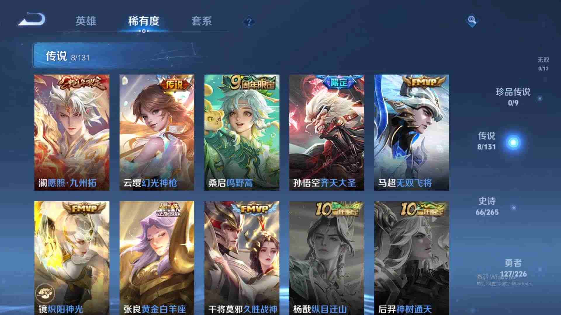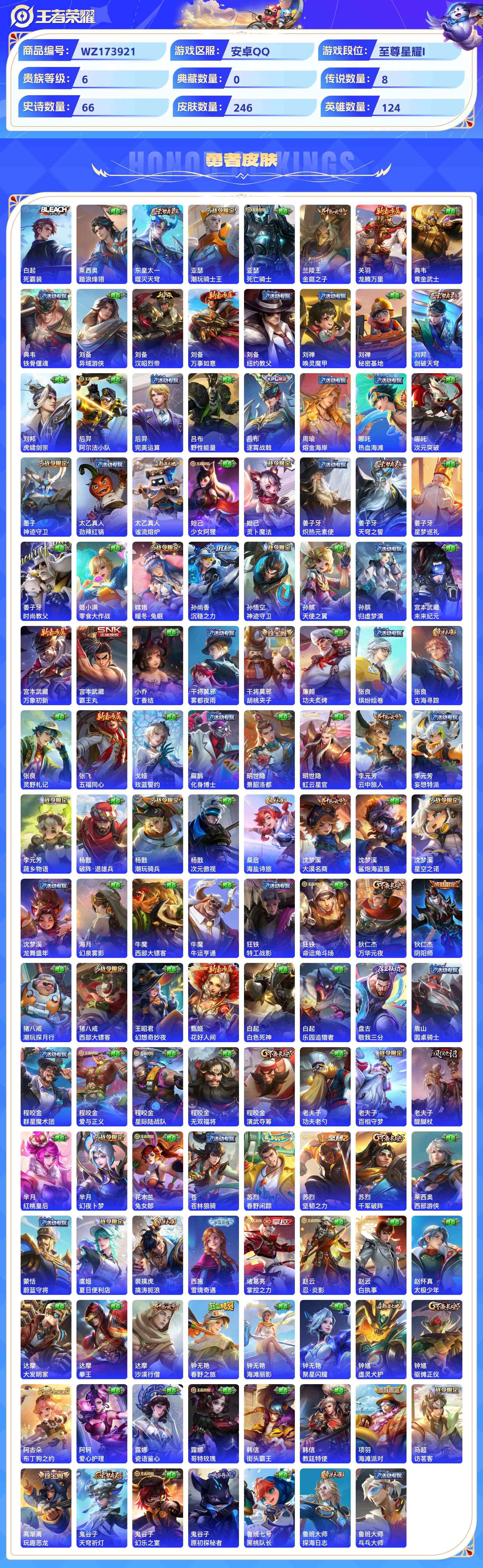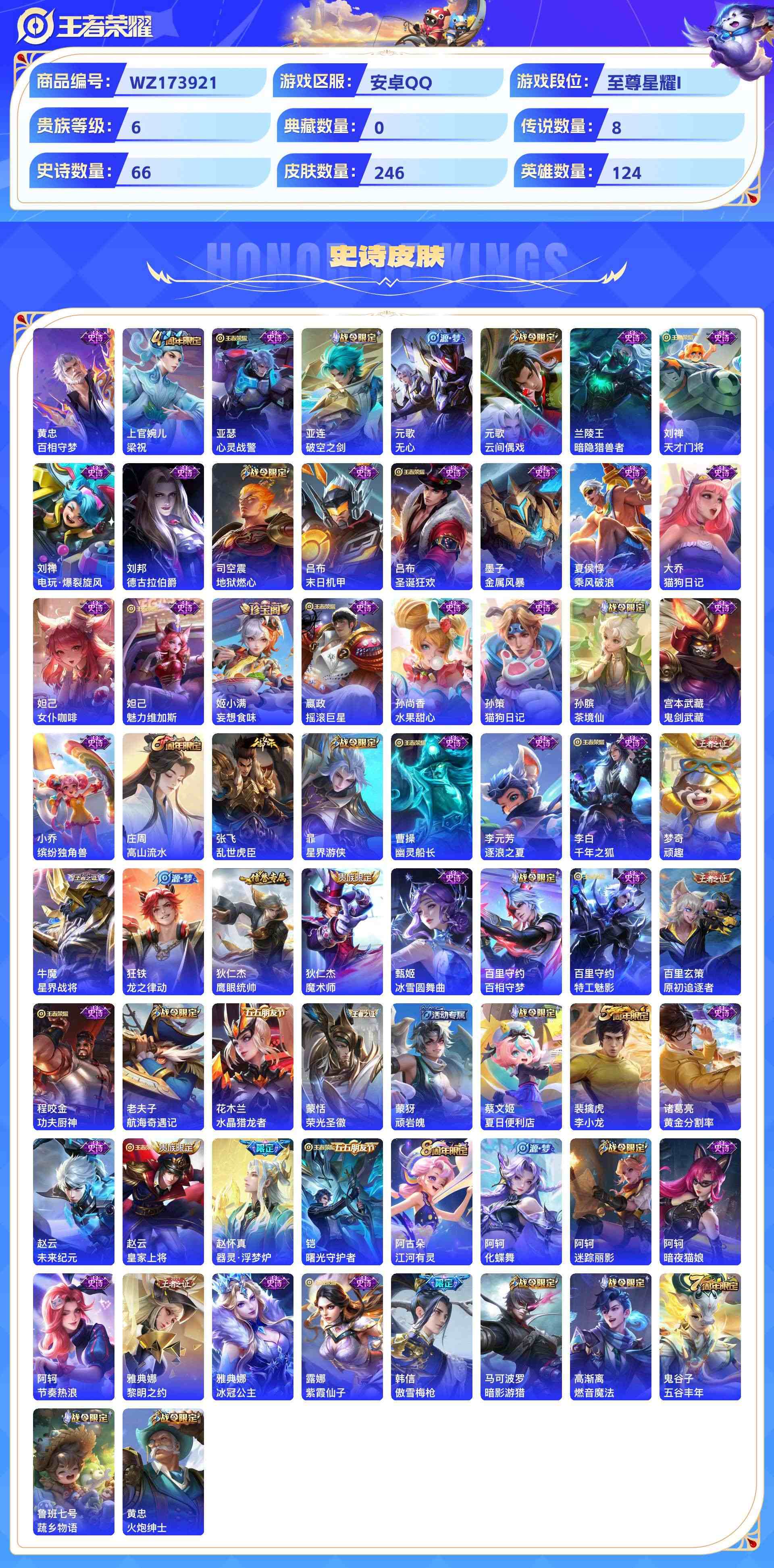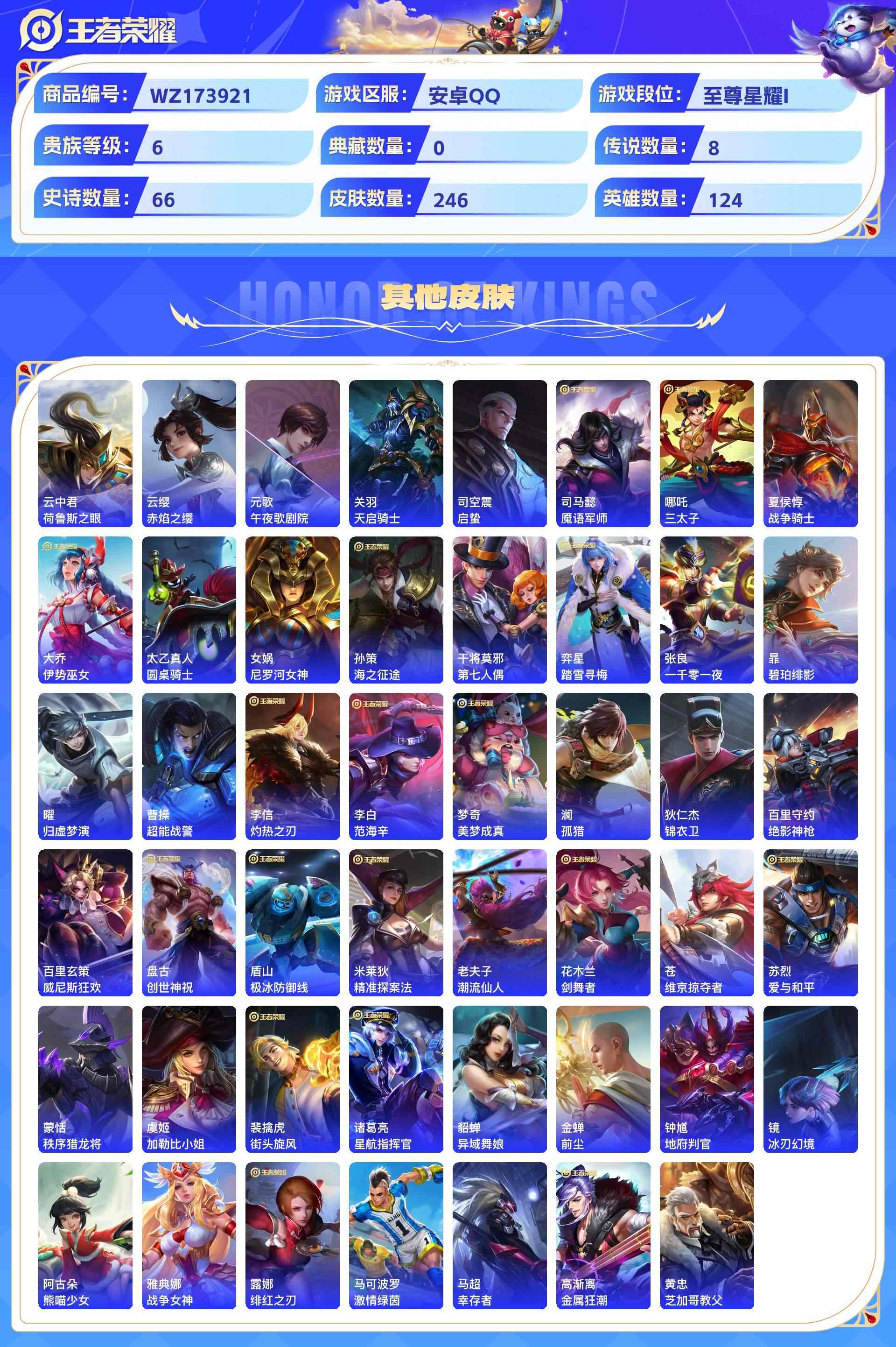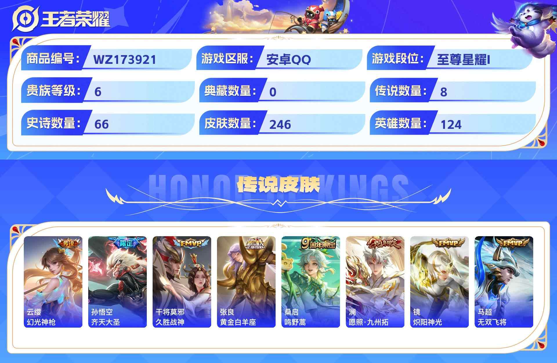 wz173921|精品号【传说皮肤】幻光神呛齐天大圣久胜战神黄金白羊座鸣野蒿愿照·九州拓炽阳神光无双飞将安卓qq 贵族6级 246皮 8传说 66史诗7个性按键