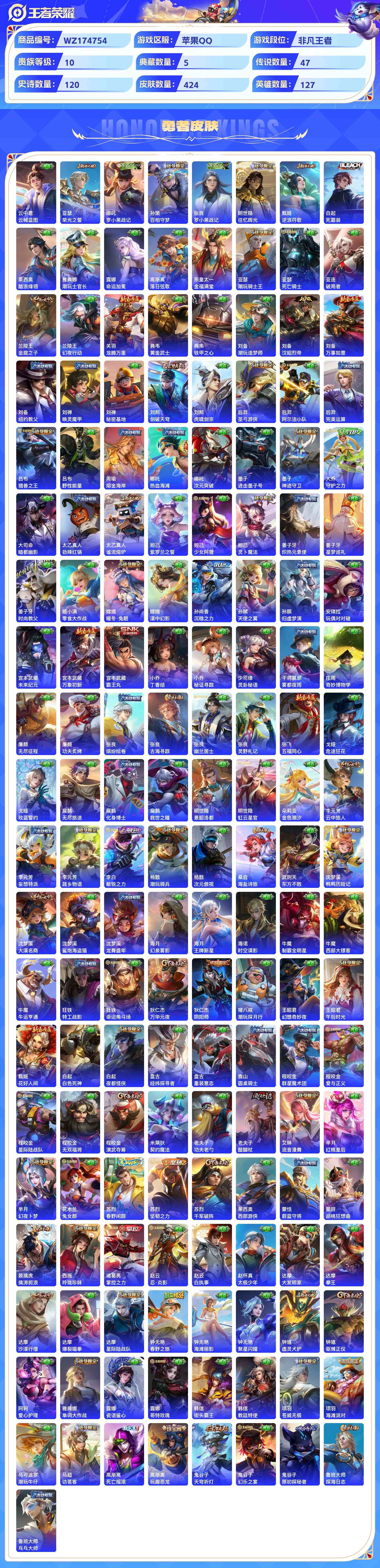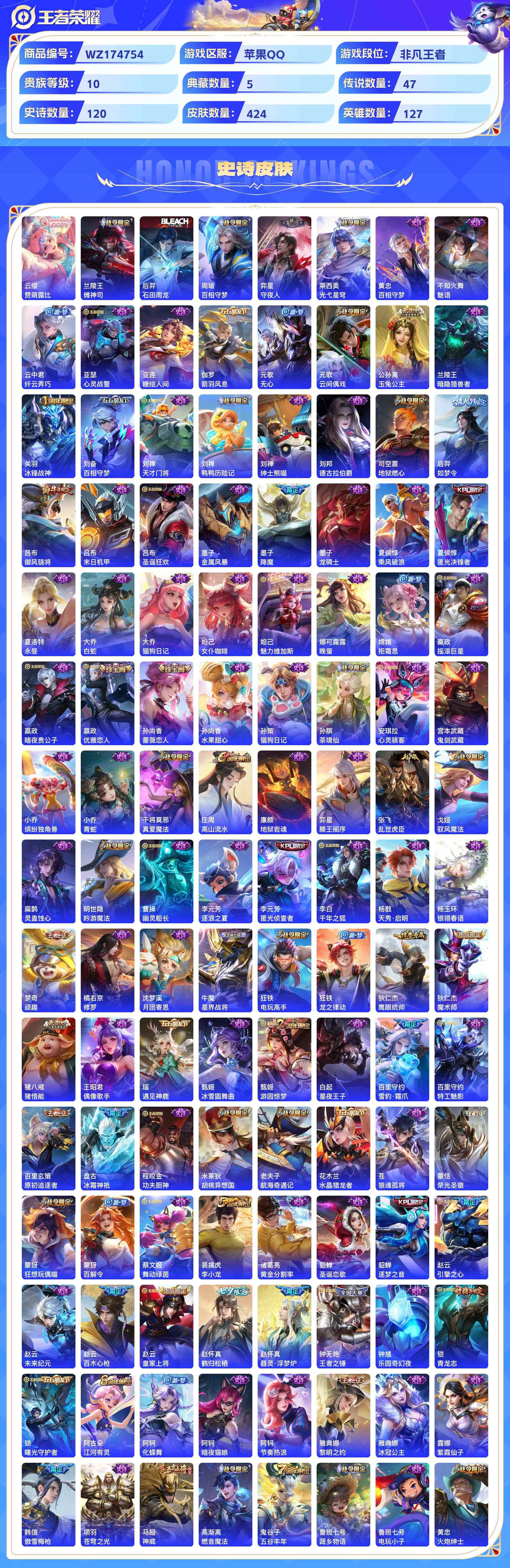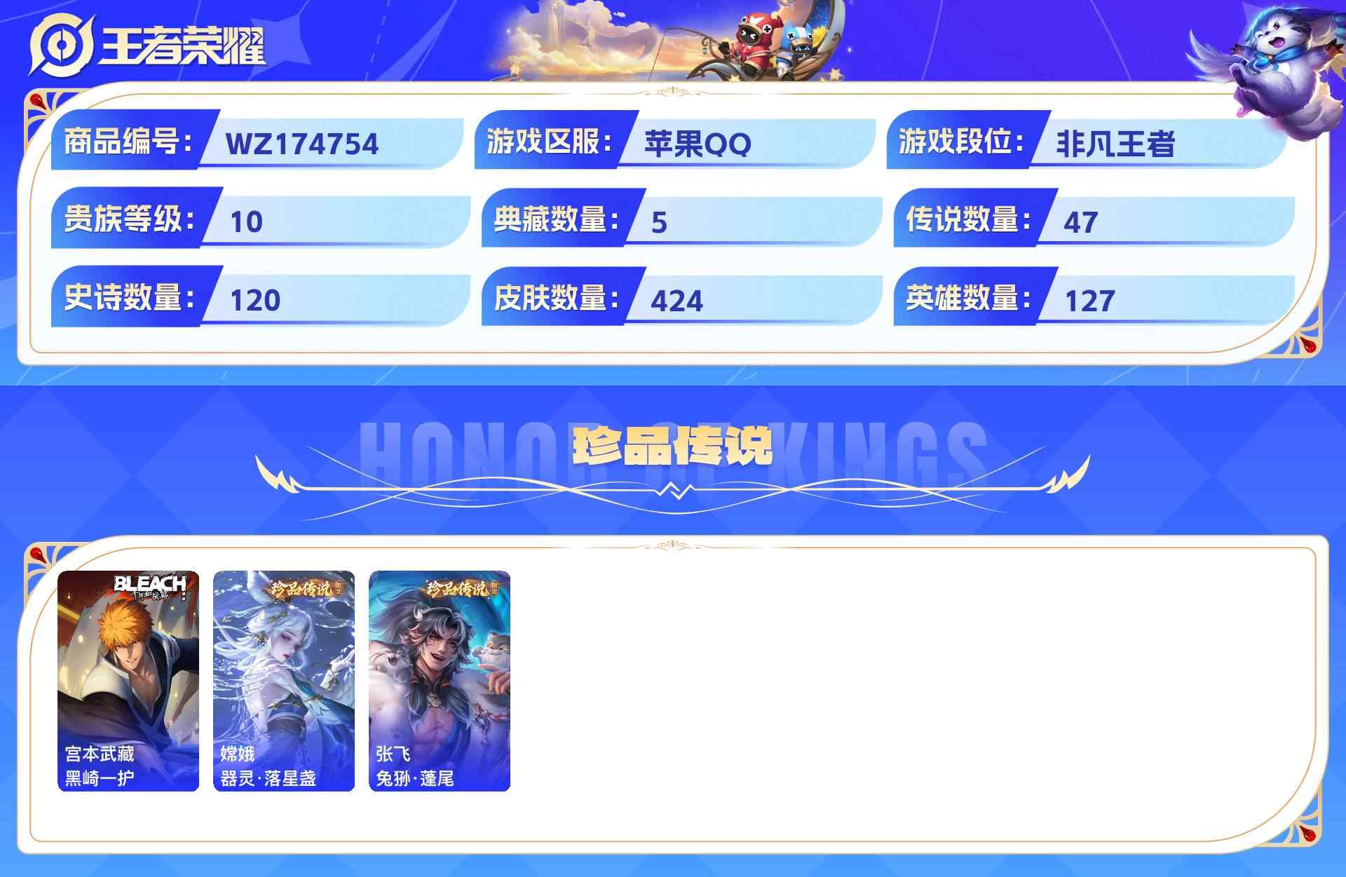 wz174754|极品号【荣耀典藏】最初的交响全息碎影拾光映像九霄神辉幻阙歌【珍品传说】黑崎一护器灵·落星盏兔狲·蓬尾【无双限定】天机白泽器灵·螭龙剑苹果qq 贵族10级 424皮 5典藏 3珍品传说 2无双 47传说 120史诗3星传说12个性按键4天幕