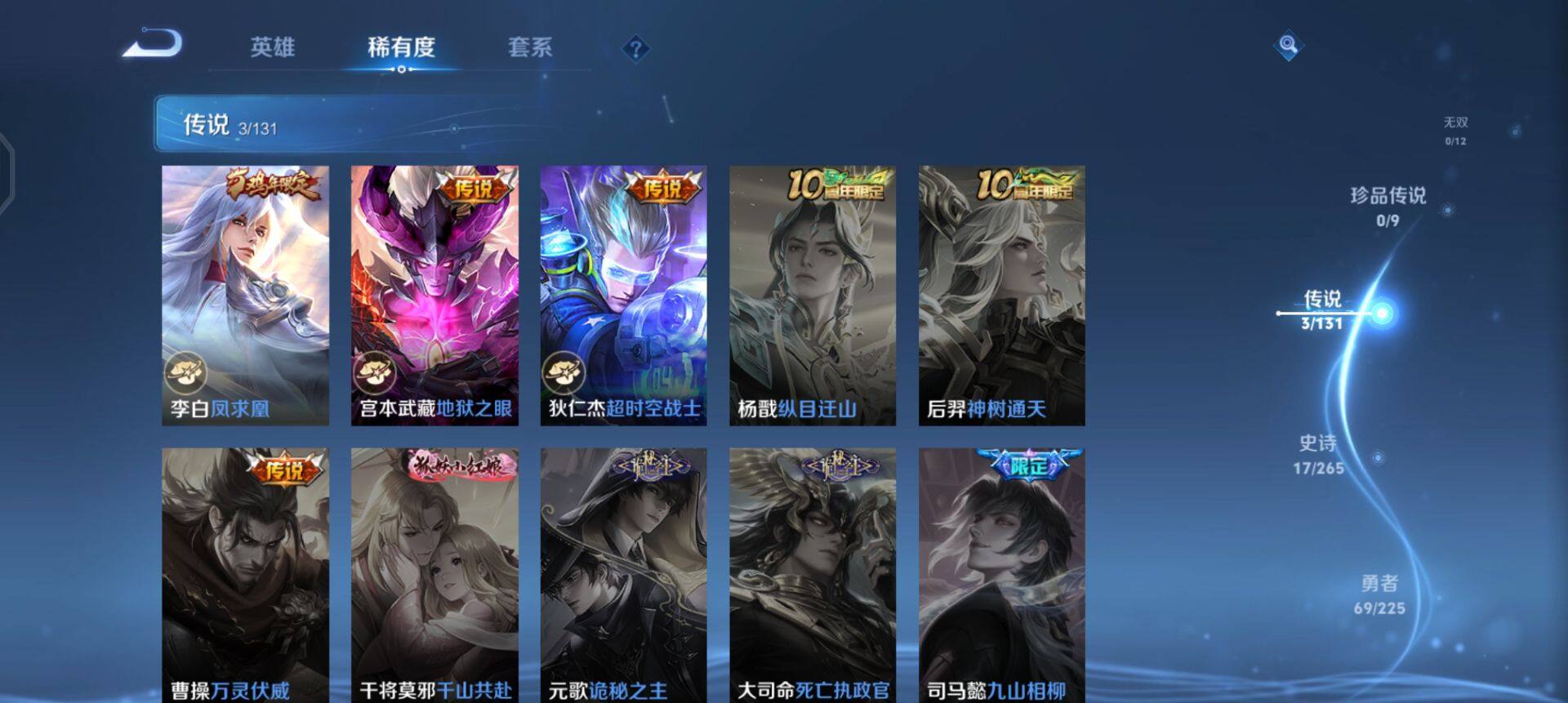 w9404 可立即换绑无需挂单养号 铭文满级 传说3 夺宝135 安卓q-v5-至尊星耀v段位-124英雄-118皮肤-0典藏-0珍品无双-0无双-0珍品传说-3传说-17史诗 【传说皮肤】:李白凤求凰,宫本武藏地狱之眼,狄仁杰超时空战士 【限定皮肤】:白起狰,狄仁杰阴阳师,虞姬凯尔特女王,赵云皇家上将,庄周蜃楼王,孙膑妖精王,扁鹊炼金王,芈月重明,夏侯惇朔风刀,曹操烛龙,典韦穷