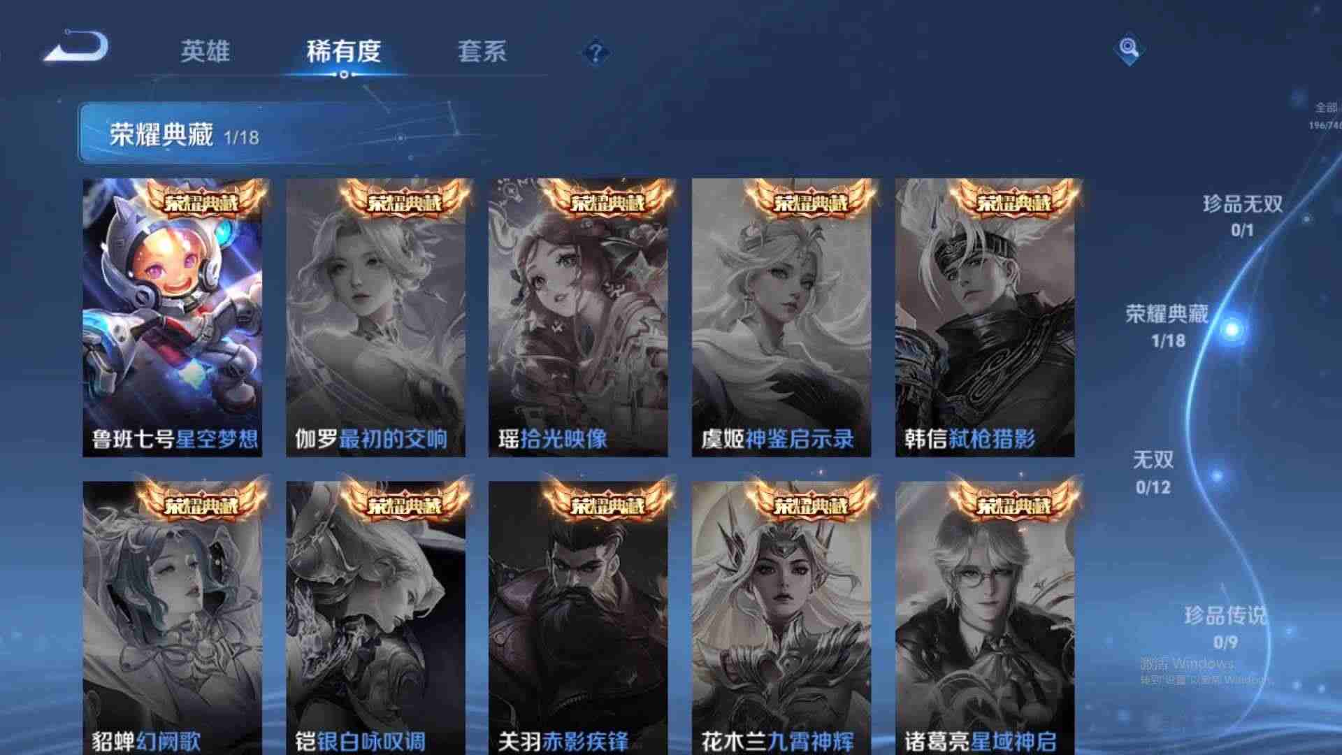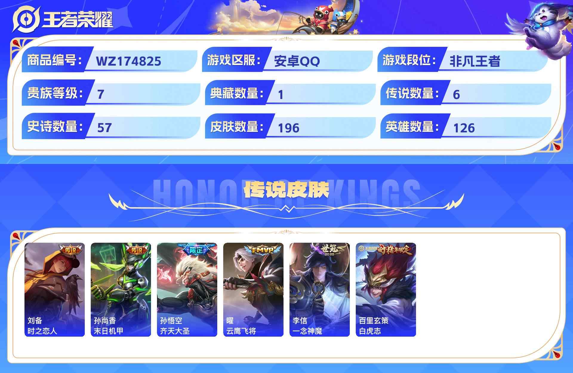 wz174825|精品号可二次【荣耀典藏】星空梦想【传说皮肤】时之恋人末日机甲齐天大圣云鹰飞将一念神魔白虎志安卓qq 贵族7级 196皮 1典藏 6传说 57史诗1星传说5个性按键