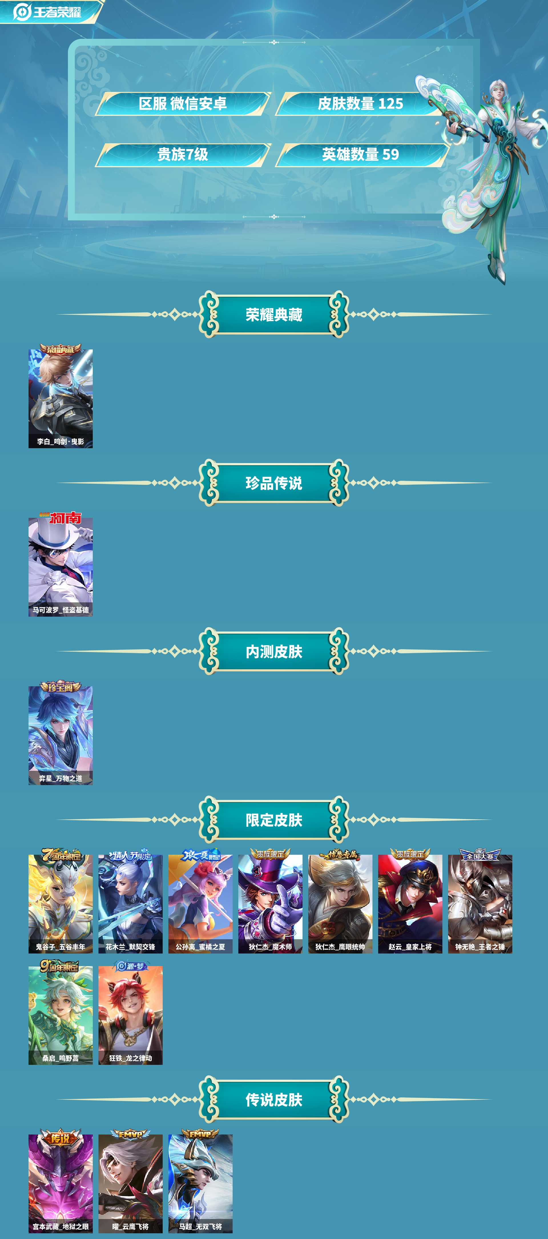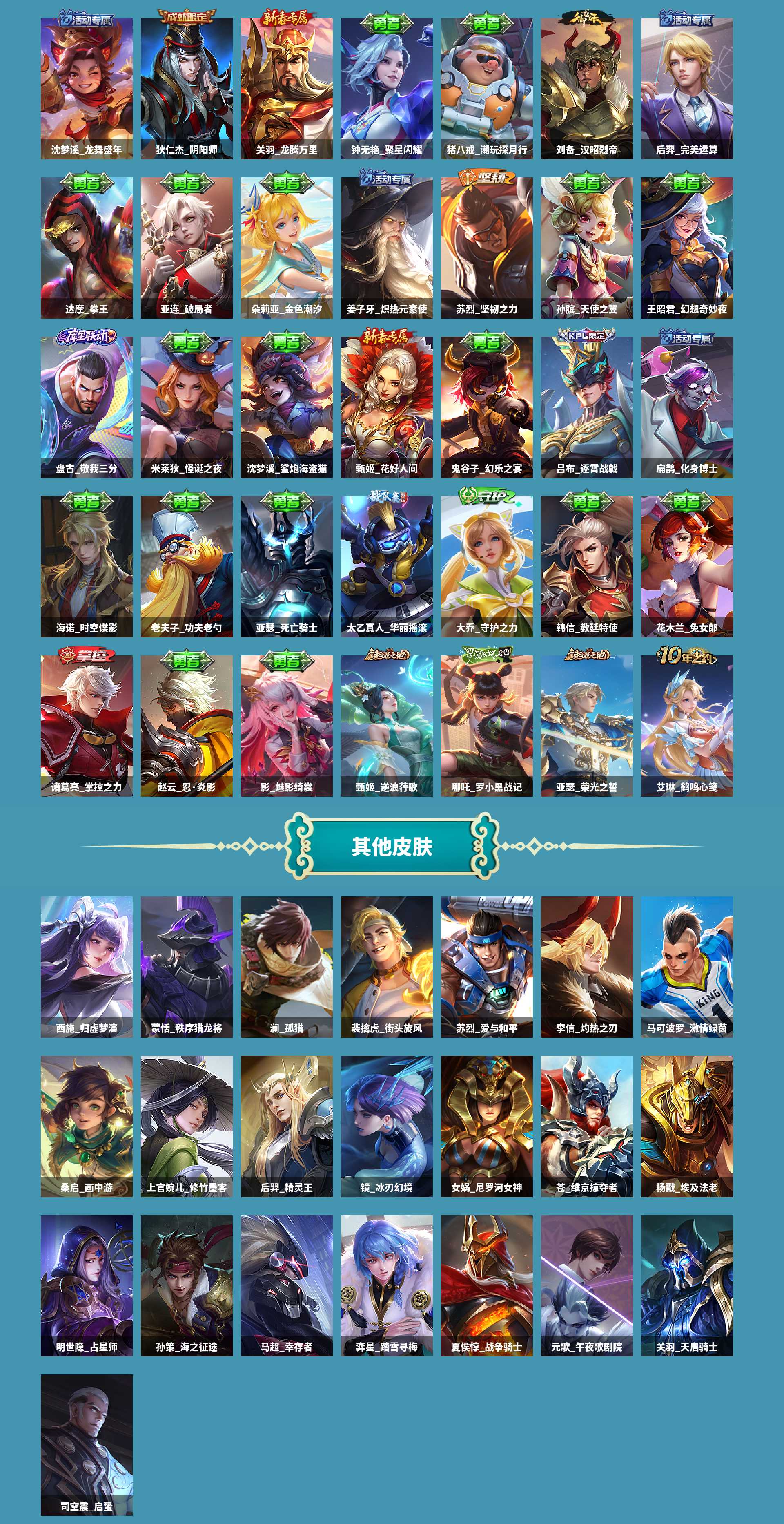 al628629 【特价1水李白鸣剑曳影2国标1w5马超1w4蒙恬 微信永久社交】 皮肤数125 传说皮肤数4 珍品传说皮数1 史诗皮肤数39 英雄数126 贵族等级【文本】贵族7级 【贵族7级】 【可排位】 荣耀典藏1 珍品传说1 内测皮肤1 限定皮肤39 赛季限定19 史诗皮肤39 战令限定6 勇者皮肤58 其他皮肤22 荣耀典藏:李白鸣剑曳影; 珍品传说:马可波罗怪盗基德; 内测皮肤:弈星万物之道; 限定皮肤:弈星万物之道,狂铁龙之律动,梦奇顽趣,马可波罗怪盗基德,吕布逐霄战戟,老夫子百相守梦,桑启鸣野蒿,沈梦溪龙舞盛年,东皇太一噬灭天穹,盘古敬我三分,亚连破空之剑,孙悟空神迹守卫,姜子牙天穹之誓,蒙恬荣光圣徽,百里玄策原初追逐者,张良古海寻踪,太乙真人华丽摇滚,狄仁杰魔术师,公孙离蜜橘之夏,戈娅驭风魔法,西施玲珑珍味,赵云皇家上将,鲁班大师探海日志,花木兰默契交锋,雅典娜黎明之约,裴擒虎擒涛扼浪,桑启海盐诗旅,鬼谷子五谷丰年,李元芳云中旅人,项羽海滩派对,沈梦溪大漠名商,狄仁杰鹰眼统帅,达摩沙漠行僧,苏烈千军破阵,钟无艳王者之锤,狄仁杰阴阳师,钟馗驱傩正仪,程咬金演武夺筹,鬼谷子天穹祈灯; 赛季限定:亚瑟荣光之誓,梦奇顽趣,甄姬逆浪荇歌,东皇太一噬灭天穹,姜子牙天穹之誓,蒙恬荣光圣徽,百里玄策原初追逐者,张良古海寻踪,鲁班大师探海日志,雅典娜黎明之约,裴擒虎擒涛扼浪,桑启海盐诗旅,李元芳云中旅人,沈梦溪大漠名商,达摩沙漠行僧,苏烈千军破阵,钟馗驱傩正仪,程咬金演武夺筹,鬼谷子天穹祈灯; 史诗皮肤:赵云未来纪元,弈星万物之道,女娲万灵启世,狂铁龙之律动,梦奇顽趣,公孙离涂山容容,澜赏金猎手,吕布末日机甲,程咬金功夫厨神,张飞乱世虎臣,廉颇撼地雄心,雅典娜冰冠公主,宫本武藏鬼剑武藏,亚连破空之剑,曹操幽灵船长,夏侯惇乘风破浪,嬴政摇滚巨星,蒙恬荣光圣徽,廉颇地狱岩魂,百里玄策原初追逐者,狄仁杰魔术师,公孙离蜜橘之夏,夏洛特永昼,戈娅驭风魔法,嬴政暗夜贵公子,小乔缤纷独角兽,墨子金属风暴,赵云皇家上将,刘禅电玩爆裂旋风,花木兰默契交锋,雅典娜黎明之约,不知火舞魅语,孙尚香水果甜心,花木兰水晶猎龙者,鬼谷子五谷丰年,刘邦德古拉伯爵,狄仁杰鹰眼统帅,钟无艳王者之锤,妲己魅力维加斯; 战令限定:老夫子百相守梦,廉颇撼地雄心,亚连破空之剑,孙悟空神迹守卫,戈娅驭风魔法,西施玲珑珍味; 勇者皮肤:艾琳鹤鸣心笺,韩信教廷特使,亚瑟荣光之誓,哪吒罗小黑战记,甄姬花好人间,影魅影绮裳,海诺时空谍影,甄姬逆浪荇歌,鬼谷子幻乐之宴,吕布逐霄战戟,老夫子百相守梦,米莱狄怪诞之夜,达摩拳王,诸葛亮掌控之力,沈梦溪龙舞盛年,猪八戒潮玩探月行,朵莉亚金色潮汐,东皇太一噬灭天穹,盘古敬我三分,米莱狄契约魔法,孙悟空神迹守卫,典韦黄金武士,赵云忍炎影,姜子牙天穹之誓,后羿完美运算,亚连破局者,钟无艳聚星闪耀,张良古海寻踪,太乙真人华丽摇滚,老夫子功夫老勺,扁鹊化身博士,西施玲珑珍味,关羽龙腾万里,李元芳妄想特派,沈梦溪鲨炮海盗猫,鲁班大师探海日志,大乔守护之力,孙膑天使之翼,王昭君幻想奇妙夜,裴擒虎擒涛扼浪,苏烈坚韧之力,刘备汉昭烈帝,桑启海盐诗旅,李元芳云中旅人,墨子进击墨子号,项羽海滩派对,沈梦溪大漠名商,达摩沙漠行僧,苏烈千军破阵,姜子牙炽热元素使,花木兰兔女郎,狄仁杰阴阳师,妲己少女阿狸,钟馗驱傩正仪,亚瑟死亡骑士,程咬金演武夺筹,鬼谷子天穹祈灯,安琪拉玩偶对对碰; 其他皮肤:杨戬埃及法老,苍维京掠夺者,关羽天启骑士,元歌午夜歌剧院,后羿精灵王,女娲尼罗河女神,裴擒虎街头