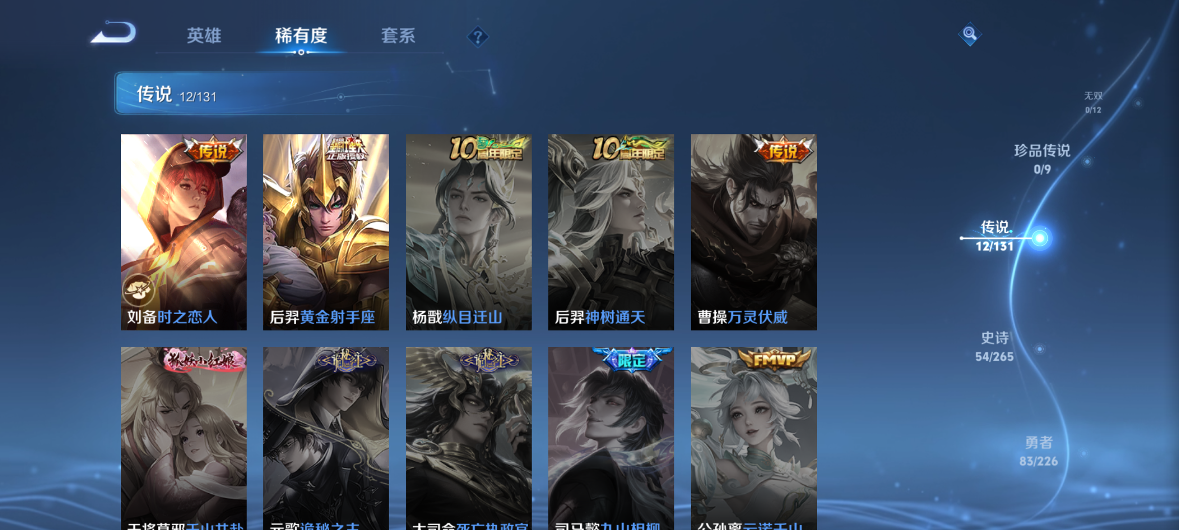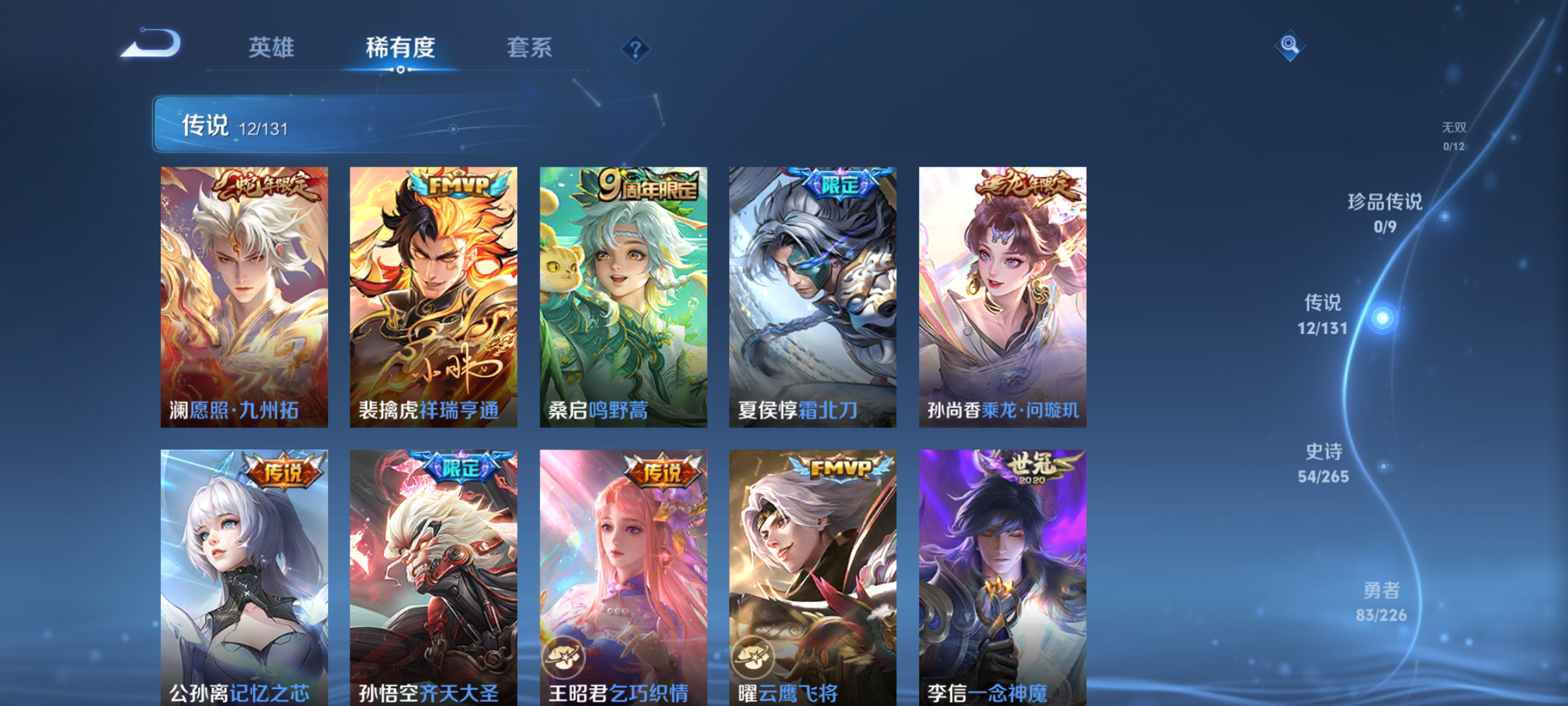 打野号 v7 179皮 1典藏 鸣剑·曳影 12传说 愿照·九州拓,祥瑞亨通,鸣野蒿,乞巧织情,黄金射手座,霜北刀,记忆之芯,时之恋人,乘龙·问璇玑,云鹰飞将,齐天大圣,一念神魔 54史诗 梁祝,千年之狐,百相守梦,石田雨龙,龙之律动,缤纷独角兽,黄金分割率,水晶猎龙者,德古拉伯爵,特工魅影,破空之剑,舞动绿茵,猫狗日记,至尊宝,吟游魔法,心灵骇客,夏日便利店,圣诞狂欢,功夫厨神,青焰无极,鬼剑武藏,蓝屏警告,蔬乡物语,偶像歌手,逐浪之夏,未来纪元,暗隐猎兽者,燃音魔法,女仆咖啡,幽灵船长,冰冠公主,地狱燃心,乱世虎臣,绅士熊喵,冰雪圆舞曲,鹰眼统帅,百相守梦,摇滚巨星,星界游侠,末日机甲,超时空战士,无心,水果甜心,五谷丰年,天才门将,魔术师,暗渊魔法,曙光守护者,紫霞仙子,皇家上将,唤灵魅影,节奏热浪,赏金猎手,魅力维加斯