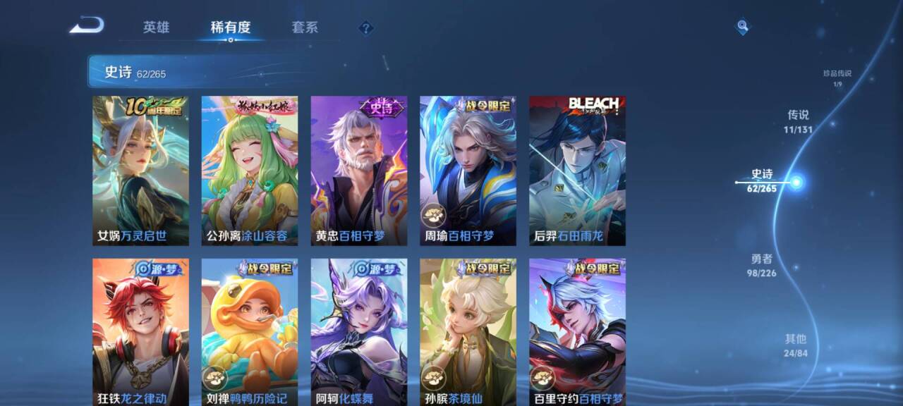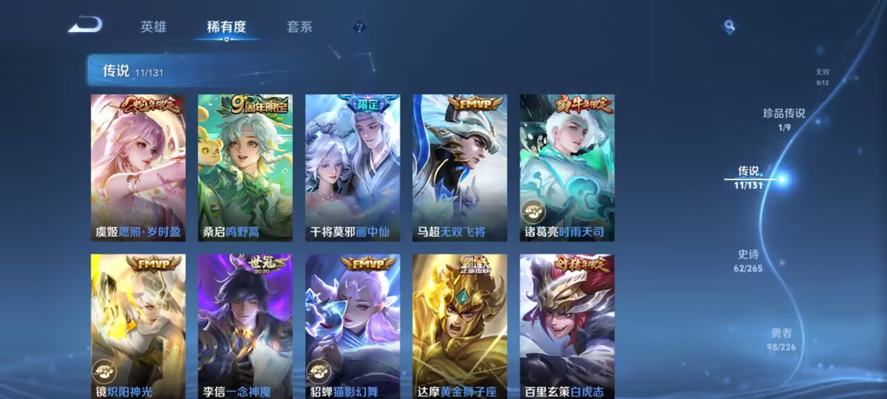 txwz20892-v7 197皮肤 1典藏鸣剑·曳影 1珍品怪盗基德 11传说黄金狮子座,愿照·岁时盈,鸣野蒿,时雨天司,画中仙,无双飞将,炽阳神光,一念神魔,猫影幻舞,白虎志,地狱之眼 62史诗