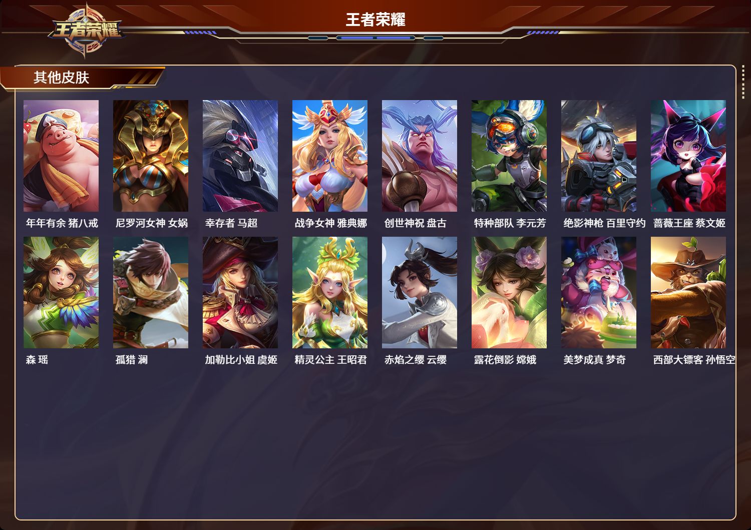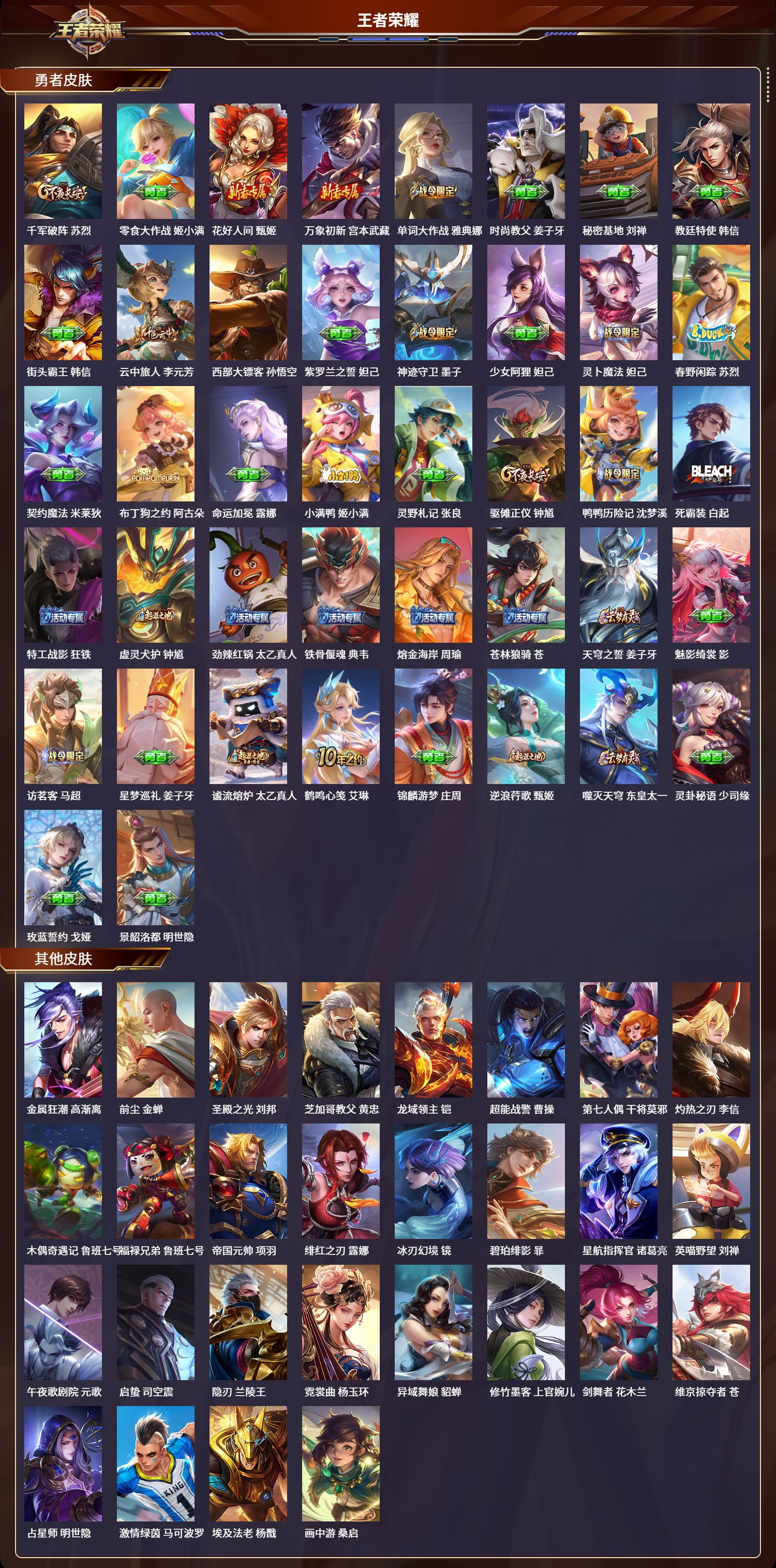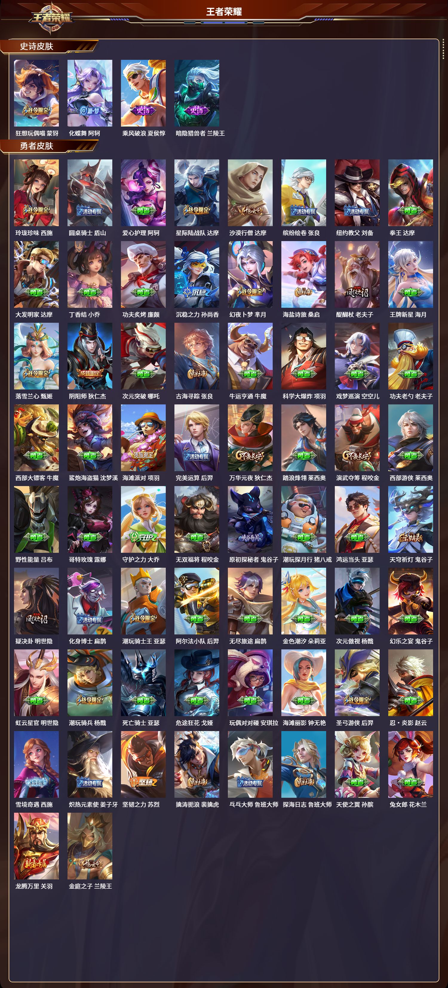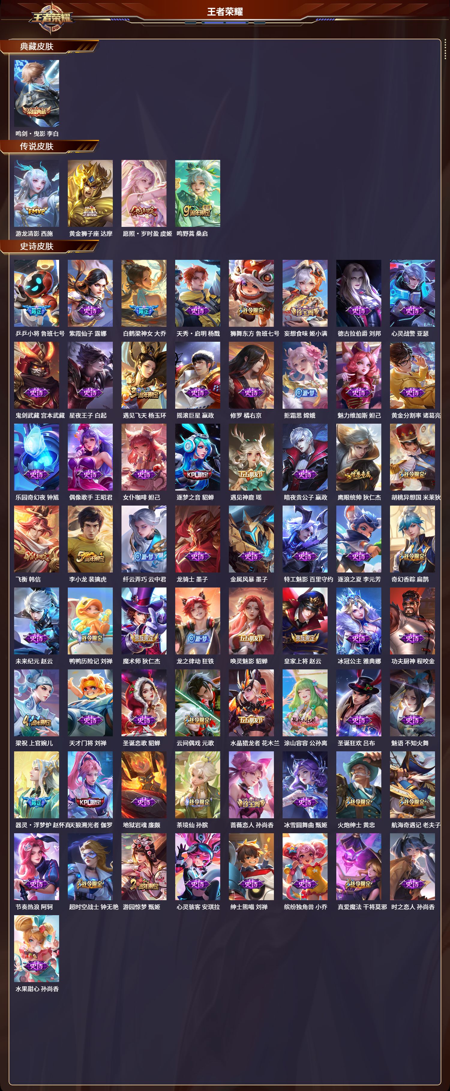 安卓qq/至尊星耀/225皮肤/126英雄/1典藏/0珍品无双/0无双/0珍品传说/4传说/69史诗/8稀有英雄【1 典藏皮肤】鸣剑·曳影 李白【4 传说皮肤】游龙清影 西施黄金狮子座 达摩愿照·岁时盈 虞姬鸣野蒿 桑启【69 史诗皮肤】乒乒小将 鲁班七号紫霞仙子 露娜白鹤梁神女 大乔天秀·启明 杨戬狮舞东方 鲁班七号妄想食味 姬小满德古拉伯爵 刘邦心灵战警 亚瑟鬼剑武藏