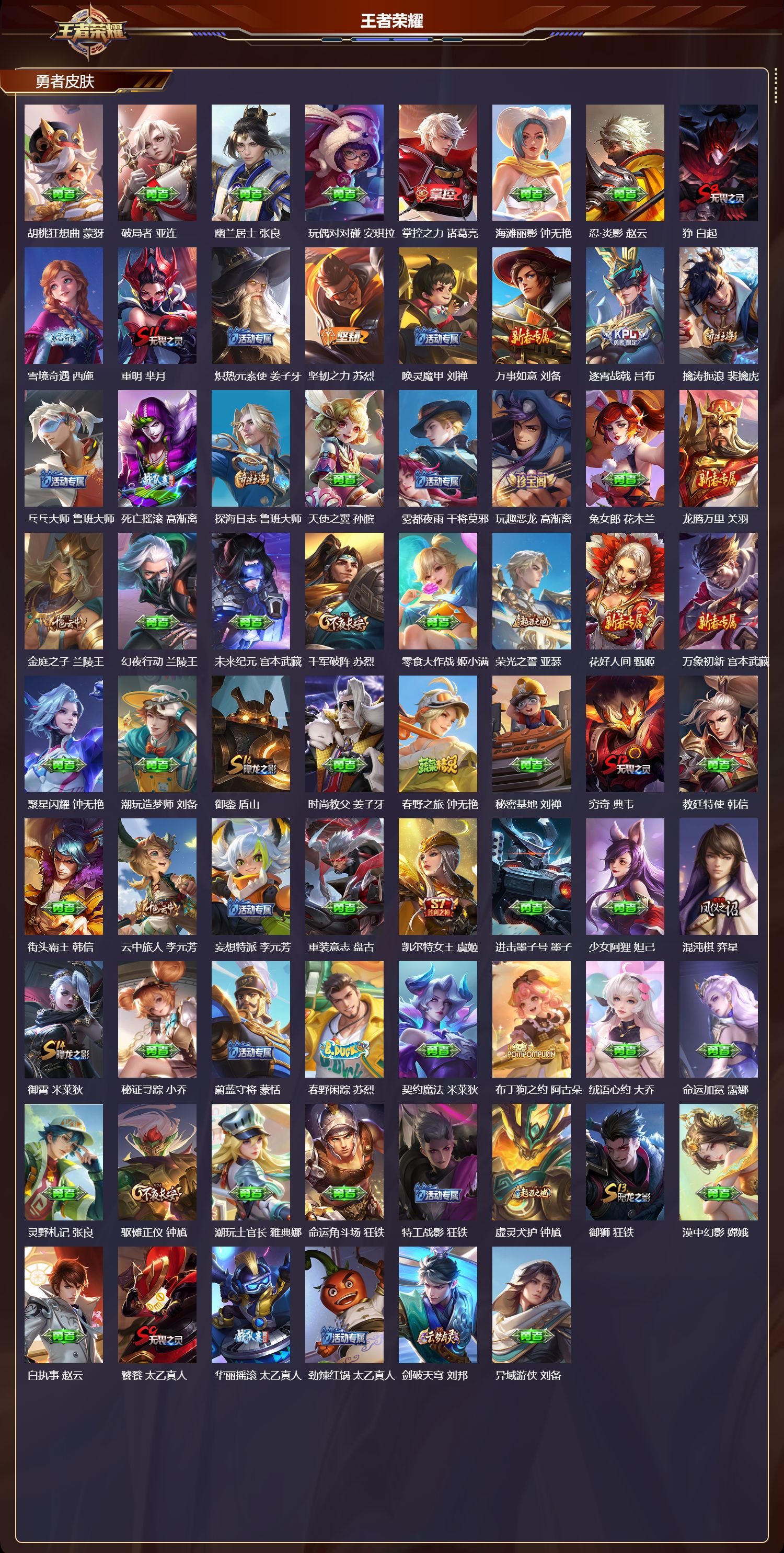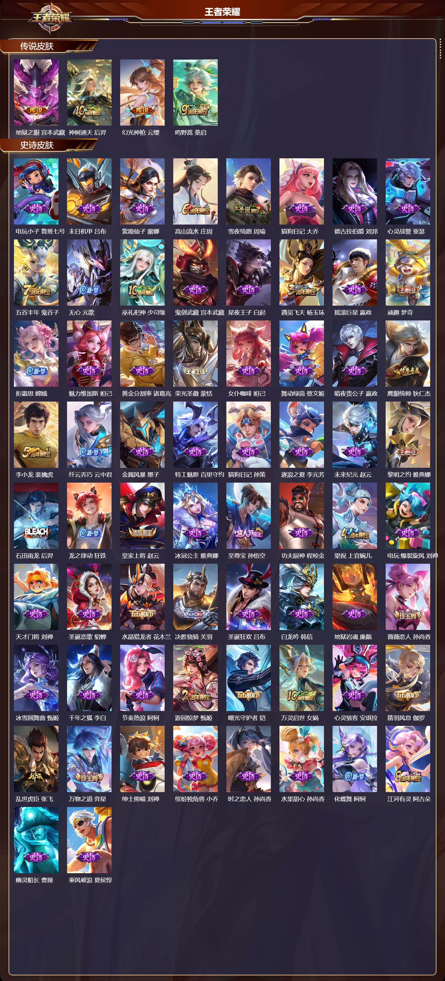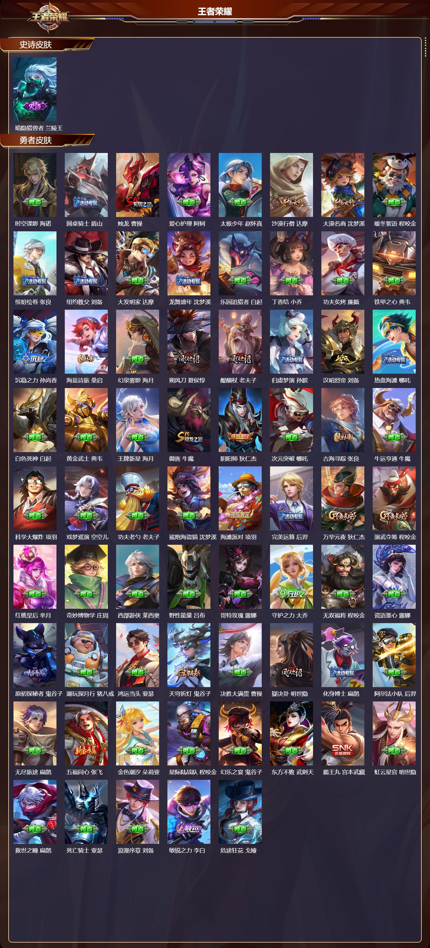 安卓qq/尊贵铂金/287皮肤/127英雄/0典藏/0珍品无双/0无双/0珍品传说/4传说/67史诗/0稀有英雄【4 传说皮肤】地狱之眼 宫本武藏神树通天 后羿幻光神呛 云缨鸣野蒿 桑启【67 史诗皮肤】电玩小子 鲁班七号末日机甲 吕布紫霞仙子 露娜高山流水 庄周雪夜绮愿 周瑜猫狗日记 大乔德古拉伯爵 刘邦心灵战警 亚瑟五谷丰年 鬼谷子无心 元歌巫礼祀神 少司缘鬼剑武