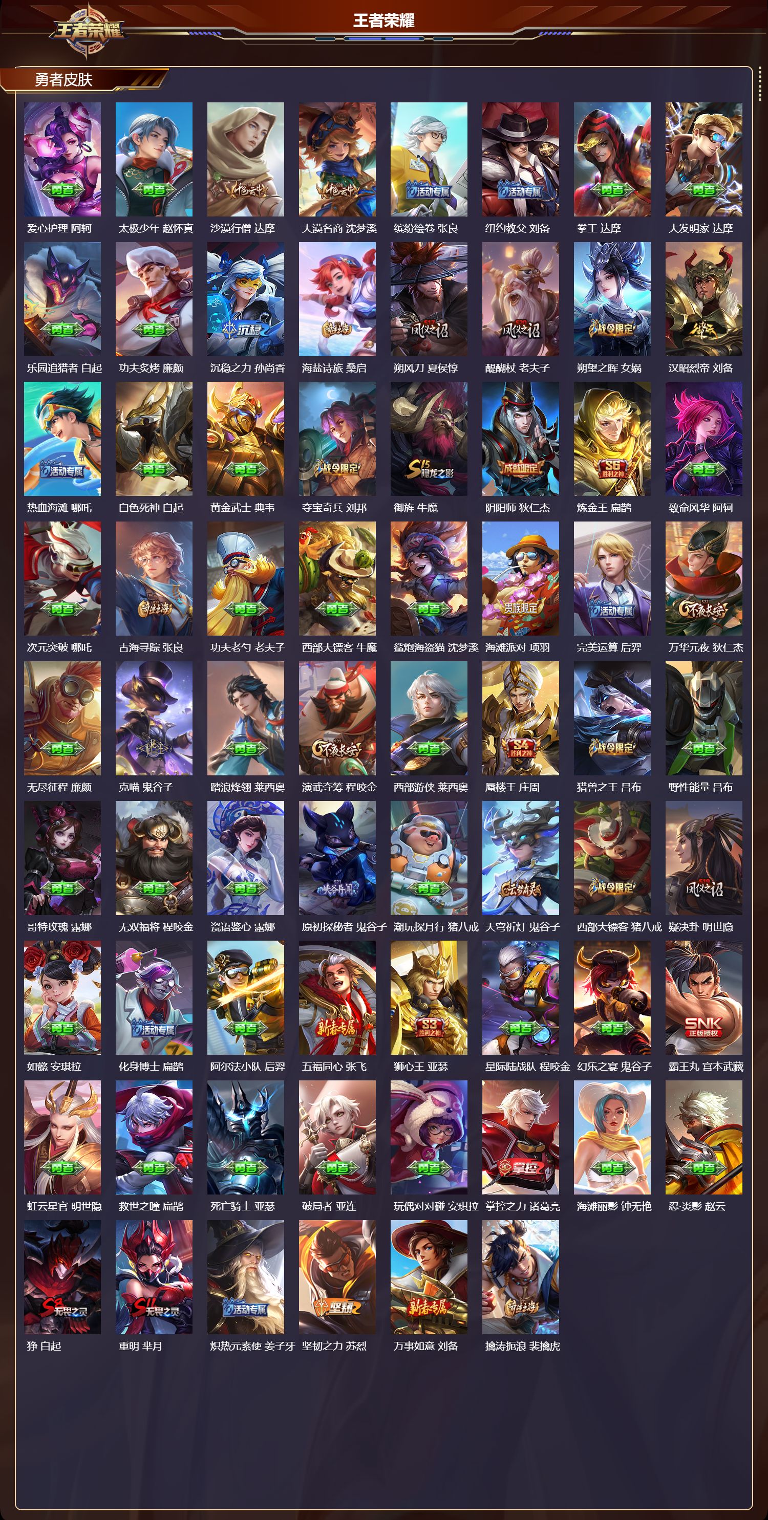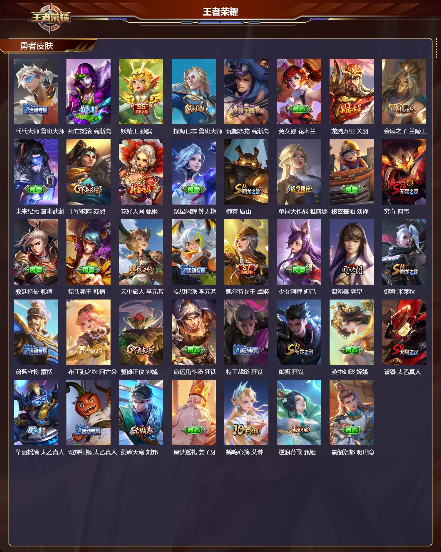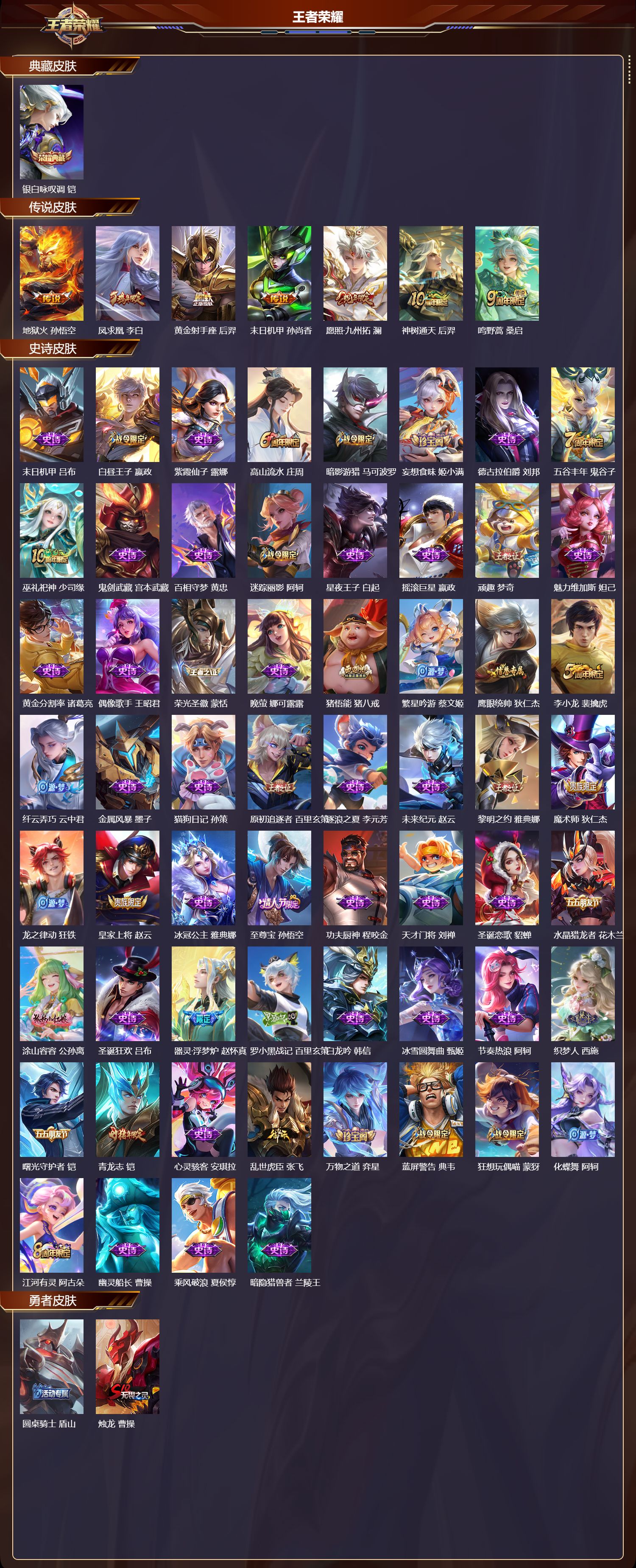 安卓qq/至尊星耀/219皮肤/126英雄/1典藏/0珍品无双/0无双/0珍品传说/7传说/60史诗/0稀有英雄【1 典藏皮肤】银白咏叹调 铠【7 传说皮肤】地狱火 孙悟空凤求凰 李白黄金射手座 后羿末日机甲 孙尚香愿照·九州拓 澜神树通天 后羿鸣野蒿 桑启【60 史诗皮肤】末日机甲 吕布白昼王子 嬴政紫霞仙子 露娜高山流水 庄周暗影游猎 马可波罗妄想食味 姬小满德古拉