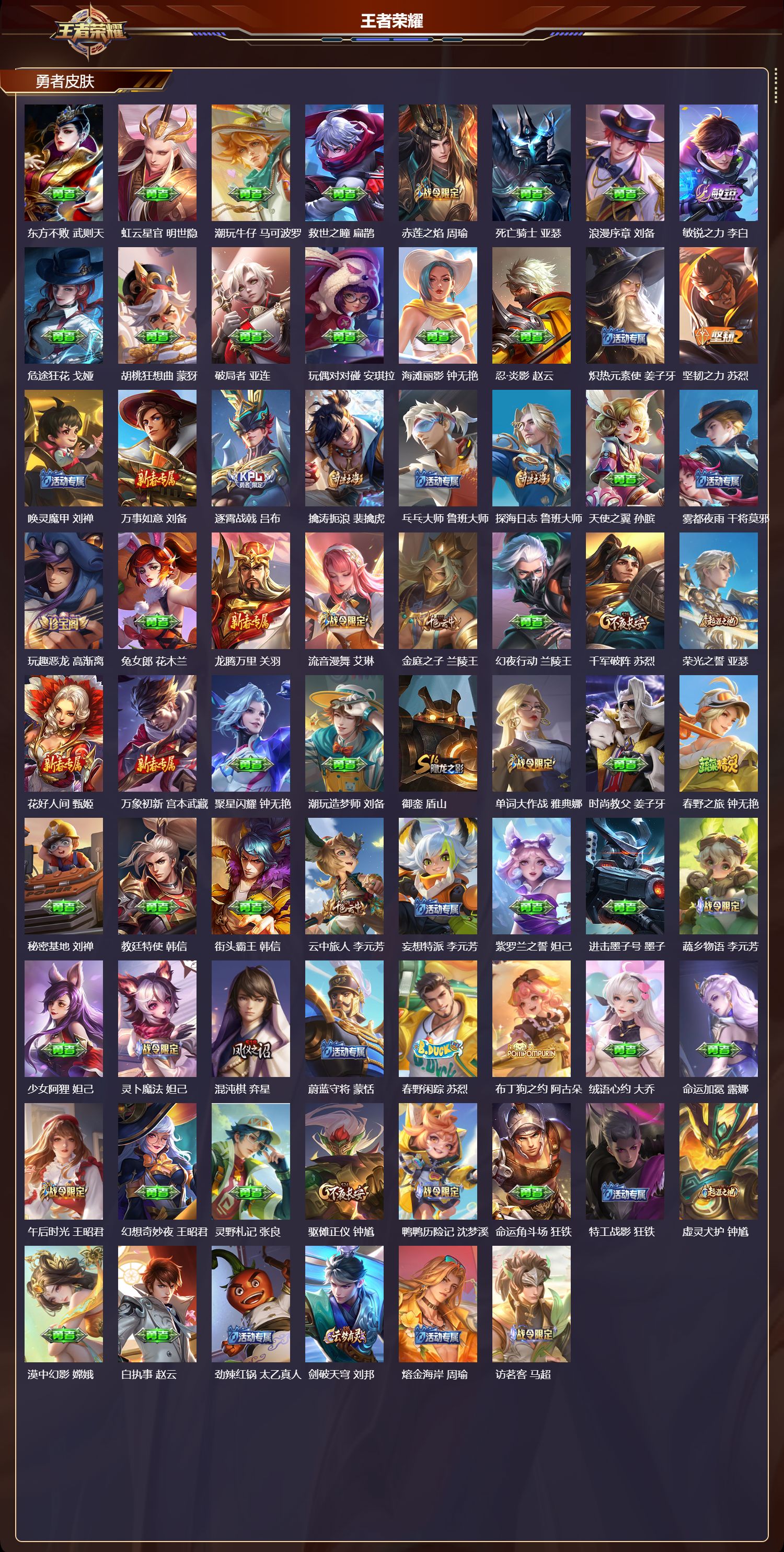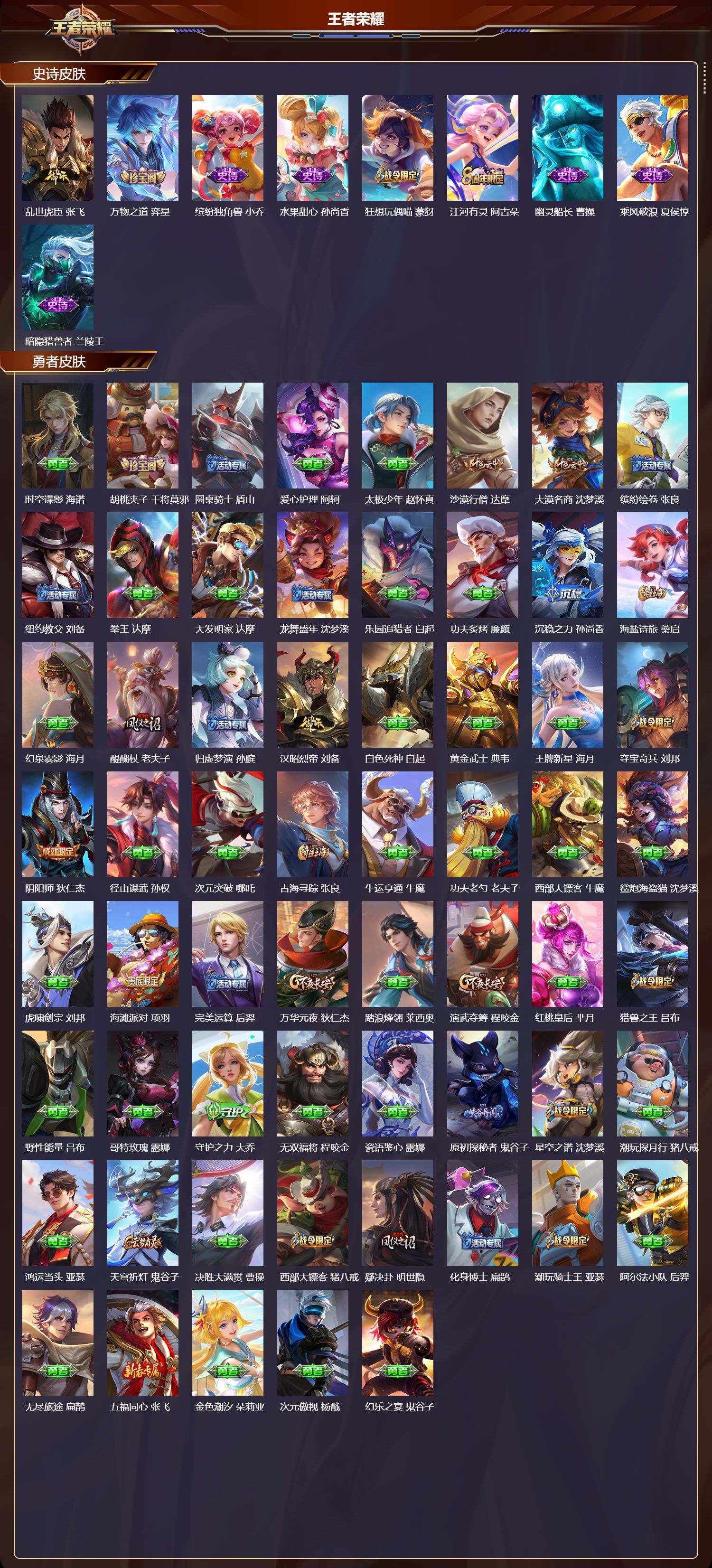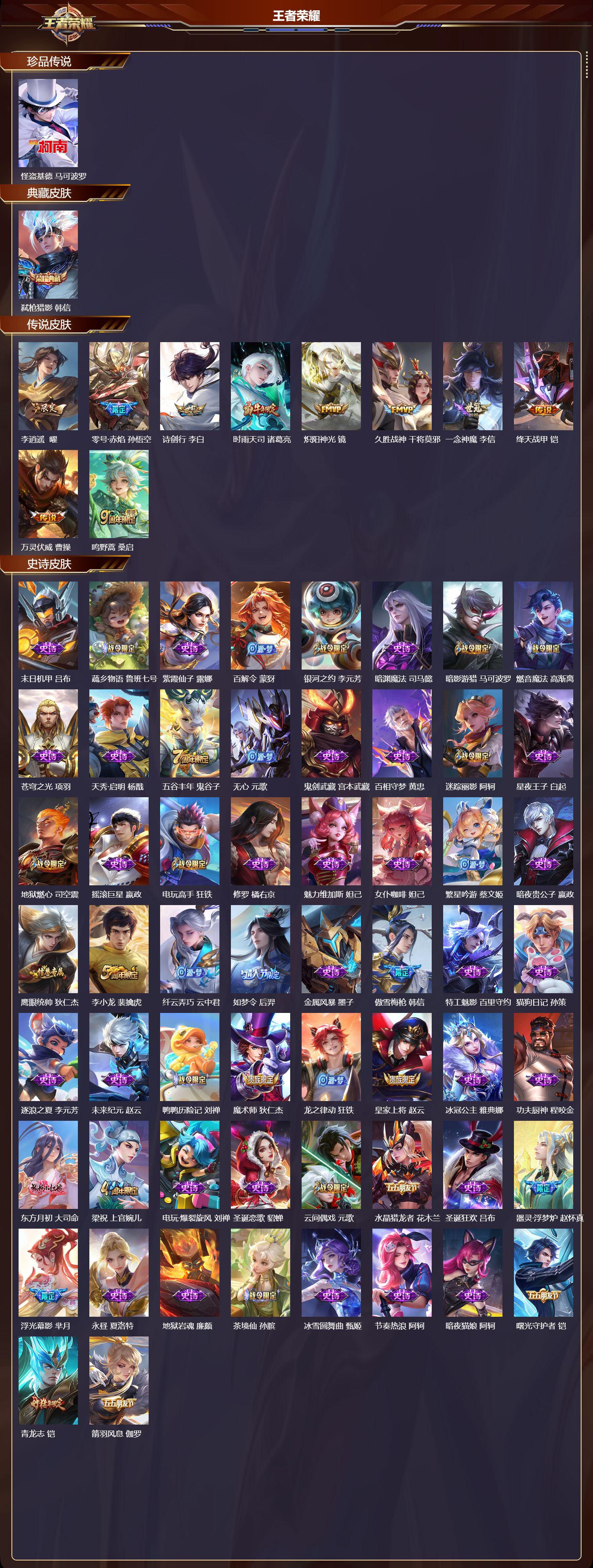 安卓qq/至尊星耀/273皮肤/127英雄/1典藏/0珍品无双/0无双/1珍品传说/10传说/67史诗/0稀有英雄【1 珍品传说】怪盗基德 马可波罗【1 典藏皮肤】弑呛猎影 韩信【10 传说皮肤】李 曜零号·赤焰 孙悟空诗剑行 李白时雨天司 诸葛亮炽阳神光 镜久胜战神 干将莫邪一念神魔 李信绛天战甲 铠万灵伏威 曹操鸣野蒿 桑启【67 史诗皮肤】末日机甲 吕布蔬乡物