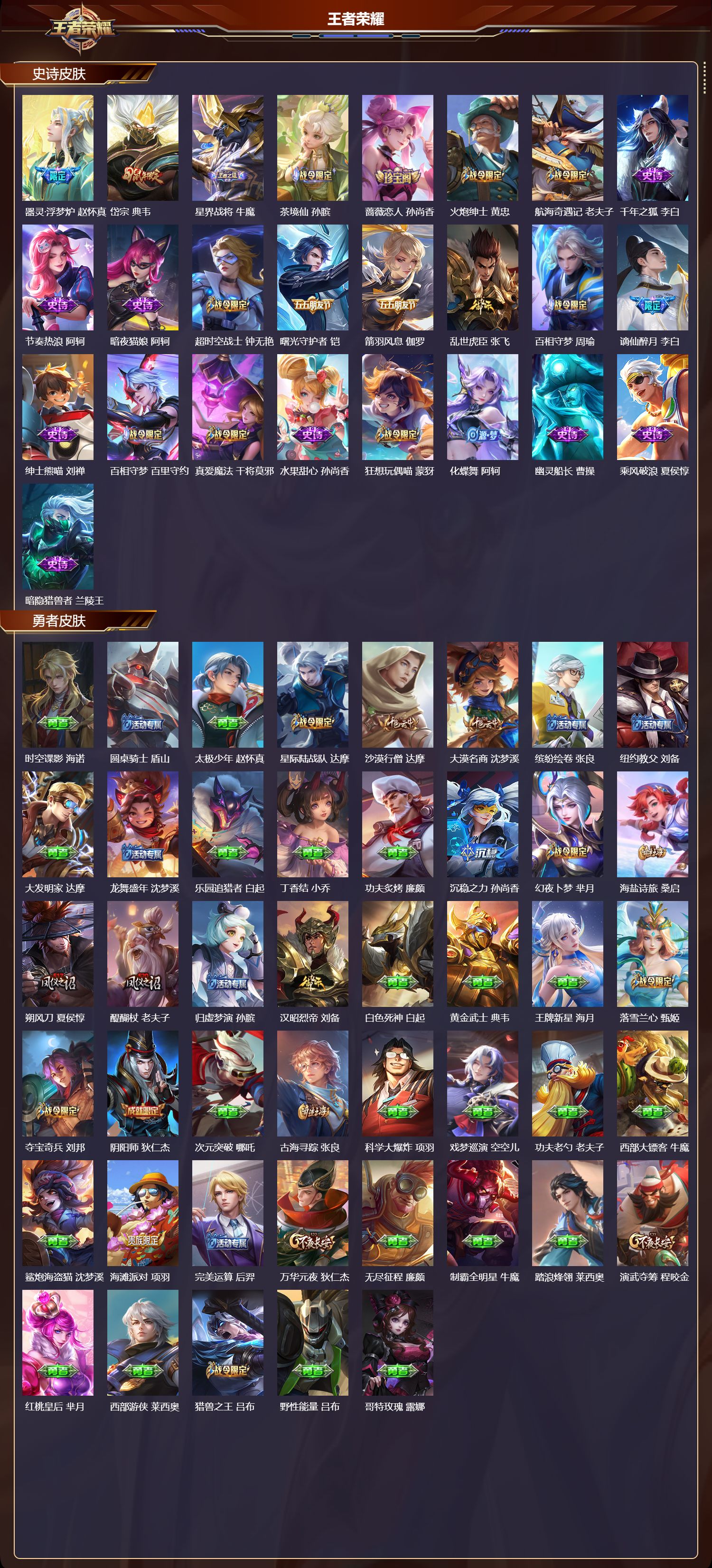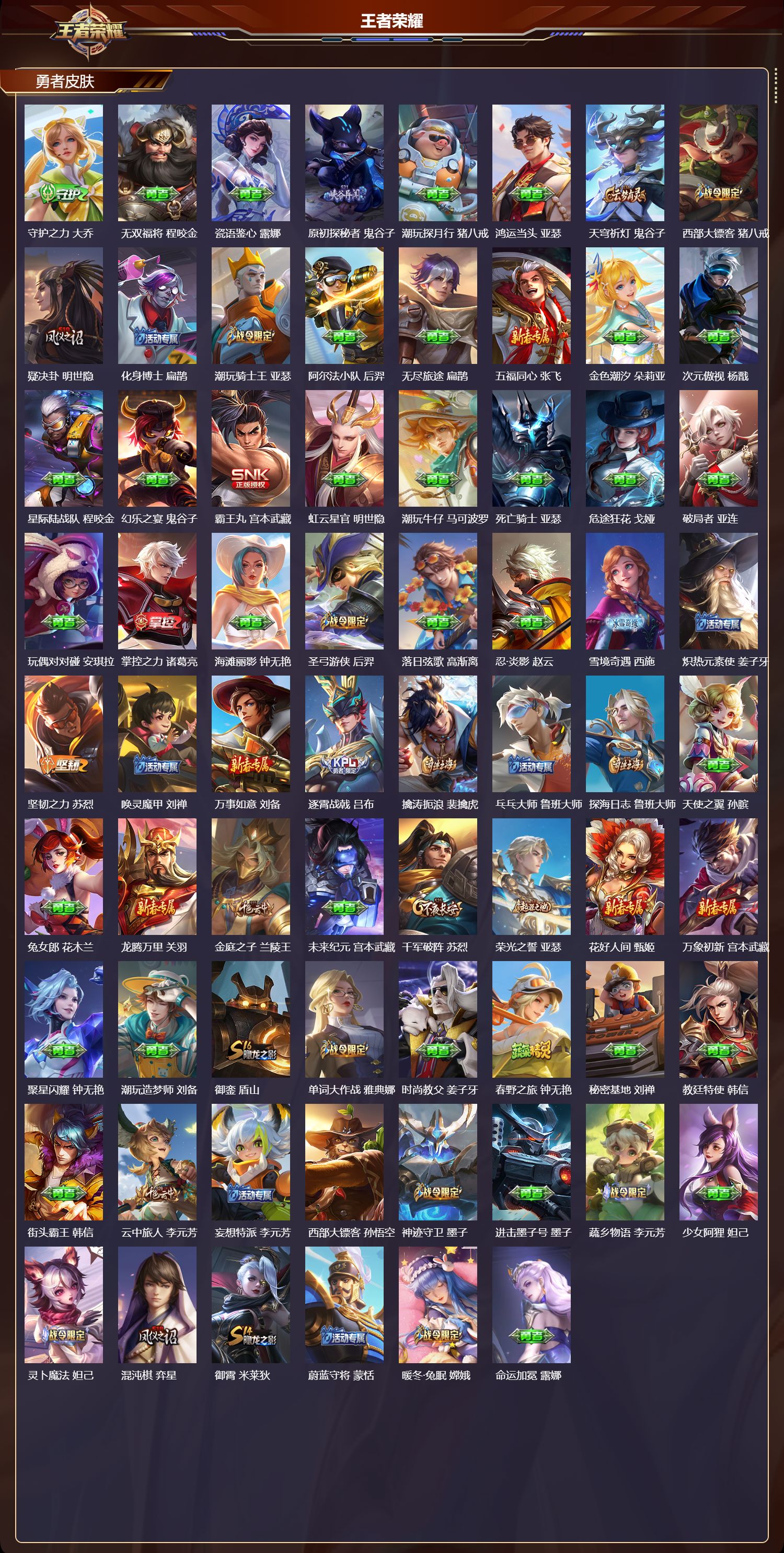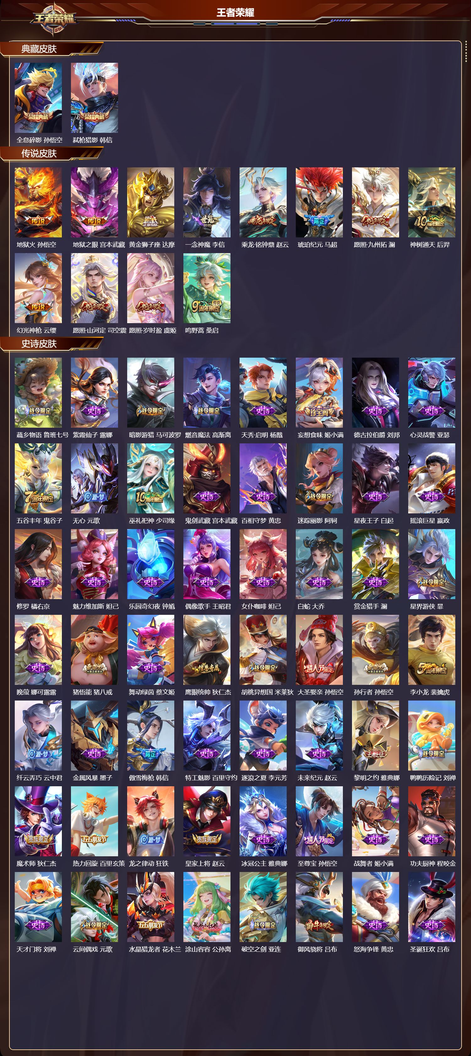 安卓qq/非凡王者/301皮肤/127英雄/2典藏/0珍品无双/0无双/0珍品传说/12传说/81史诗/9稀有英雄【2 典藏皮肤】全息碎影 孙悟空弑呛猎影 韩信【12 传说皮肤】地狱火 孙悟空地狱之眼 宫本武藏黄金狮子座 达摩一念神魔 李信乘龙·铭钟鼎 赵云琥珀纪元 马超愿照·九州拓 澜神树通天 后羿幻光神呛 云缨愿照·山河定 司空震愿照·岁时盈 虞姬鸣野蒿 桑启【81