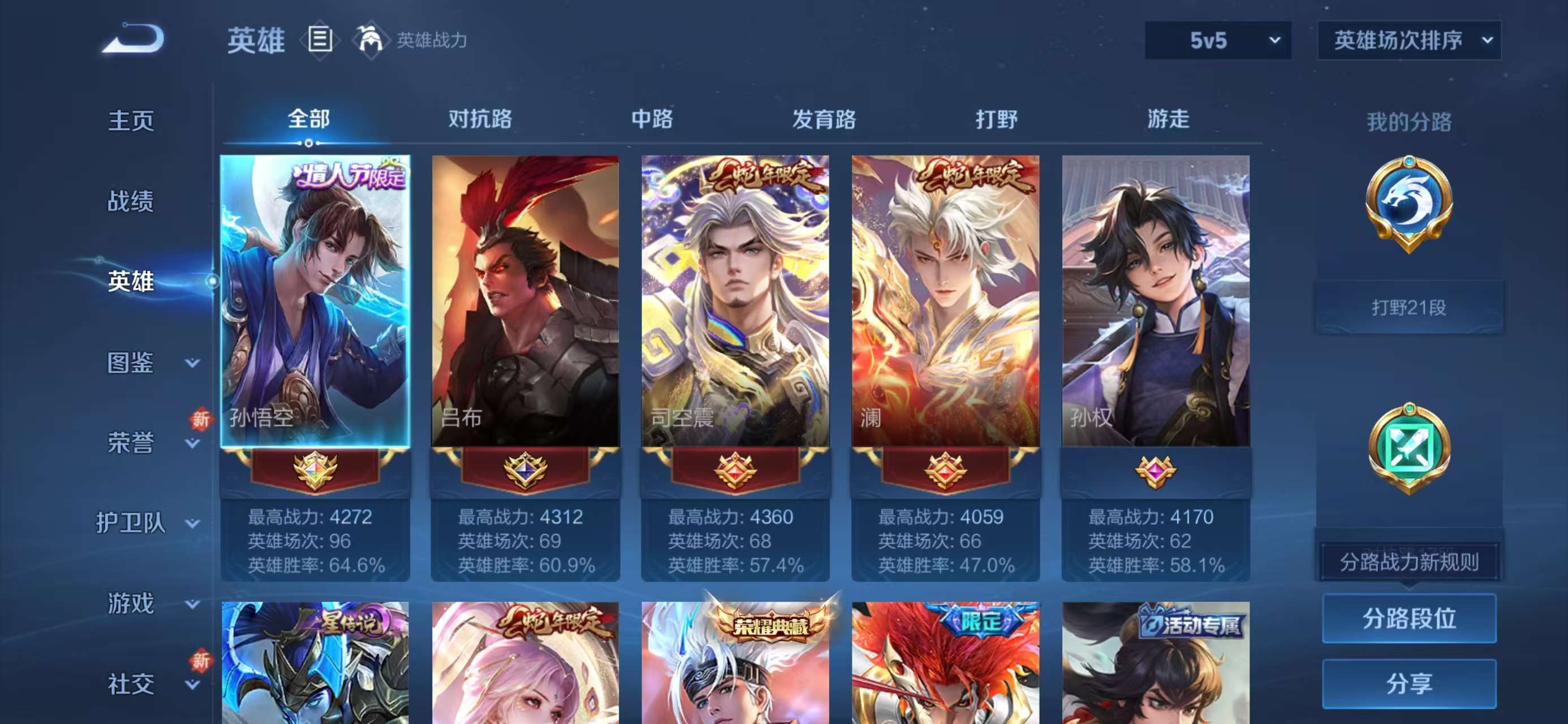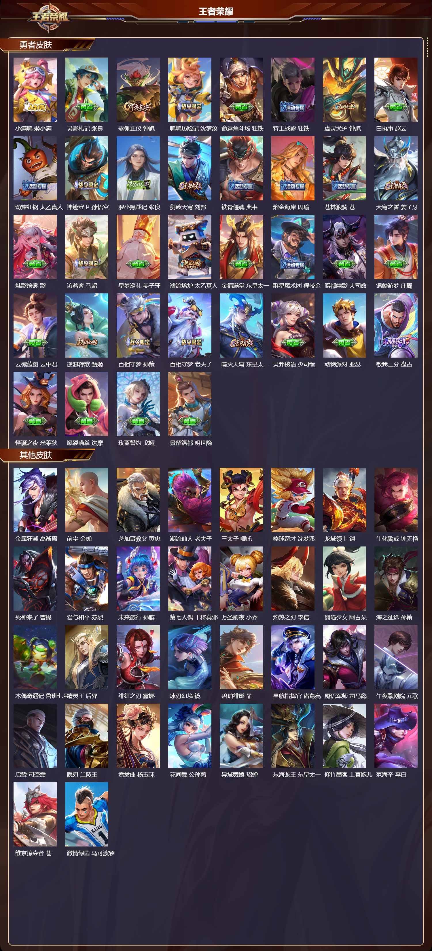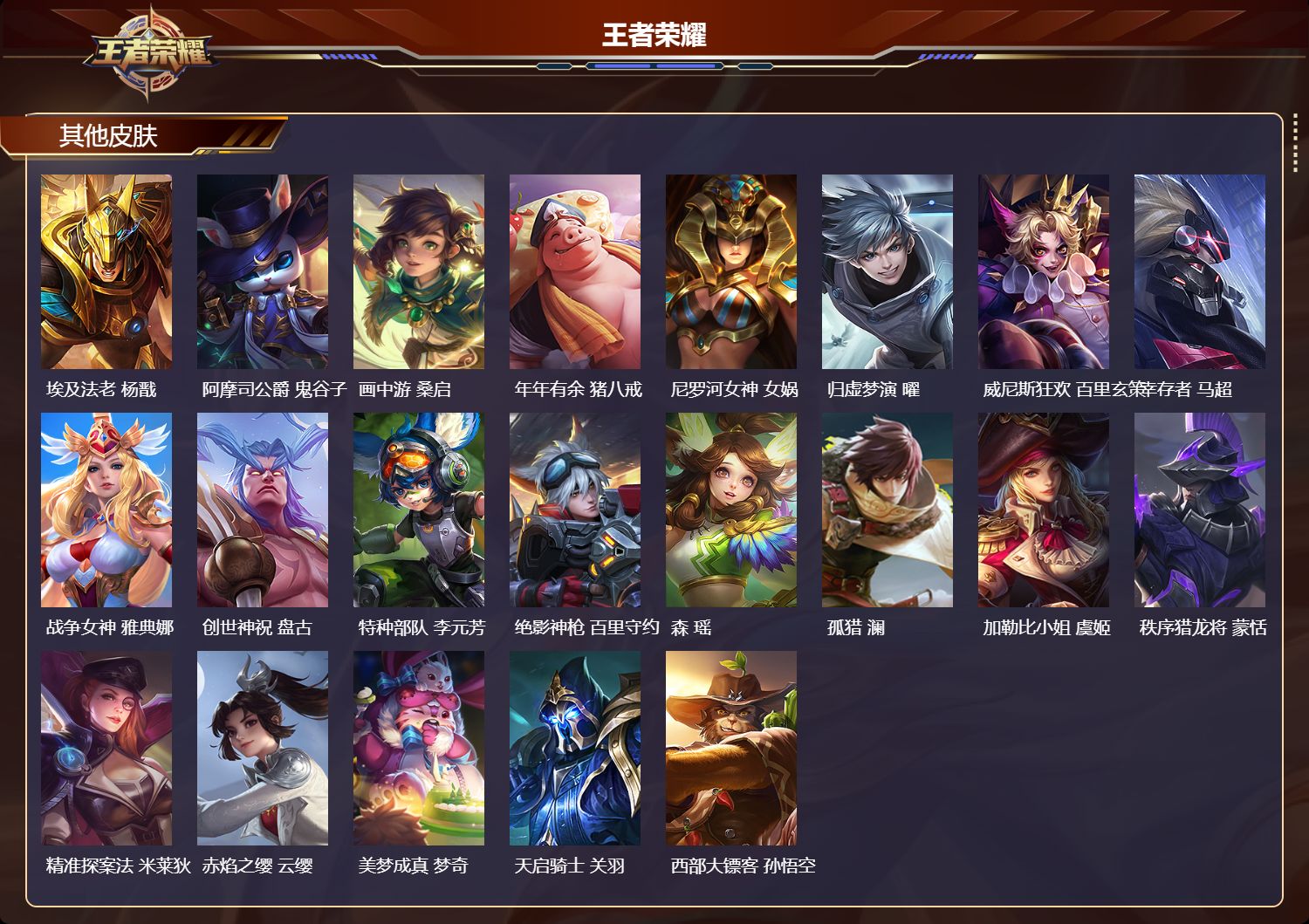 安卓qq/非凡王者/301皮肤/127英雄/2典藏/0珍品无双/0无双/0珍品传说/12传说/81史诗/9稀有英雄【2 典藏皮肤】全息碎影 孙悟空弑呛猎影 韩信【12 传说皮肤】地狱火 孙悟空地狱之眼 宫本武藏黄金狮子座 达摩一念神魔 李信乘龙·铭钟鼎 赵云琥珀纪元 马超愿照·九州拓 澜神树通天 后羿幻光神呛 云缨愿照·山河定 司空震愿照·岁时盈 虞姬鸣野蒿 桑启【81