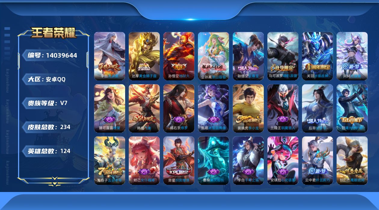 [14039644]【终身售后 找回包赔】安卓手q487区234皮0典藏3传说0无双 营地id212730893包人脸v7最强王者 【优质限定皮肤】:凤求凰至尊宝【传说皮肤】:黄金狮子座凤求凰地狱火【特殊英雄】:嬴政,【史诗皮肤】:涂山容容乱世虎臣炽弈燎原圣诞狂欢星夜王子未来纪元偶像歌手五谷丰年鬼剑武藏心灵战警摇滚巨星金属风暴高山流水心灵骇客航海奇遇记原初追逐者暗隐猎兽者冰锋战神德古拉伯爵女仆咖啡纤云弄巧冰雪圆舞曲李小龙暗影游猎节奏热浪猫狗日记修罗苍穹之光银河之约如梦令特工魅影飞衡晚萤鹰眼统帅驯魔猎人繁星吟游梁祝魔术师黄金分割率狮舞东方王者之锤白昼王子游园惊梦皇家上将至尊宝千年之狐水果甜心黎明之约魅力维加斯幽灵船长化蝶舞绅士熊喵曙光守护者 星元:55星传说:1天幕:1按键:1贵族:7点卷:28皮肤碎片:96荣耀积分:22英雄碎片:155星传说:李白玉鸾吟