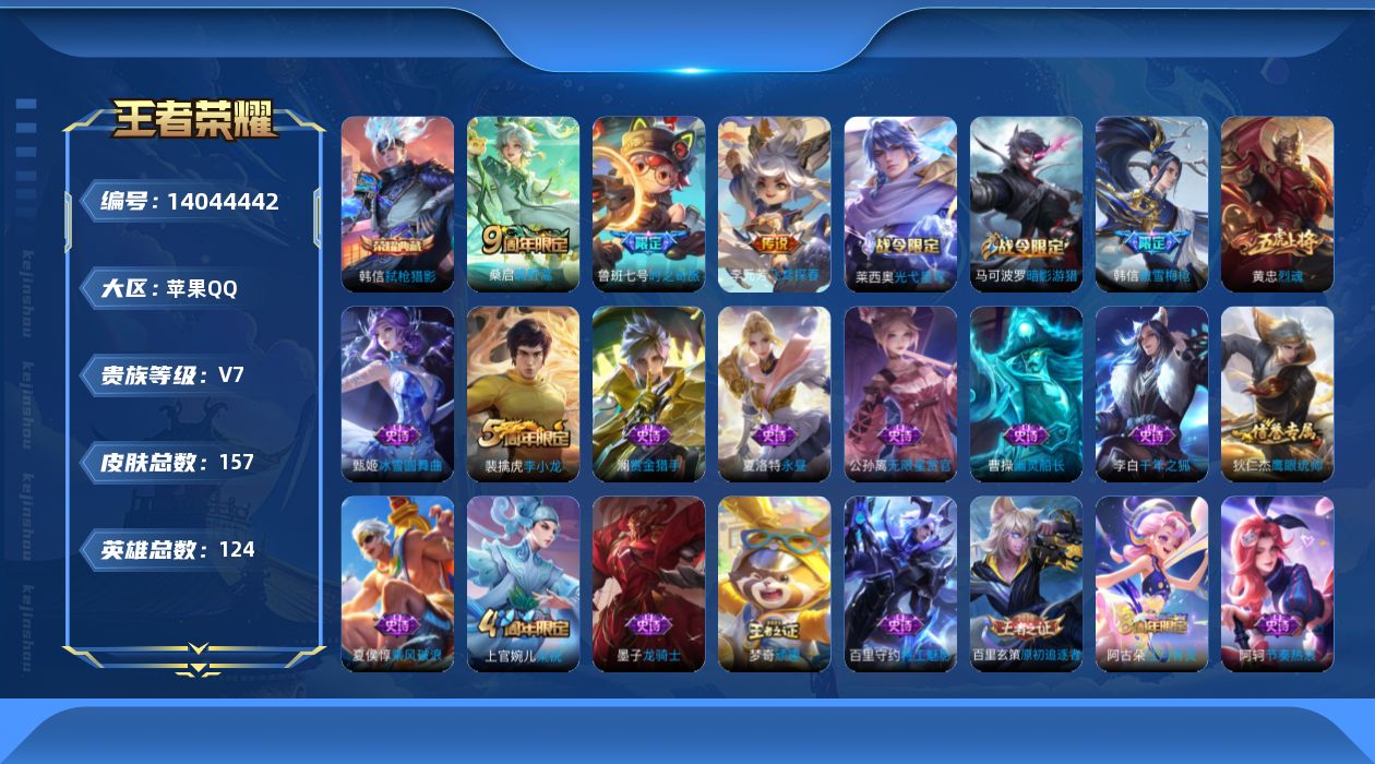 [14044442]金标韩信黄忠曹操,157皮1典藏4传说弑呛猎影神树通天飞鸢探春鸣野蒿时之奇旅,苹果q-v7-最强王者段位-124英雄-157皮肤-1典藏-0珍品无双-0无双-0珍品传说-4传说-38史诗 【英雄全皮】:孙权全皮 【荣耀典藏】:韩信弑呛猎影 【传说皮肤】:后羿神树通天,桑启鸣野蒿,鲁班七号时之奇旅,李元芳飞鸢探春 【限定皮肤】:狄仁杰阴阳师,赵云皇家上将,嬴政白昼王子,鲁班七号时之奇旅,芈月幻夜卜梦,吕布猎兽之王,夏侯惇朔风刀,马可波罗暗影游猎,狄仁杰魔术师,狄仁杰万华元夜,达摩星际陆战队,达摩沙漠行僧,项羽海滩派对,老夫子醍醐杖,程咬金演武夺筹,韩信傲雪梅呛,兰陵王金庭之子,亚瑟潮玩骑士王,李元芳云中旅人,钟馗驱傩正仪,雅典娜单词大作战,雅典娜黎明之约,蔡文姬繁星吟游,鬼谷子原初探秘者,黄忠烈魂,黄忠火炮绅士,苏烈千军破阵,百里玄策原初追逐者,弈星混沌棋,梦奇顽趣,沈梦溪大漠名商,明世隐疑决卦,裴擒虎李小龙,裴擒虎擒涛扼浪,狂铁御狮,米莱狄御霄,米莱狄胡桃异想国,猪八戒西部大镖客,上官婉儿梁祝,鲁班大师探海日志,桑启海盐诗旅,艾琳女武神,阿古朵江河有灵,张良古海寻踪,鬼谷子天穹祈灯,沈梦溪龙舞盛年 【年限皮肤】:黄忠烈魂 【赛季限定】:夏侯惇朔风刀,狄仁杰万华元夜,达摩沙漠行僧,老夫子醍醐杖,程咬金演武夺筹,兰陵王金庭之子,张良古海寻踪,李元芳云中旅人,钟馗驱傩正仪,雅典娜黎明之约,鬼谷子原初探秘者,苏烈千军破阵,百里玄策原初追逐者,弈星混沌棋,梦奇顽趣,沈梦溪大漠名商,明世隐疑决卦,裴擒虎擒涛扼浪,狂铁御狮,米莱狄御霄,鲁班大师探海日志,桑启海盐诗旅,鬼谷子天穹祈灯 【战令限定】:嬴政白昼王子,芈月幻夜卜梦,吕布猎兽之王,马可波罗暗影游猎,达摩星际陆战队,亚瑟潮玩骑士王,雅典娜单词大作战,黄忠火炮绅士,米莱狄胡桃异想国,猪八戒西部大镖客 【史诗皮肤】:赵云皇家上将,貂蝉圣诞恋歌,甄姬冰雪圆舞曲,王昭君偶像歌手,狄仁杰魔术师,宫本武藏鬼剑武藏,孙尚香水果甜心,妲己魅力维加斯,墨子龙骑士,吕布圣诞狂欢,曹操幽灵船长,李白千年之狐,韩信白龙吟,夏侯惇乘风破浪,小乔缤纷独角兽,百里守约特工魅影,李元芳逐浪之夏,程咬金功夫厨神,阿轲节奏热浪,嬴政白昼王子,孙策猫狗日记,狄仁杰鹰眼统帅,公孙离无限星赏官,上官婉儿梁祝,蔡文姬繁星吟游,黄忠烈魂,马可波罗暗影游猎,百里玄策原初