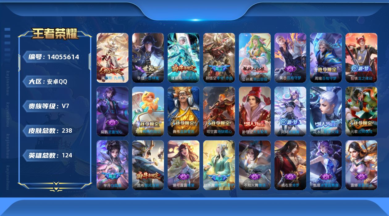 [14055614]【终身售后 找回包赔】安卓手q404区238皮0典藏4传说0无双 营地id371598679可二次v7最强王者 【传说皮肤】:愿照·九州拓一念神魔时雨天司零号·赤焰【特殊英雄】:嬴政,【史诗皮肤】:千年之狐涂山容容百相守梦百相守梦灵蛊蚀心箭羽风息偶像歌手女仆咖啡鸭鸭历险记龙之律动特工魅影化蝶舞紫霞仙子曙光守护者器灵·浮梦炉修罗茶境仙缤纷独角兽舞动绿茵月团寄思乐园奇幻夜晚萤暗隐猎兽者水晶猎龙者燃音魔法逐浪之夏绅士熊喵纤云弄巧地狱燃心拒霜思百解令冰雪圆舞曲乘风破浪江河有灵摇滚巨星心灵战警未来纪元末日机甲魅语时之恋人鬼剑武藏无心超时空战士心灵骇客五谷丰年地狱岩魂云间偶戏默契交锋魔术师御风骁将白晶晶白龙吟繁星吟游大圣娶亲驯魔猎人蓝屏警告迷踪丽影狮舞东方李小龙魅力维加斯圣诞恋歌圣诞狂欢幽灵船长皇家上将鹰眼统帅银河之约梁祝星夜王子水果甜心节奏热浪 星元:37按键:5贵族:7点卷:18皮肤碎片:104荣耀积分:28英雄碎片:562
