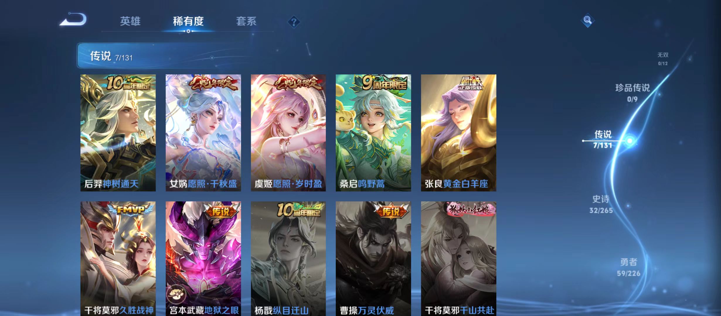 v5-117皮肤 7传说神树通天,地狱之眼,黄金白羊座,久胜战神,愿照·岁时盈,愿照·千秋盛,鸣野蒿 32史诗