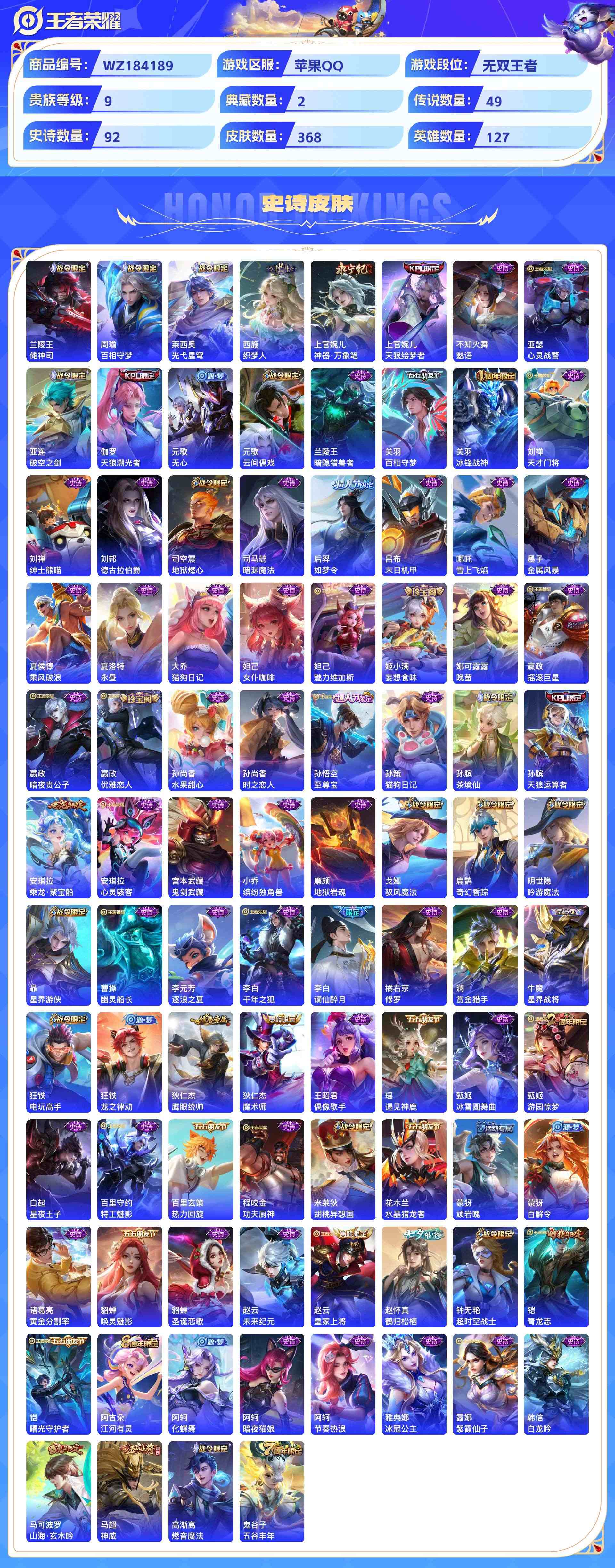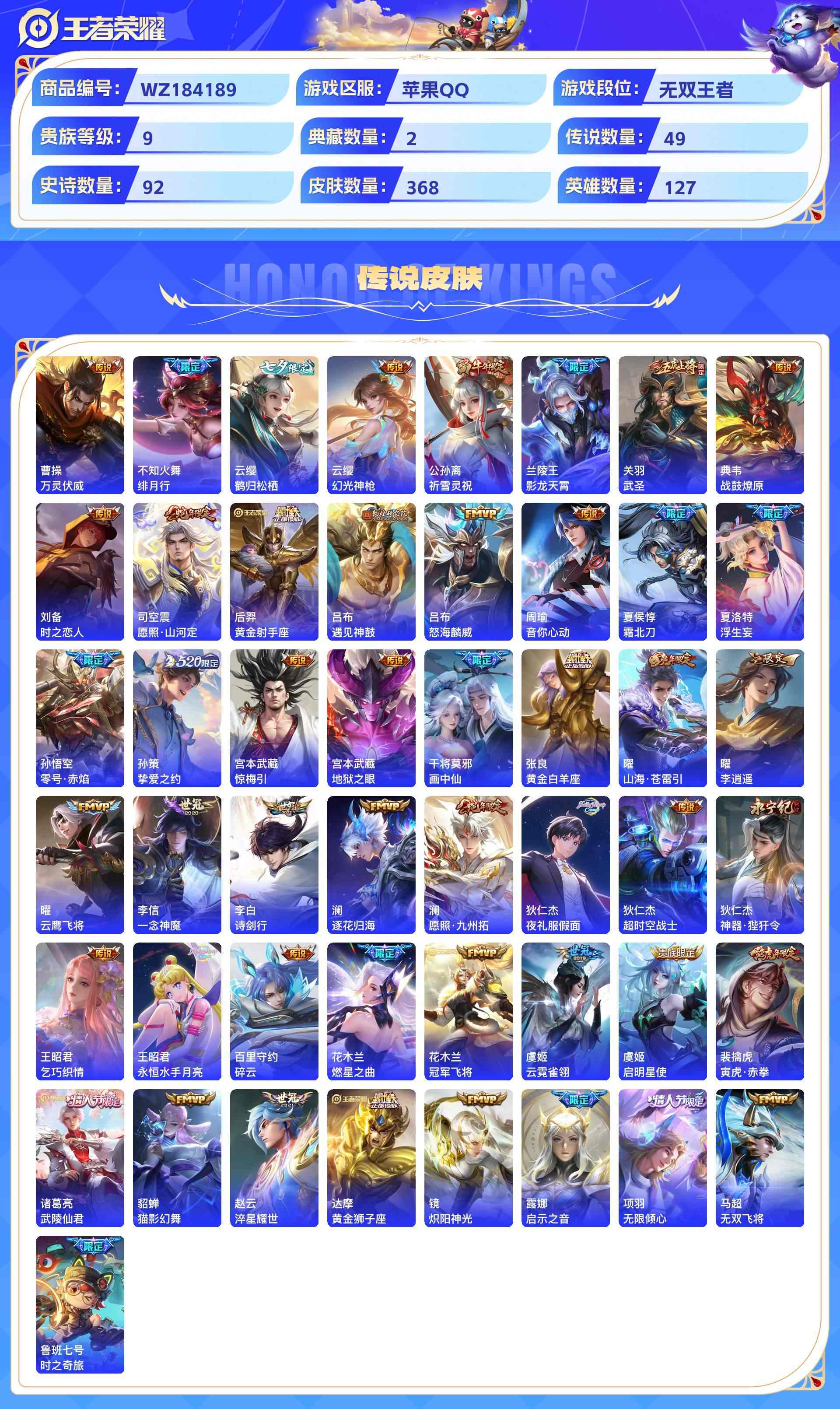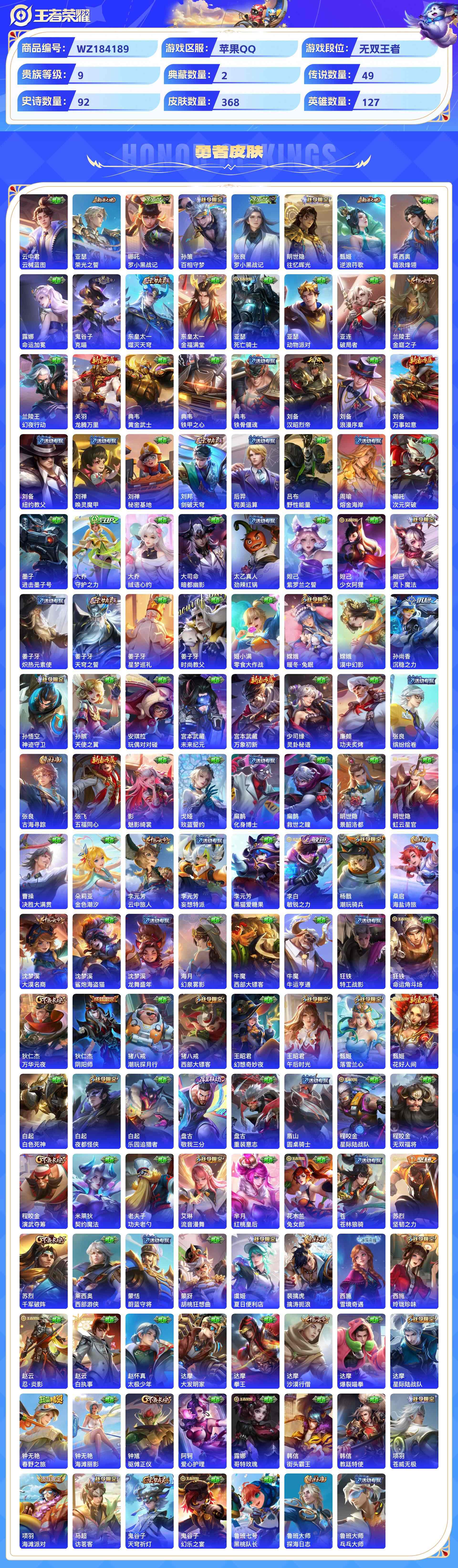 wz184189|精品号苹果qq 贵族9级 368皮 2典藏(最初的交响弑呛猎影) 1珍品传说(器灵·落星盏) 2无双(神罪碎月剑心) 49传说(万灵伏威绯月行鹤归松栖幻光神呛祈雪灵祝影龙天霄) 92史诗1星传说24个性按键1天幕连体和平12粉装8粉呛 2车