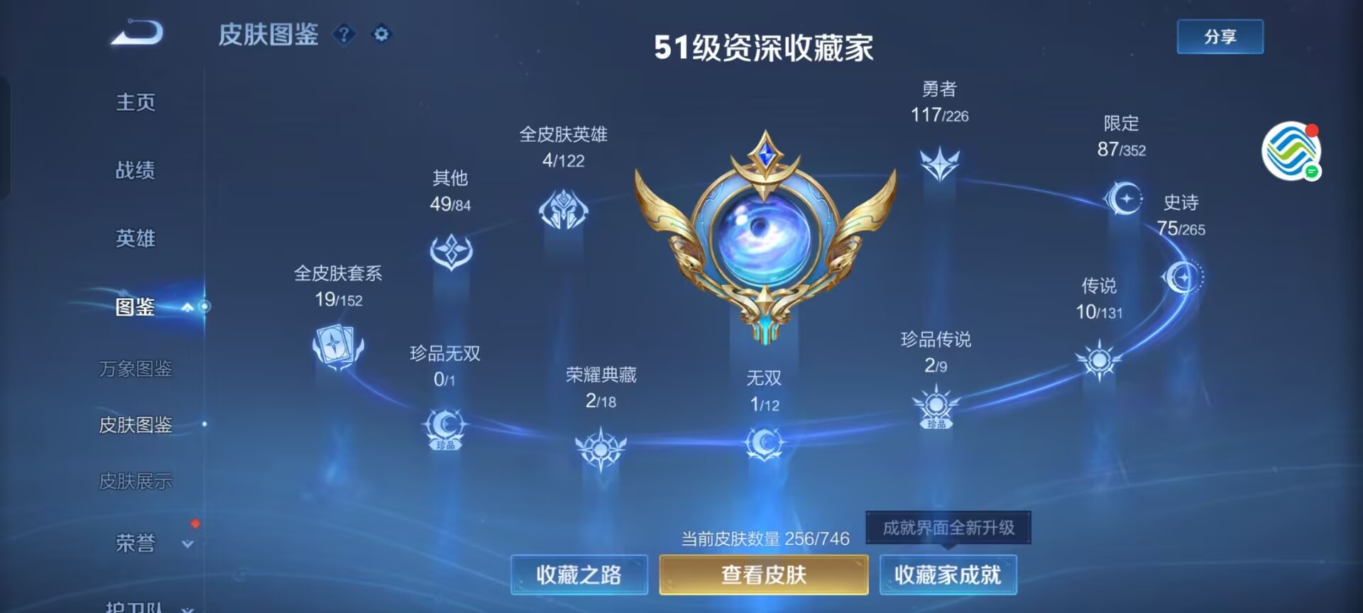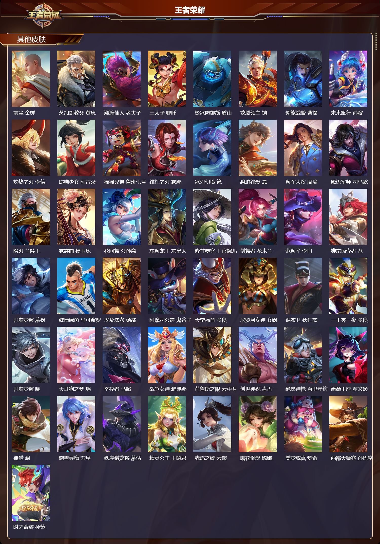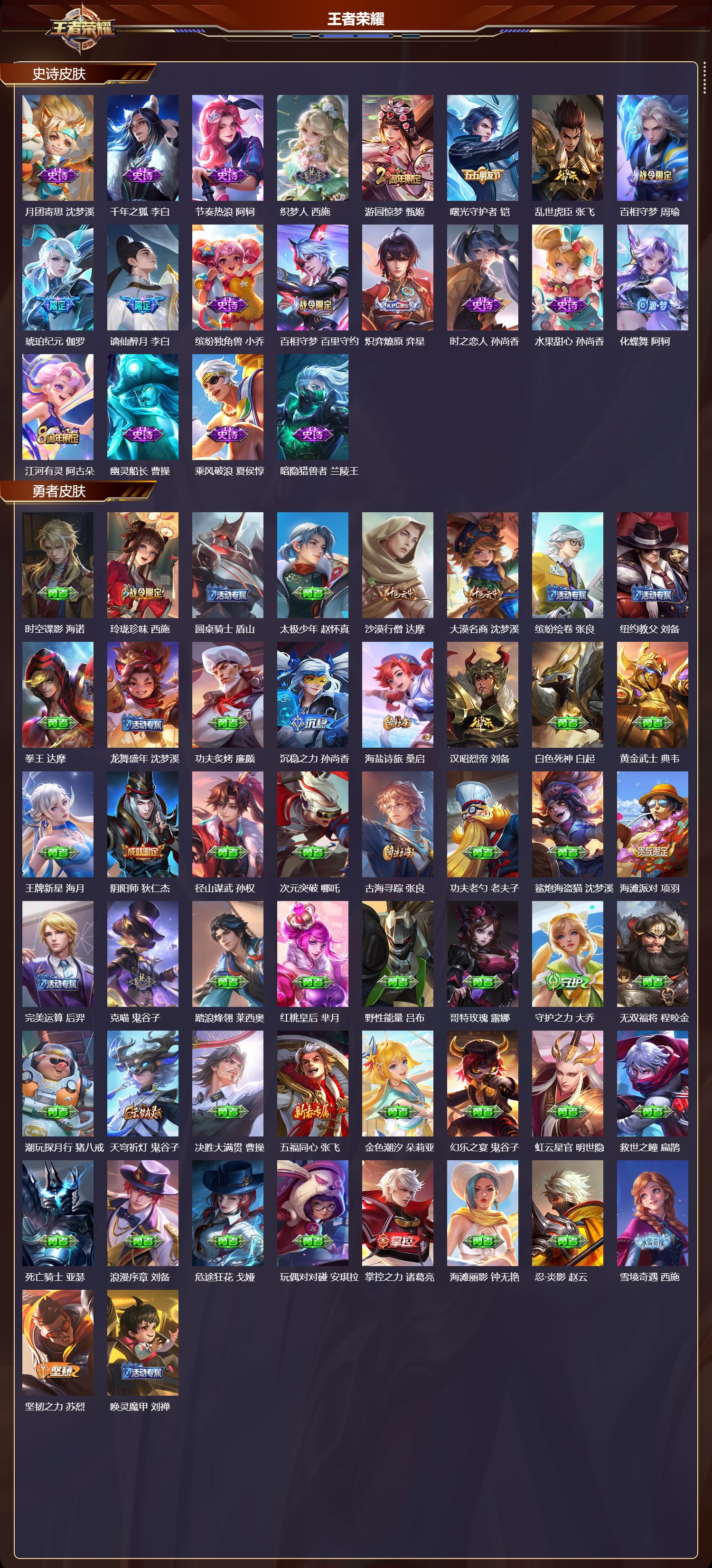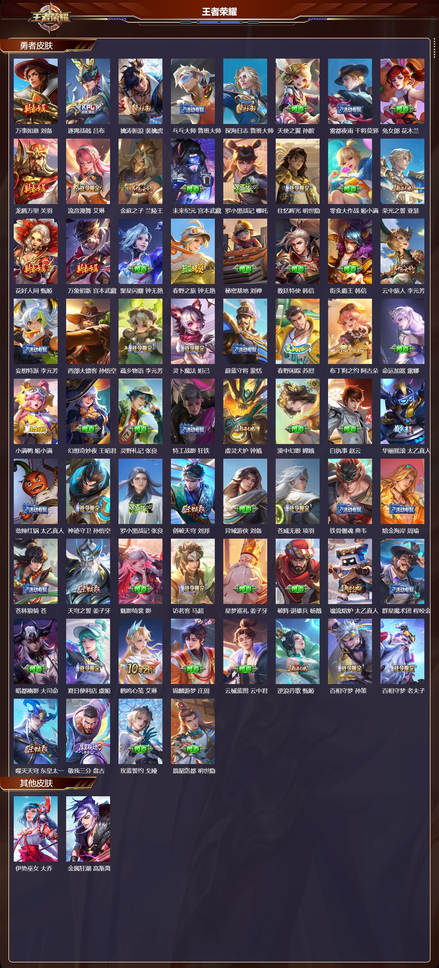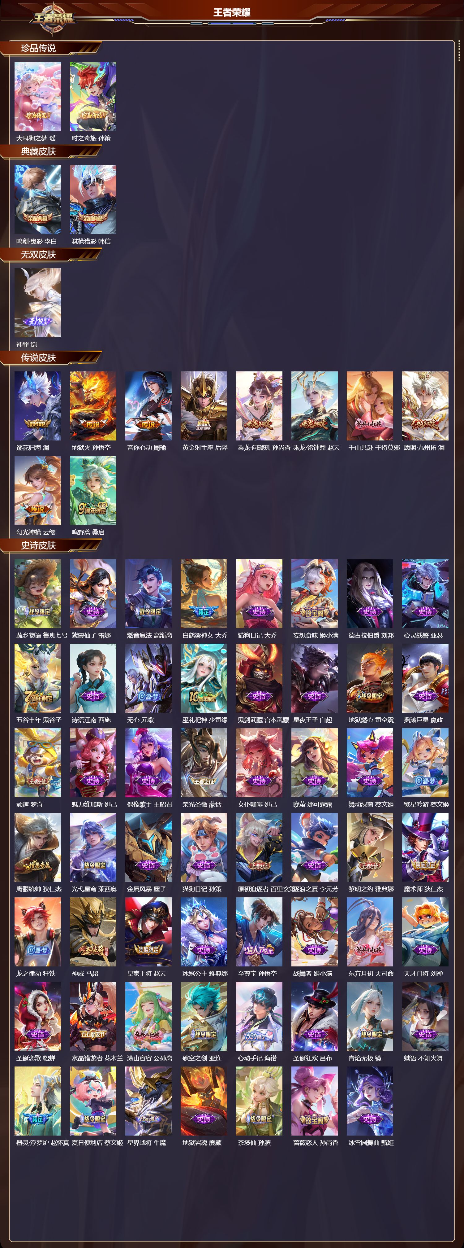 安卓qq/荣耀王者/256皮肤/127英雄/2典藏/0珍品无双/1无双/2珍品传说/10传说/75史诗/9稀有英雄【2 珍品传说】大耳狗之梦 瑶时之奇旅 孙策【2 典藏皮肤】鸣剑·曳影 李白弑呛猎影 韩信【1 无双皮肤】神罪 铠【10 传说皮肤】逐花归海 澜地狱火 孙悟空音你心动 周瑜黄金射手座 后羿乘龙·问璇玑 孙尚香乘龙·铭钟鼎 赵云千山共赴 干将莫邪愿照·九州拓 澜