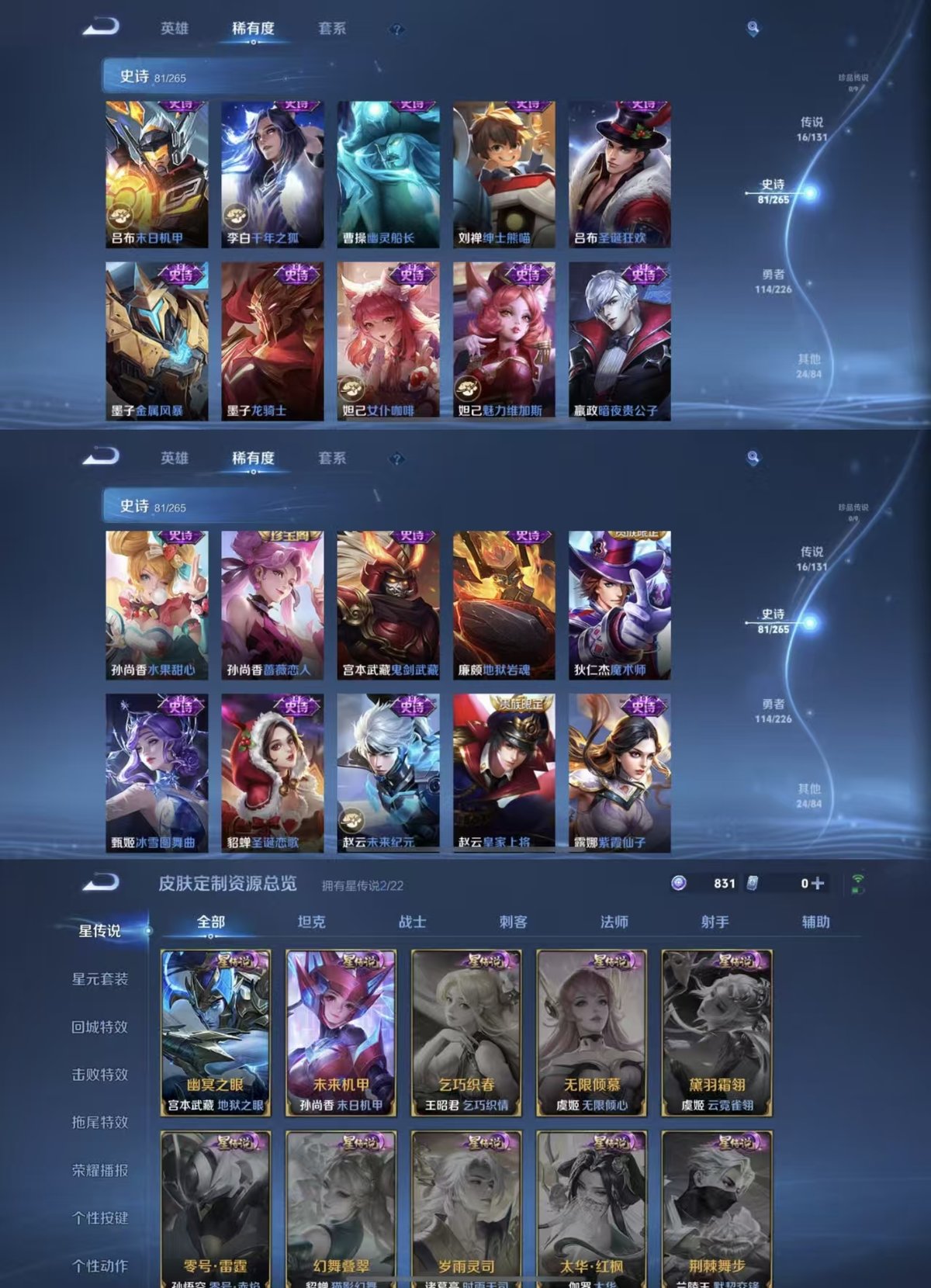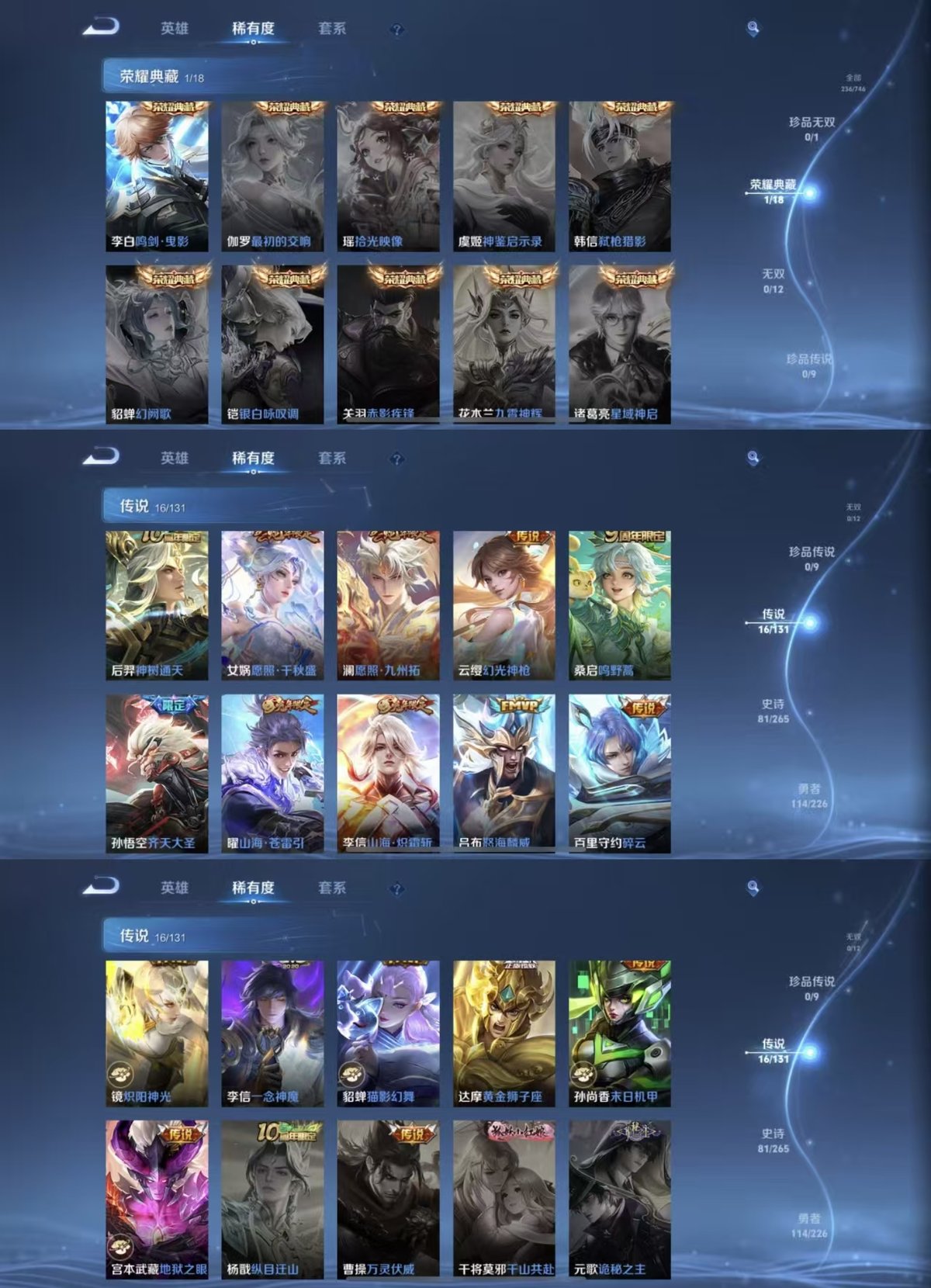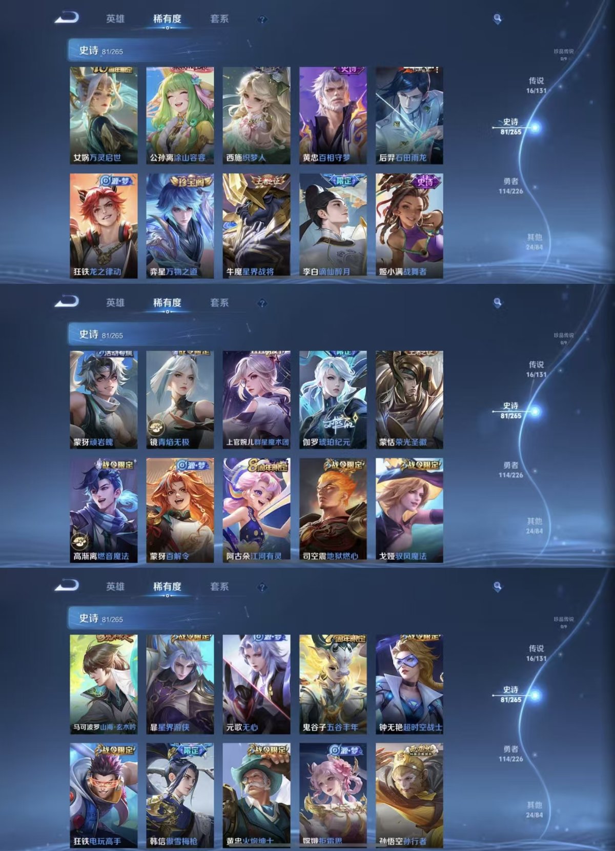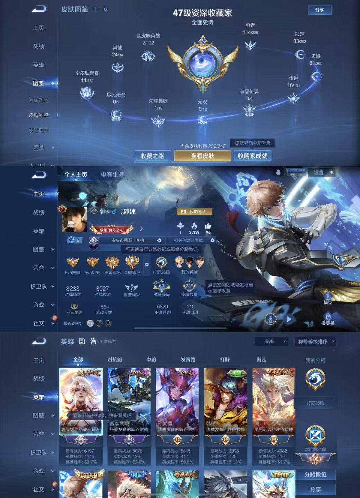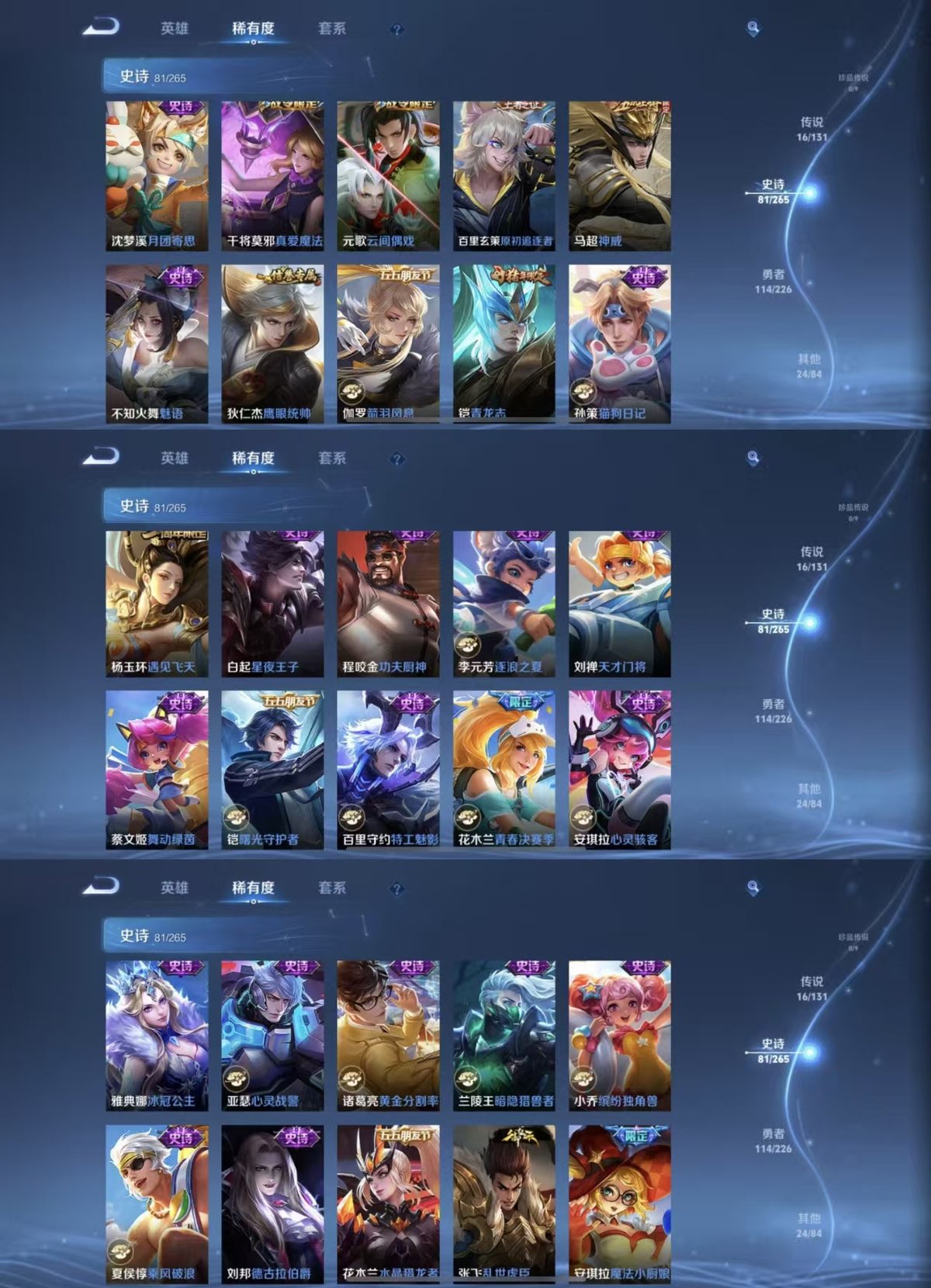 2278408-实名: 可修改 贵族等级: v7 英雄数: 126 皮肤数: 236 荣耀水晶: 鸣剑·曳影 传说皮: 黄金狮子座猫影幻舞炽阳神光一念神魔末日机甲-孙尚香地狱之眼碎云山海·炽霜斩山海·苍雷引幻光神呛神树通天 限定皮: 遇见飞天魔法小厨娘神威青春决赛季青龙志孙行者傲雪梅呛五谷丰年怒海麟威山海·玄木吟齐天大圣鸣野蒿愿照·千秋盛愿照·九