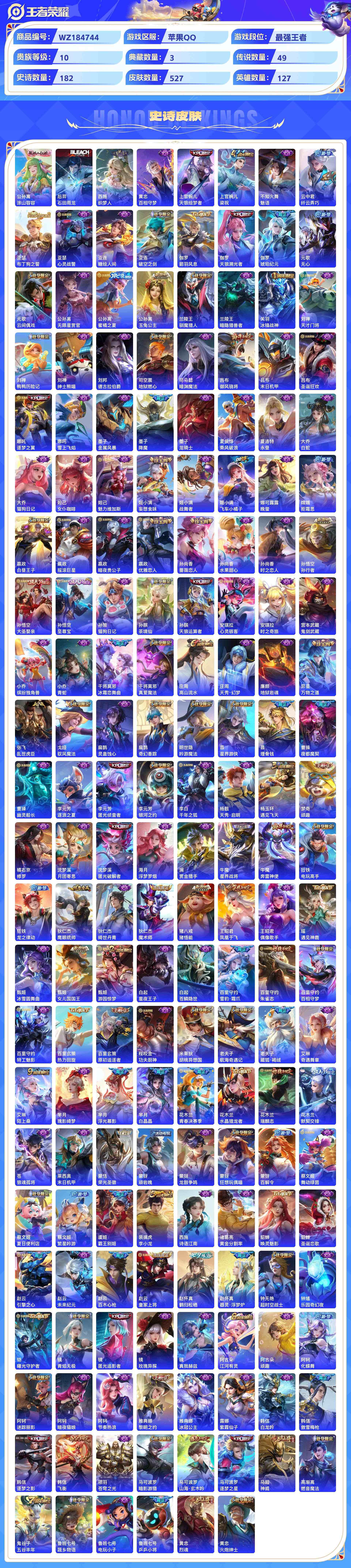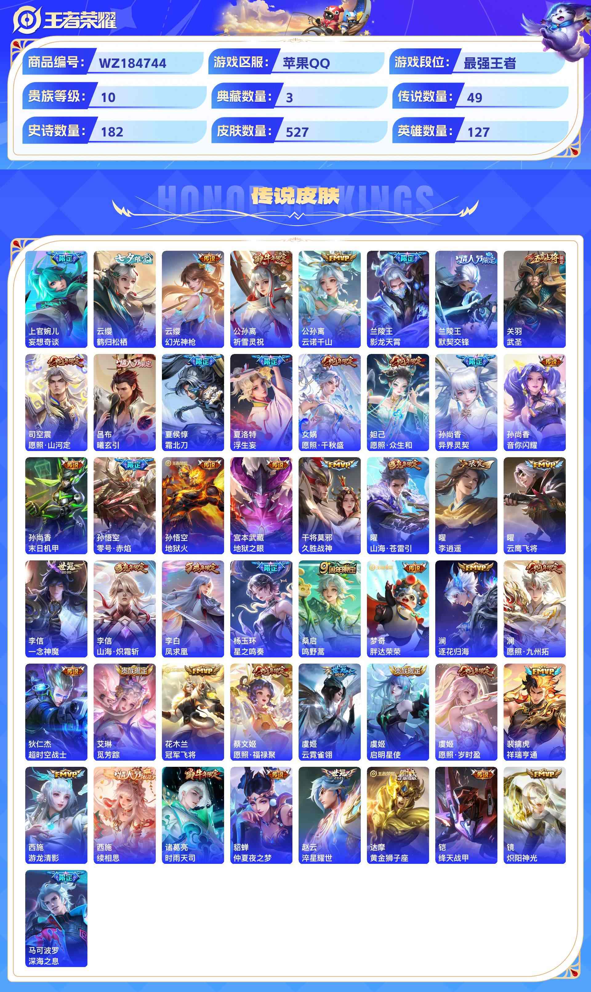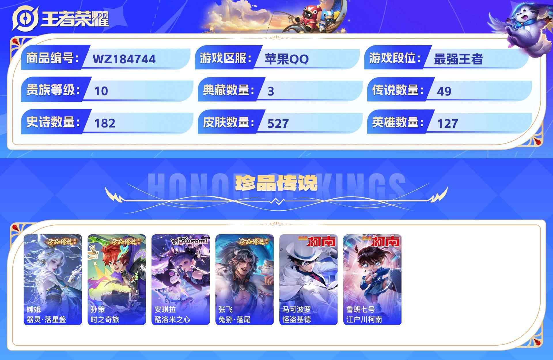 wz184744|极品金标号1金标(花木兰)【荣耀典藏】鸣剑·曳影九霄神辉幻阙歌【珍品传说】器灵·落星盏时之奇旅酷洛米之心兔狲·蓬尾怪盗基德江户川柯南【无双限定】器灵·螭龙剑雪境奇遇苹果qq 贵族10级 527皮 3典藏 6珍品传说 2无双 49传说 182史诗3星传说51个性按键4天幕