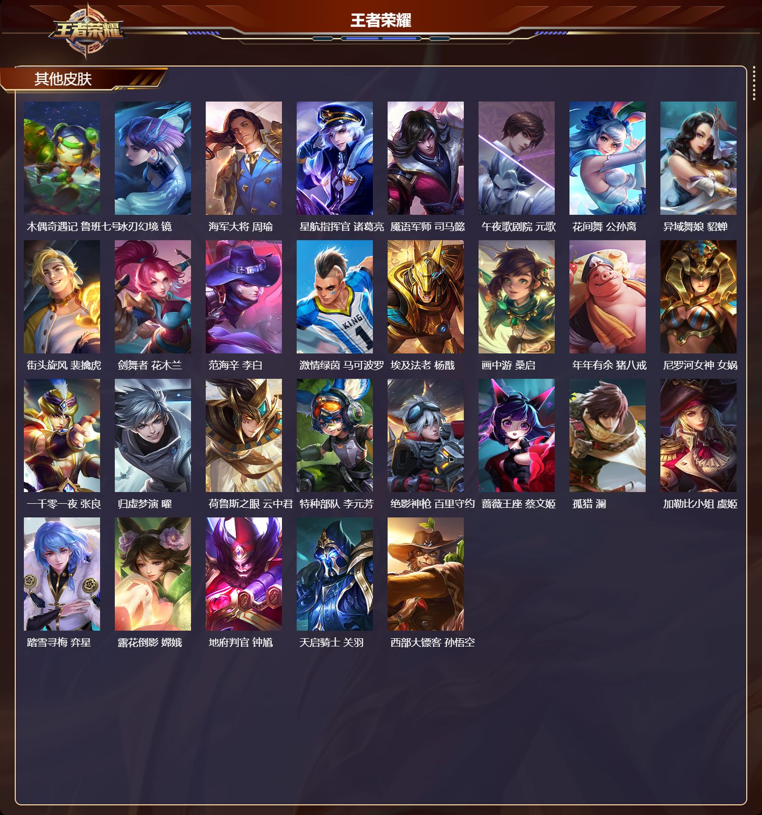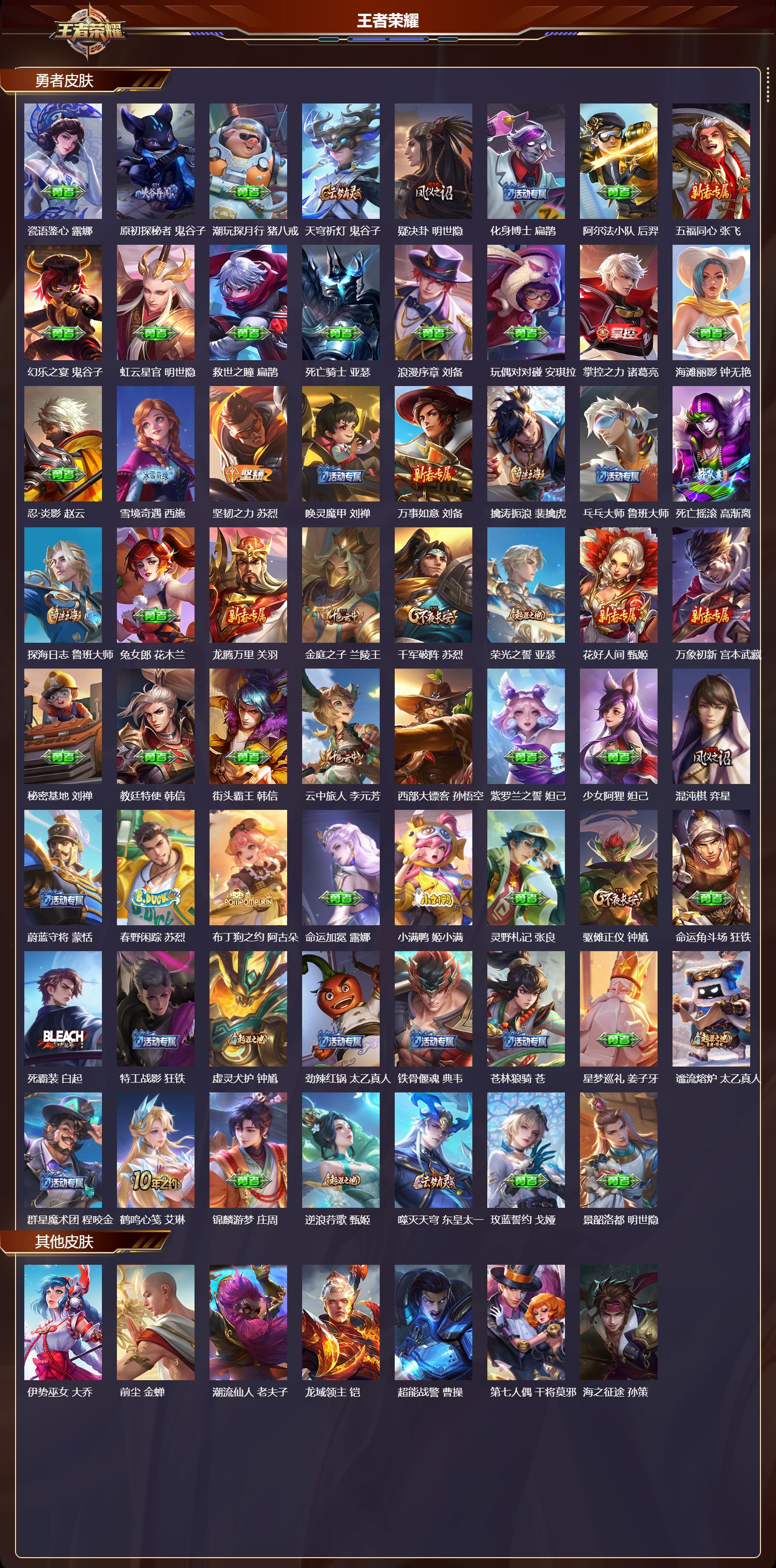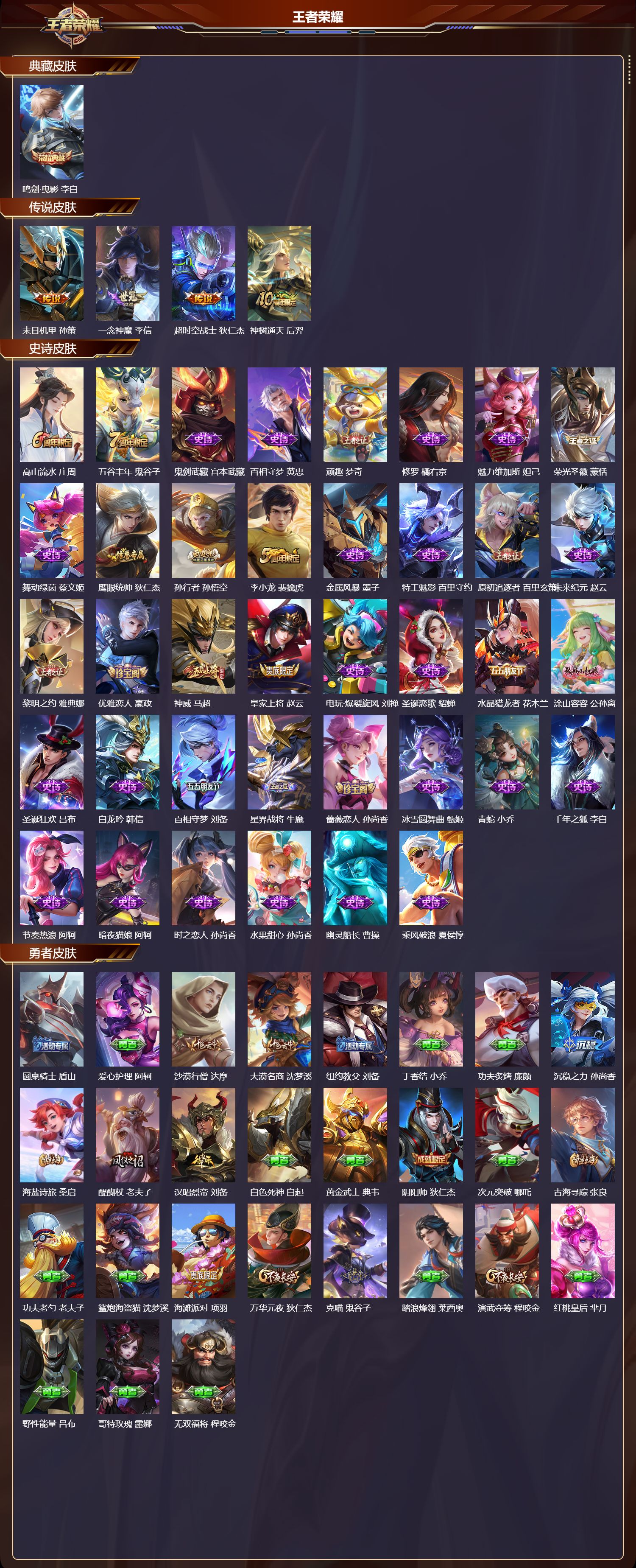 安卓qq/非凡王者/169皮肤/125英雄/1典藏/0珍品无双/0无双/0珍品传说/4传说/38史诗/8稀有英雄【1 典藏皮肤】鸣剑·曳影 李白【4 传说皮肤】末日机甲 孙策一念神魔 李信超时空战士 狄仁杰神树通天 后羿【38 史诗皮肤】高山流水 庄周五谷丰年 鬼谷子鬼剑武藏 宫本武藏百相守梦 黄忠顽趣 梦奇修罗 橘右京魅力维加斯 妲己荣光圣徽 蒙恬舞动绿茵 蔡文姬鹰眼