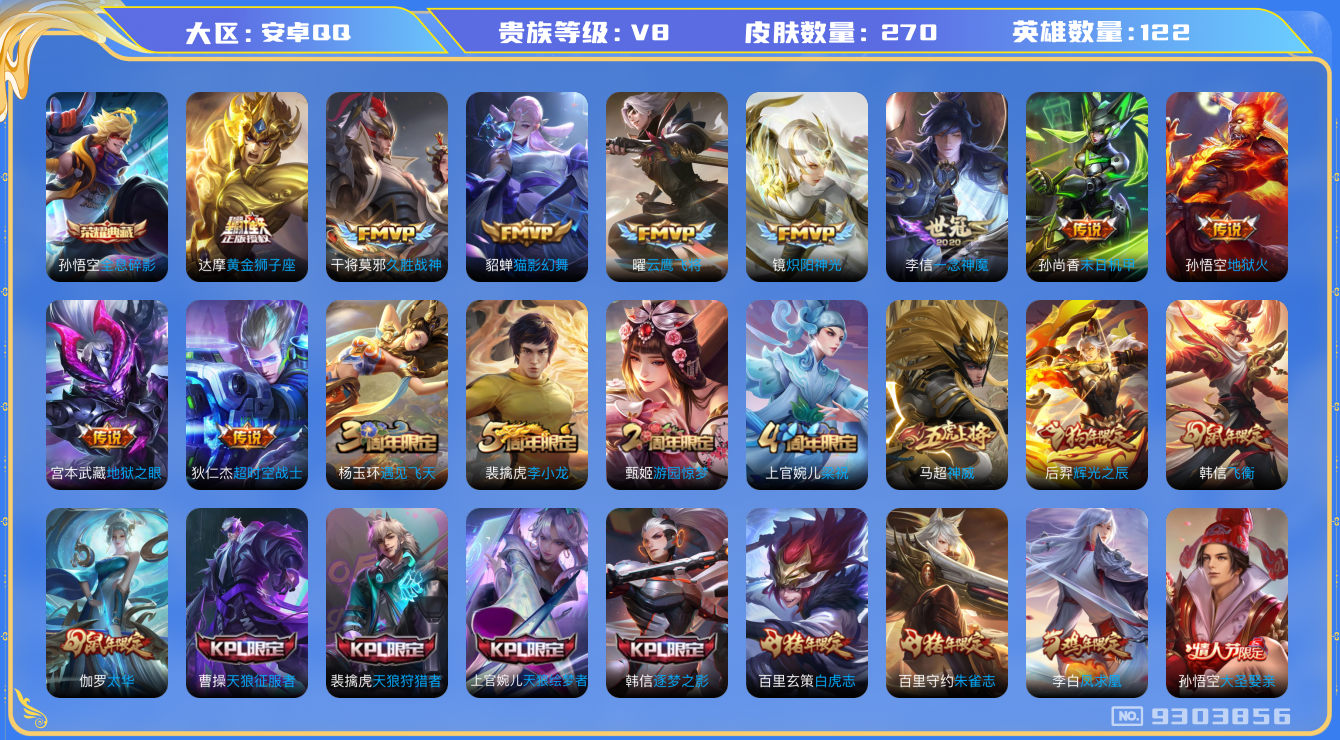 [9303856]可二次实名【安卓q】贵族8-贵族积分6.8万-8印记-122英雄-270皮肤-1典藏-17传说-1星传说-67史诗★段位根据赛季更新发生变化★典藏:孙悟空全息碎影★传说:百里玄策白虎志、吕布天魔缭乱、镜炽阳神光、虞姬启明星使、曜云鹰飞将、李信一念神魔、伽罗太华、貂蝉猫影幻舞、干将莫邪久胜战神、达摩黄金狮子座、孙尚香末日机甲、孙悟空地狱火、李白凤求凰、诸葛亮武陵仙君、宫本武藏地狱之眼、狄仁杰超时空战士、桑启鸣野蒿★星传说:未来机甲★限定:至尊宝、白龙吟、朱雀志、神威、飞衡★详情看图/号满满/低价出售找回包赔★营地号470738445