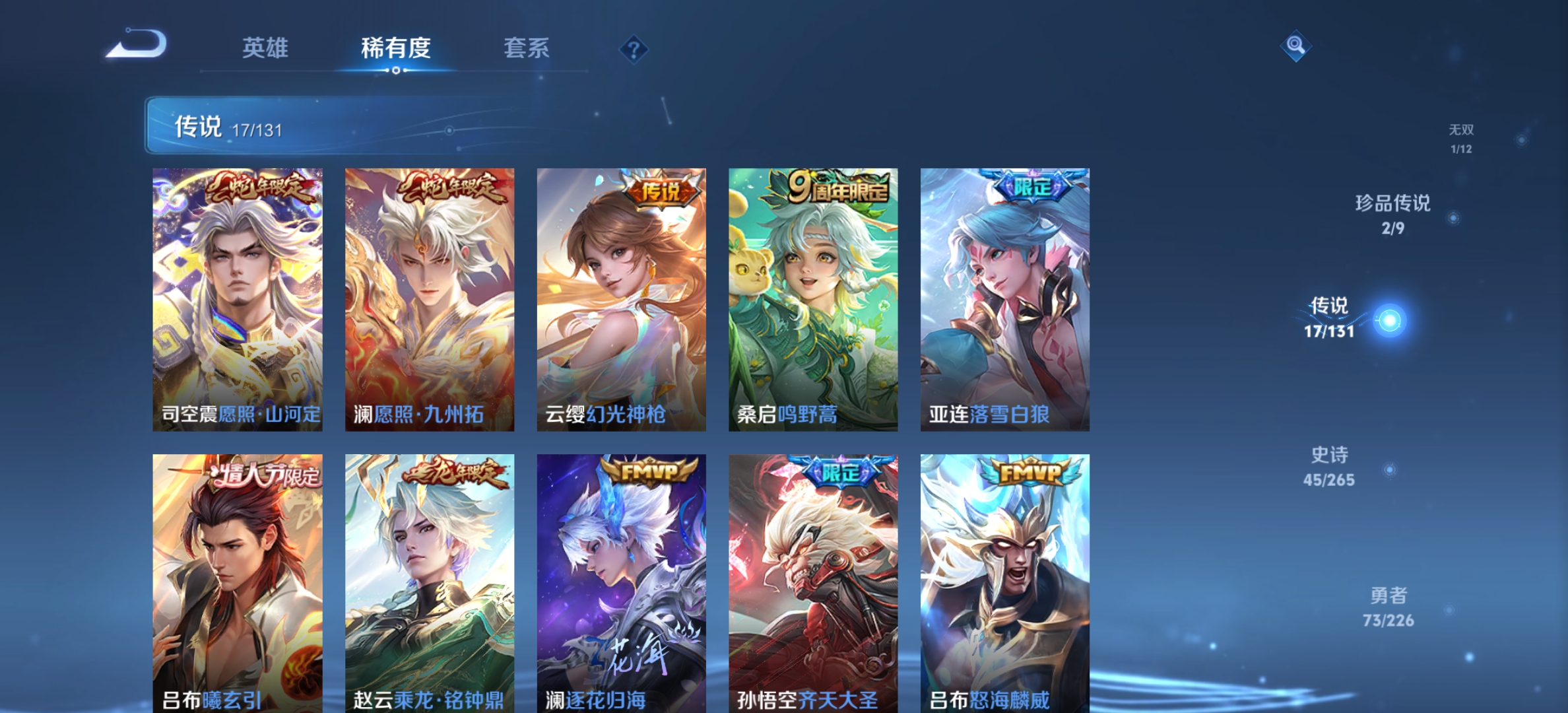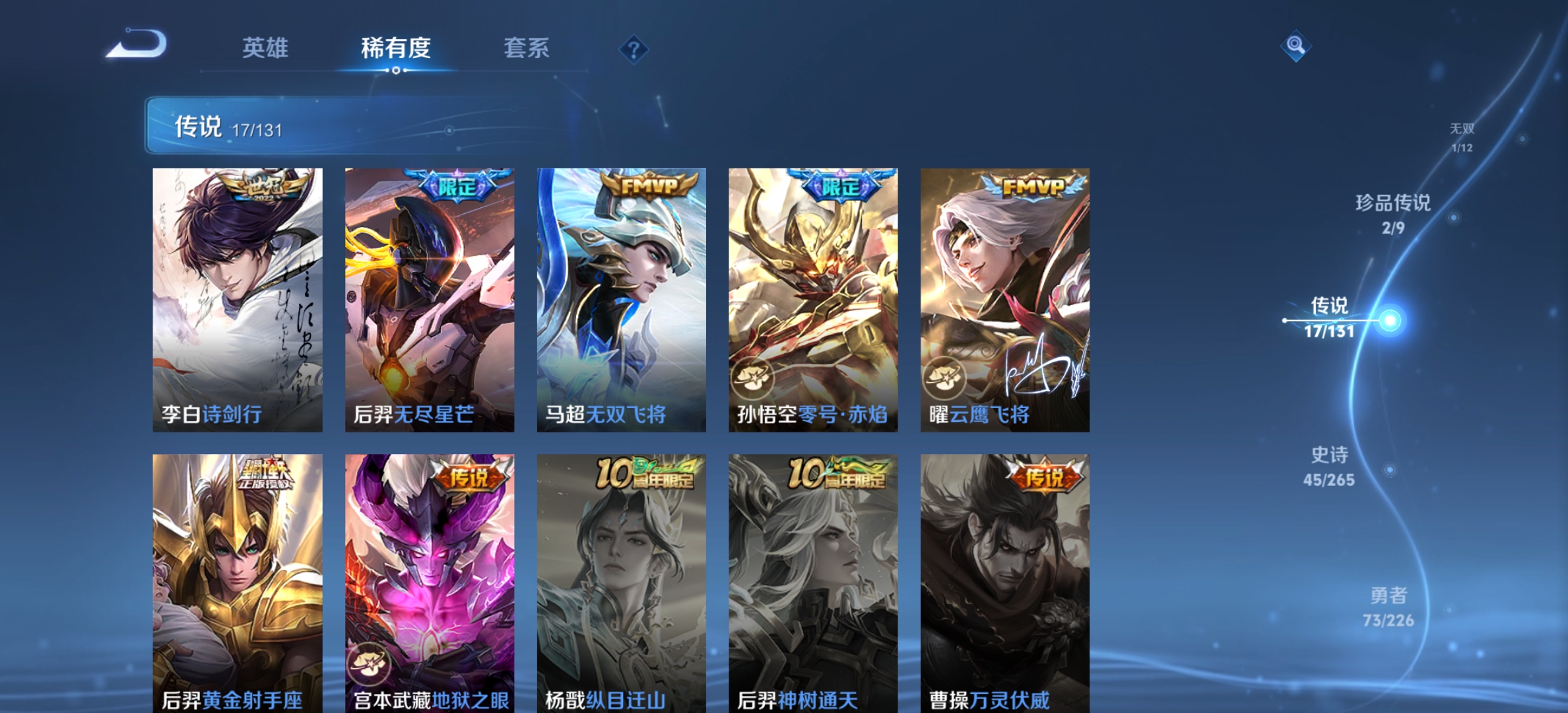 【王者荣耀】【lywz20873】珍品无双0 典藏1 无双1 珍品传说2 传说17 史诗45 英雄126 皮肤170 贵族7级 荣耀典藏:鸣剑·曳影__无双皮肤:器灵·螭龙剑__珍品传说:怪盗基德|孙策-时之奇旅__传说皮肤:鸣野蒿|无尽星芒|无双飞将|地狱之眼|黄金射手座|云鹰飞将|齐天大圣|零号·赤焰|落雪白狼|吕布-曦玄引|怒海麟威|诗剑行|逐花归海|乘龙·铭钟鼎|幻光神呛|愿照·山河定|愿照·九州拓__稀有限定:御风骁将|孙行者|傲雪梅呛|李小龙|暗影游猎|超元猎域|海滩派对|皇家上将|剑破天穹|魔术师|青焰无极|天穹祈灯|妄想食味|阴阳师|银河之约|原初追逐者|暗隐猎兽者|暗渊魔法|冰雪圆舞曲|乘风破浪|德古拉伯爵|鬼剑武藏|黄金分割率|箭羽风息|节奏热浪|金属风暴|魅力维加斯|热力回旋|圣诞恋歌|水果甜心|天才门将|赵云-未来纪元|星夜王子|鹰眼统帅|永昼|逐浪之夏|百里守约-百相守梦|老夫子-百相守梦|星界特工|噬灭天穹|敬我三分|破空之剑|东方月初|埋骨钱|顽岩魄|天穹之誓|修罗|特工魅影|茶境仙|星界战将|谧流熔炉|化蝶舞|孙悟空-神迹守卫|访茗客|苍威无极|天堂福音|灵蛊蚀心|虚灵犬护|逆浪荇歌|黄忠-百相守梦|荣光之誓|鹤鸣心笺__优质皮肤:一千零一夜|年年有余|孤猎|熊喵少女|午夜歌剧院|激情绿茵|海之征途|碧珀绯影|维京掠夺者|启蛰|伊势巫女|芝加哥教父|街头旋风|绝影神呛|赤焰之缨|福禄兄弟|前尘|精灵王|星航指挥官|龙域领主|爱与和平|花间舞|魇语军师|极冰防御线|花见巫女|蔷薇王座|灼热之刃|暗都幽影|瓷语鉴心|次元突破|鲨炮海盗猫|虹云星官|坚韧之力|功夫老勺|海滩丽影|阿尔法小队|死亡骑士|黄金武士|宫本武藏-未来纪元|红桃皇后|忍·炎影|街头霸王|教廷特使|时空谍影|破局者|西部游侠|危途狂花|契约魔法|次元傲视|拳王|哥特玫瑰|魅影绮裳|西施-雪境奇遇|景韶洛都|浪漫序章|缤纷绘卷|掌控之力|雾都夜雨|逐霄战戟|铁骨偃魂|龙腾万里|孙悟空-西部大镖客|热血海滩|龙舞盛年|汉昭烈帝|乓乓大师|五福同心|曜-归虚梦演|程咬金-群星魔术团|完美运算|花好人间|熔金海岸|春野之旅|无尽旅途|万象初新|苍林狼骑|蔚蓝守将|特工战影|春野闲踪|灵野札记|玫蓝誓约|命运加冕|小满鸭|死霸装|踏浪烽翎|克喵__贵族等级:贵族7级__王者段位:至尊星耀无双器灵·螭龙剑 典藏鸣剑·曳影 2珍品怪盗基德,时之奇旅 怒海麟威,曦玄引,零号·赤焰,齐天大圣,落雪白狼,诗剑行,逐花归海,愿照·九州拓,云鹰飞将,鸣野蒿,幻光神呛,愿照·山河定,乘龙·铭钟鼎,无双飞将,无尽星芒,黄金射手座