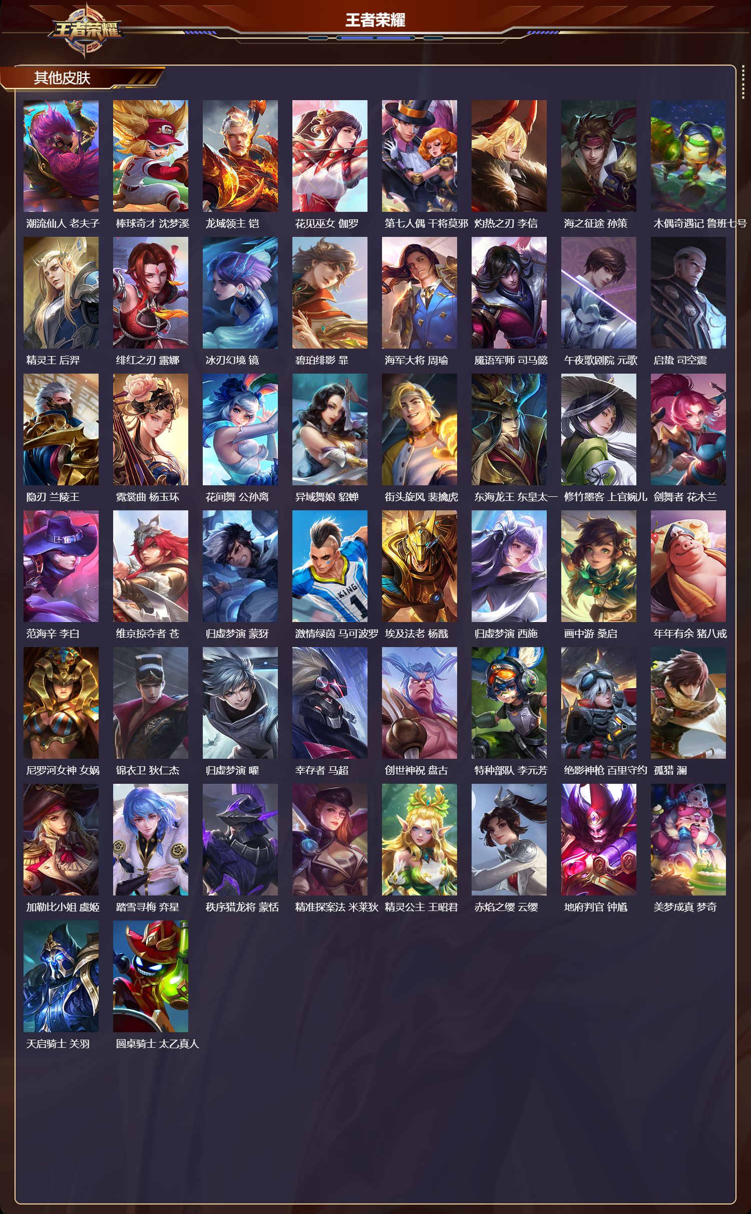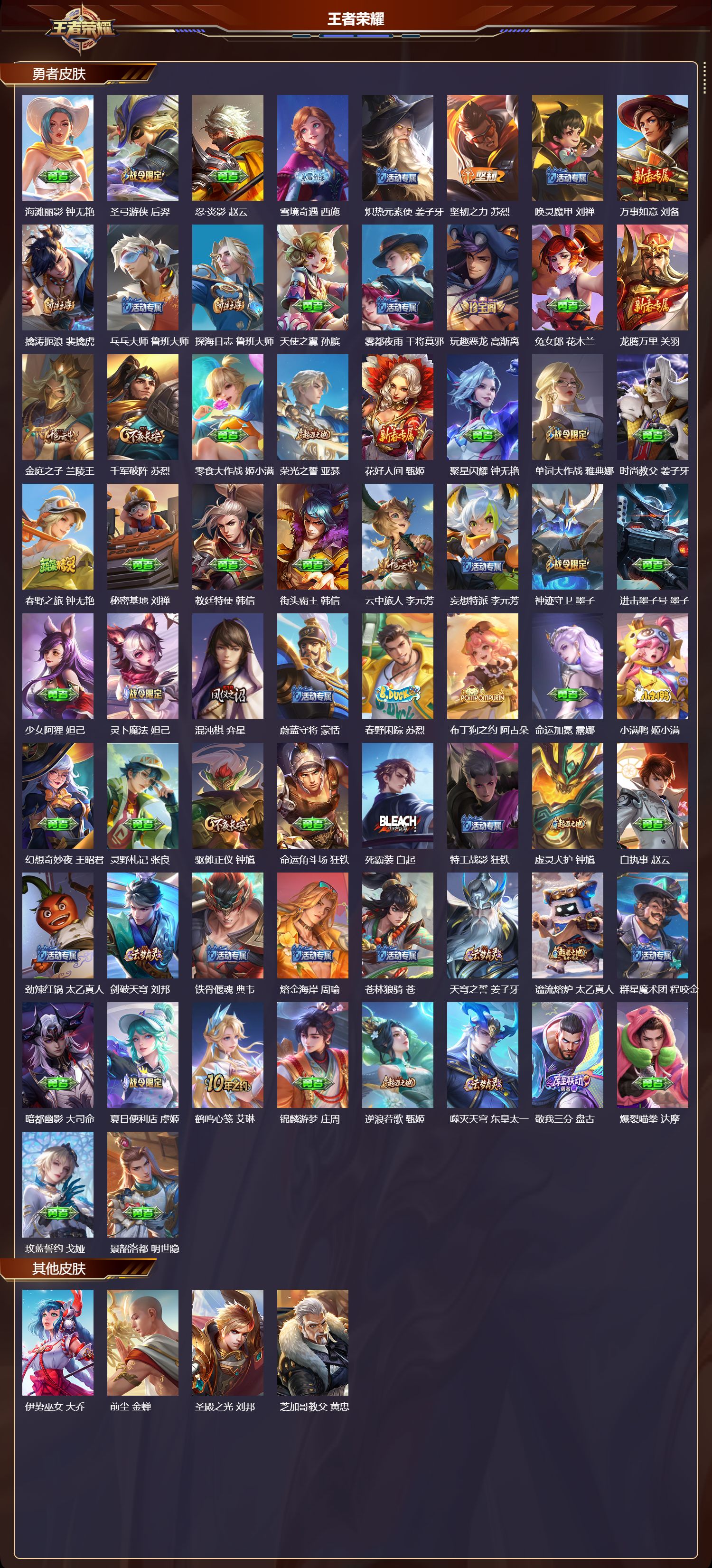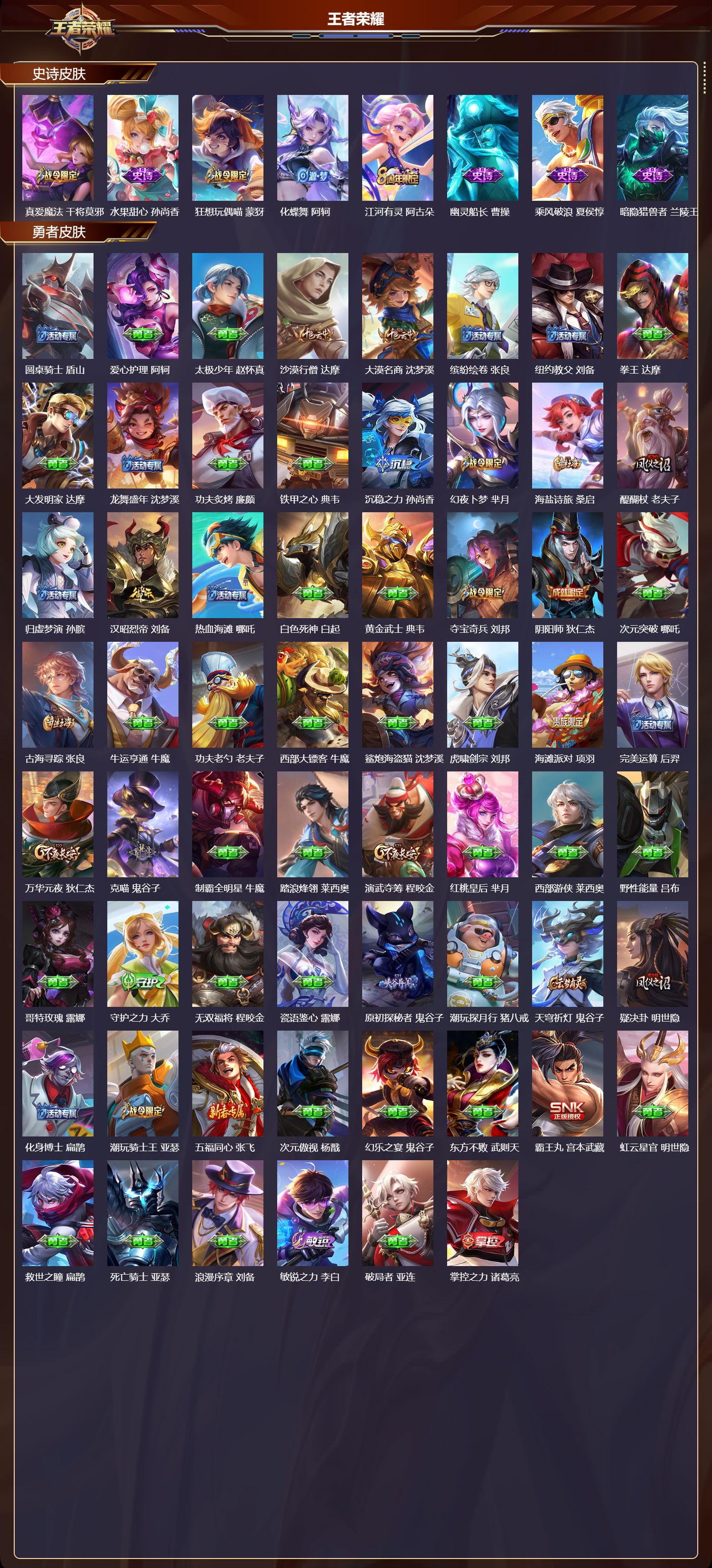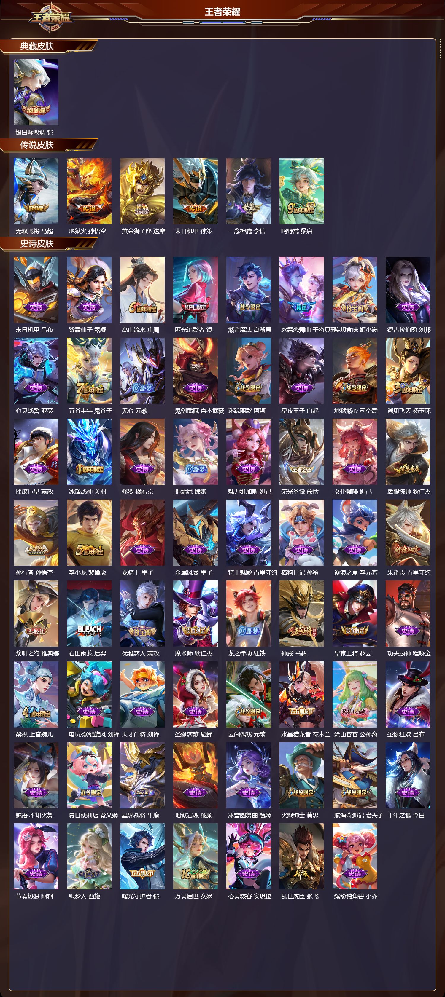 苹果qq/至圣王者/260皮肤/127英雄/1典藏/0珍品无双/0无双/0珍品传说/6传说/71史诗/9稀有英雄【1 典藏皮肤】银白咏叹调 铠【6 传说皮肤】无双飞将 马超地狱火 孙悟空黄金狮子座 达摩末日机甲 孙策一念神魔 李信鸣野蒿 桑启【71 史诗皮肤】末日机甲 吕布紫霞仙子 露娜高山流水 庄周匿光追影者 镜燃音魔法 高渐离冰霜恋舞曲 干将莫邪妄想食味 姬小满德古