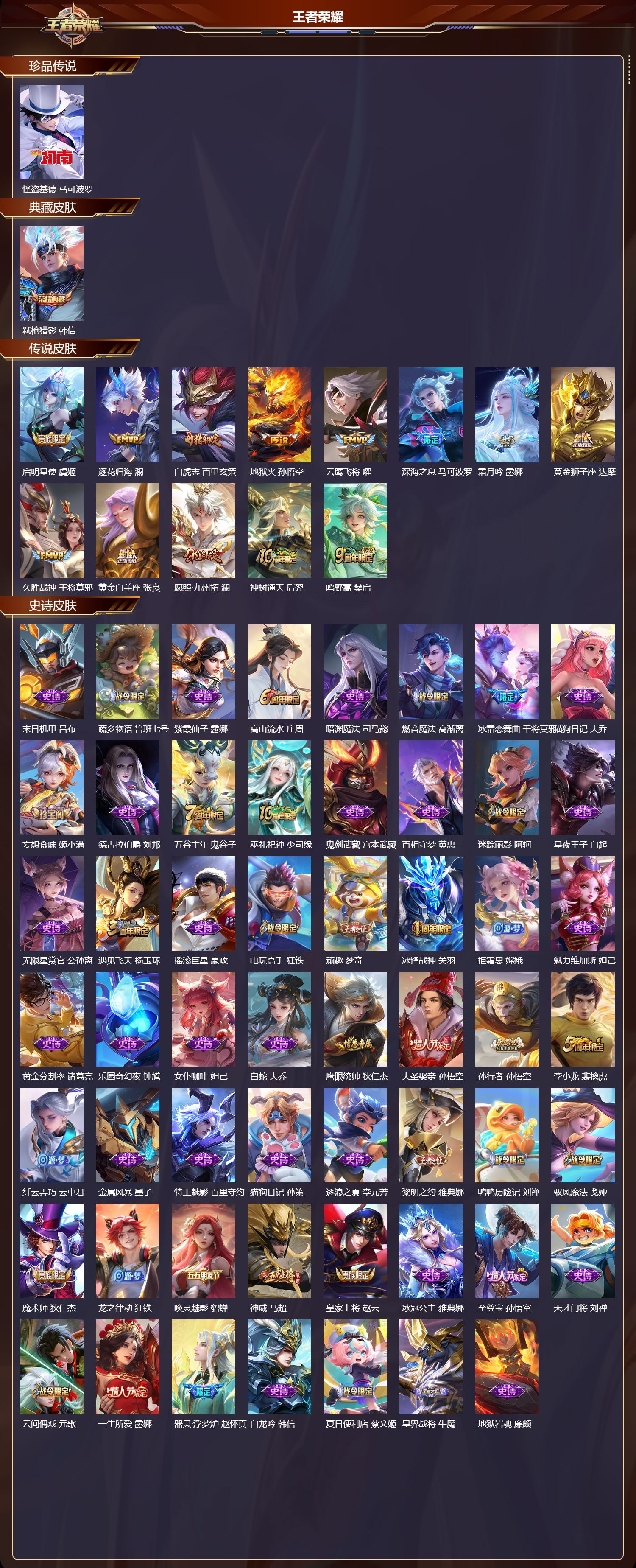 2281014-q/最强王者/244皮肤/126英雄/1典藏/0珍品无双/0无双/1珍品传说/13传说/69史诗/8稀有英雄 【1 珍品传说】怪盗基德 马可波罗 【1 典藏皮肤】弑呛猎影 韩信 【13 传说皮肤】启明星使 虞姬逐花归海 澜白虎志 百里玄策地狱火 孙悟空云鹰飞将 曜深海之息 马可波罗霜月吟 露娜黄金狮子座 达摩久胜战神 干将莫邪黄金白羊座 张良愿照·九州