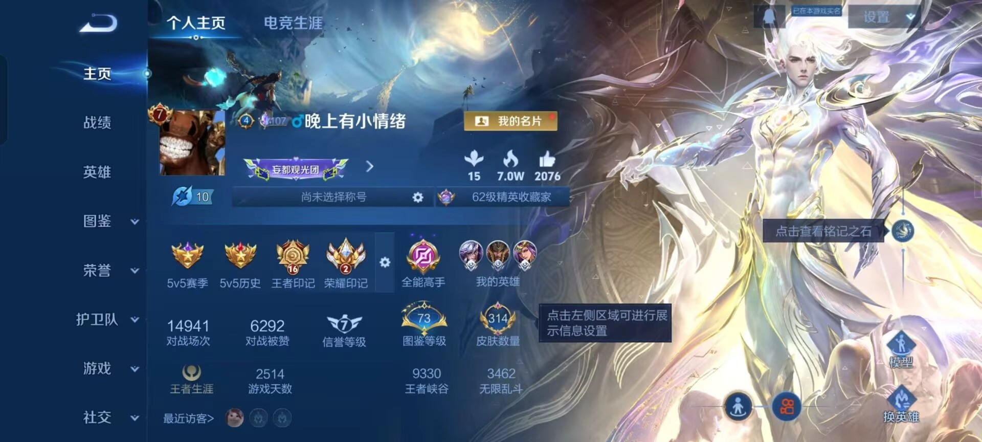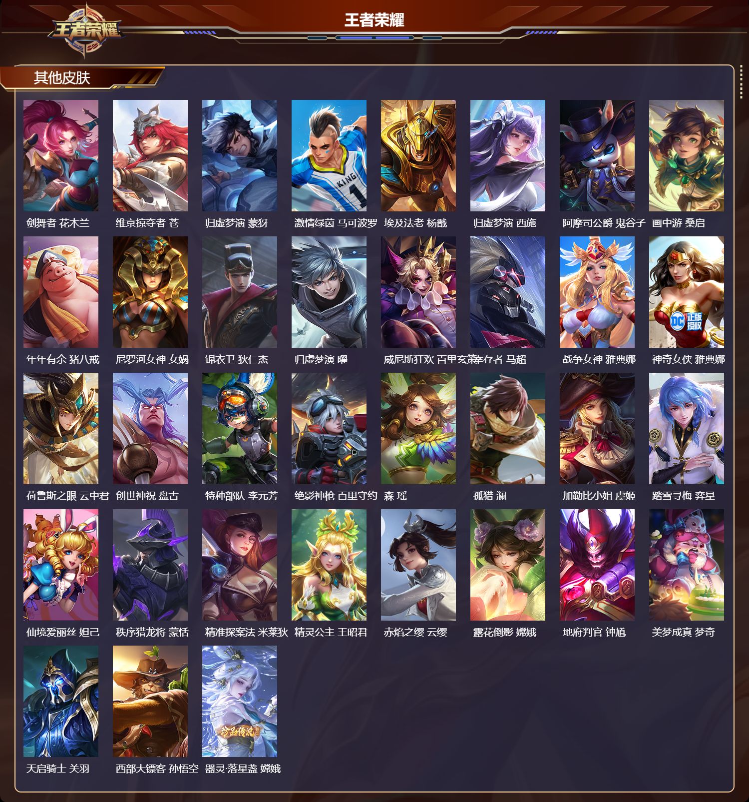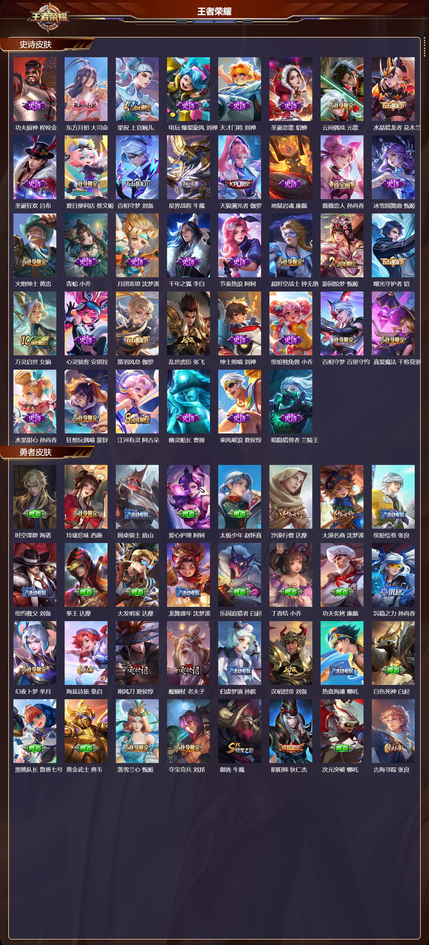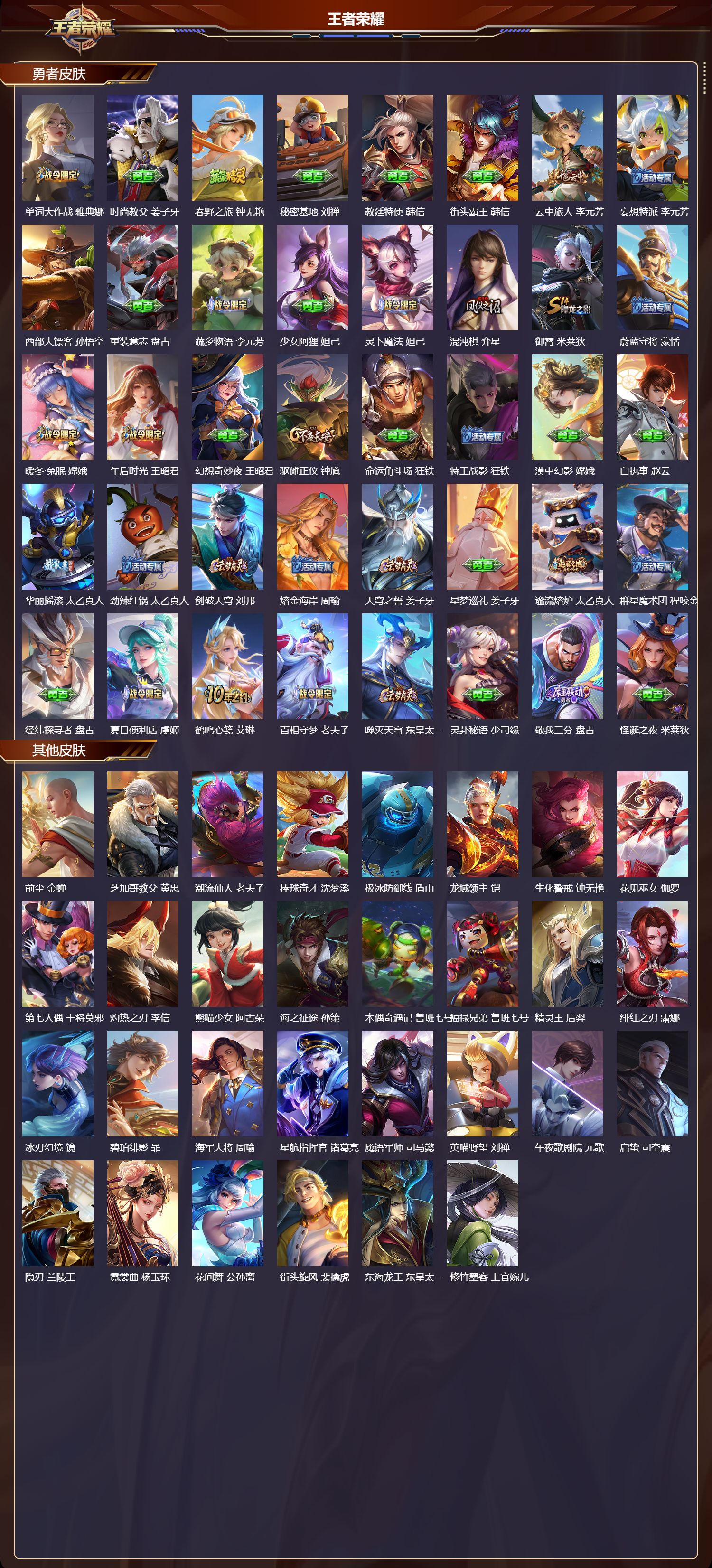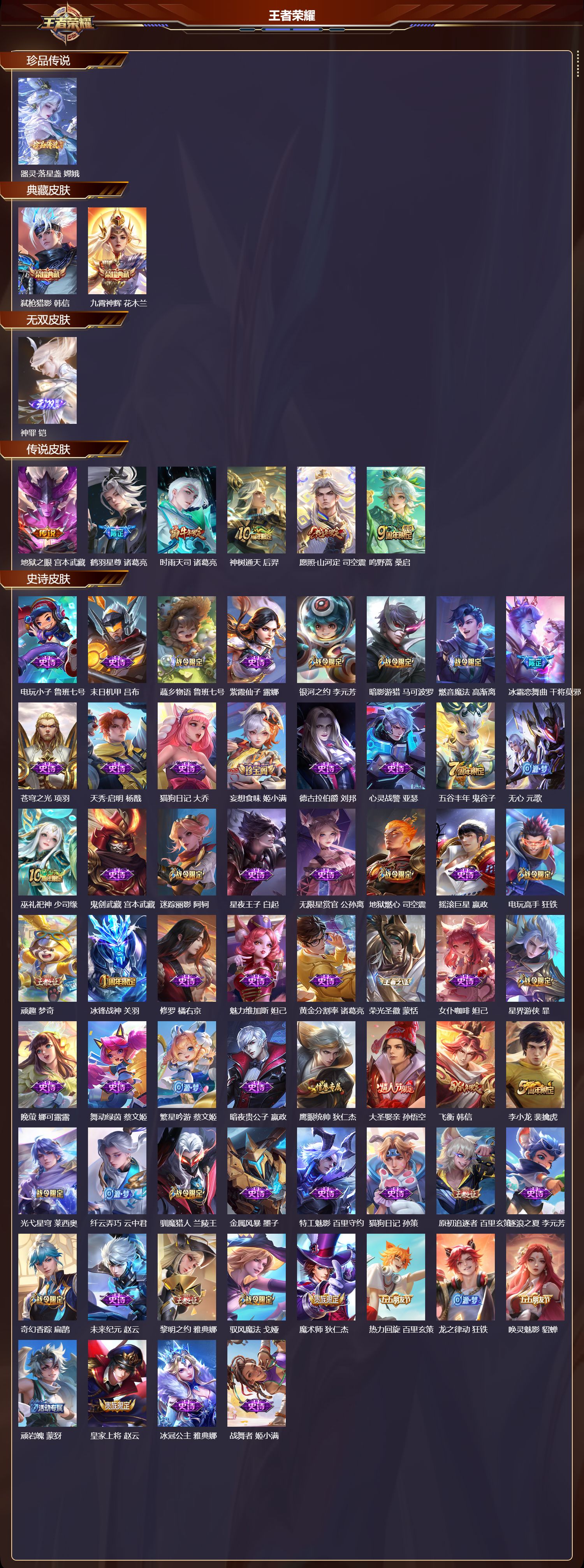 安卓qq/绝世王者/314皮肤/127英雄/2典藏/0珍品无双/1无双/1珍品传说/6传说/98史诗/9稀有英雄【1 珍品传说】器灵·落星盏 嫦娥【2 典藏皮肤】弑呛猎影 韩信九霄神辉 花木兰【1 无双皮肤】神罪 铠【6 传说皮肤】地狱之眼 宫本武藏鹤羽星尊 诸葛亮时雨天司 诸葛亮神树通天 后羿愿照·山河定 司空震鸣野蒿 桑启【98 史诗皮肤】电玩小子 鲁班七号末日机甲 吕布