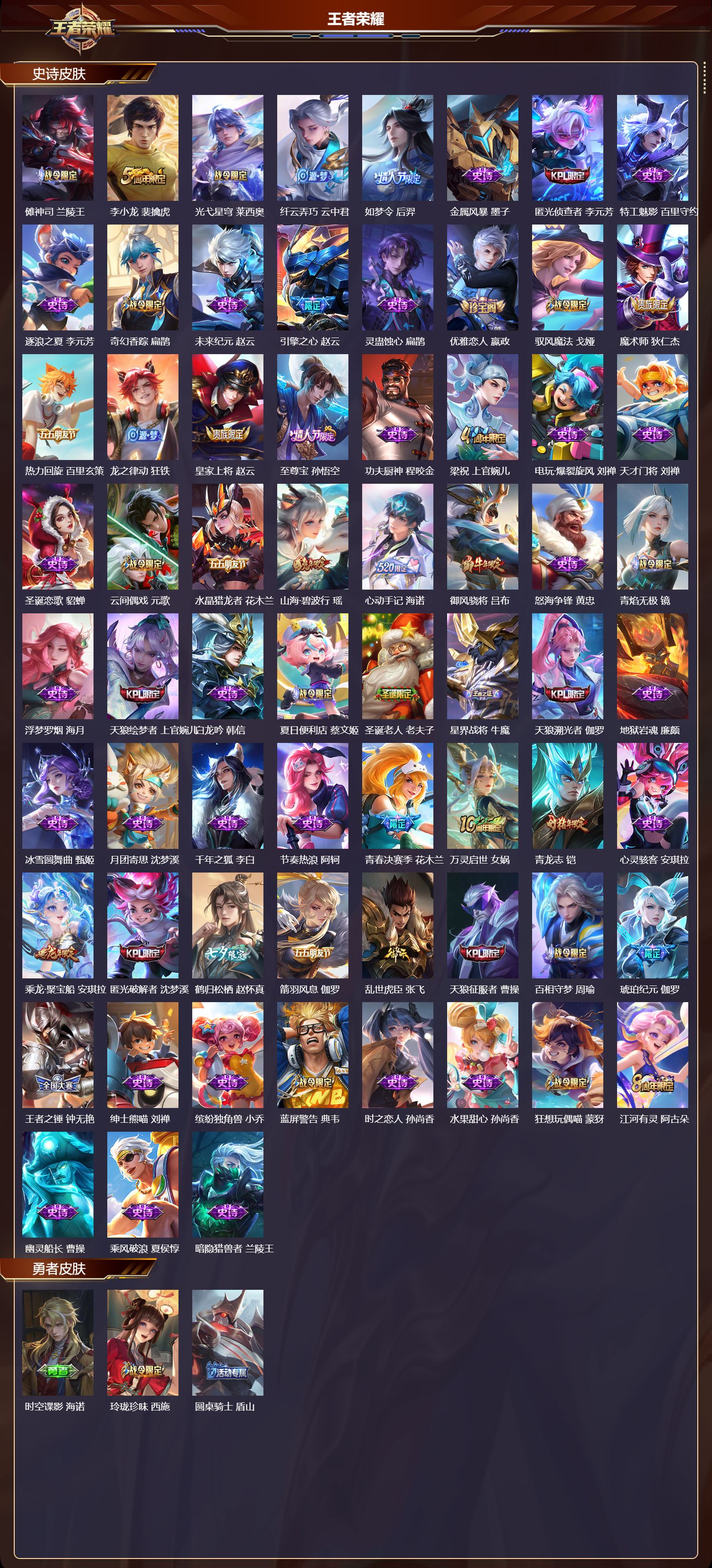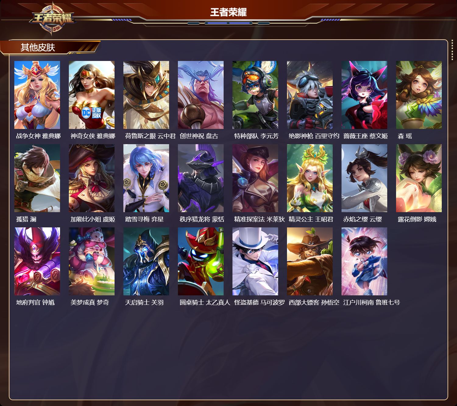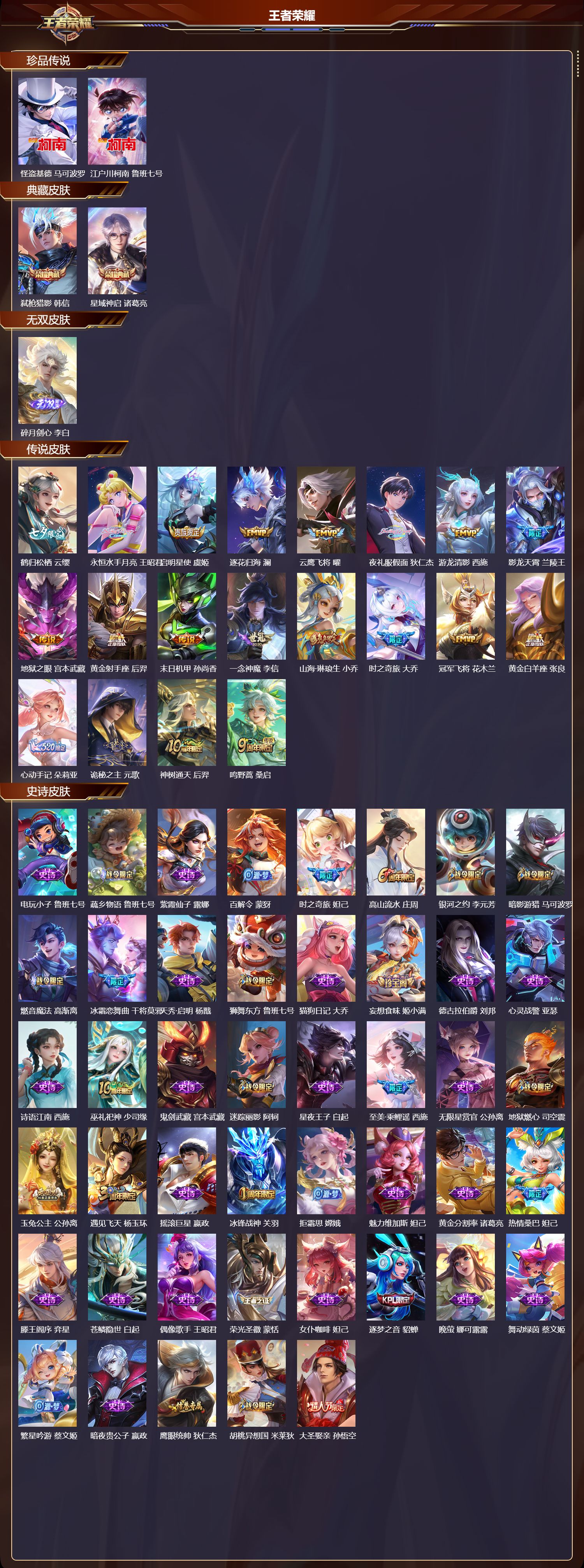 安卓qq/无双王者/372皮肤/127英雄/2典藏/0珍品无双/1无双/2珍品传说/20传说/112史诗/9稀有英雄【2 珍品传说】怪盗基德 马可波罗江户川柯南 鲁班七号【2 典藏皮肤】弑呛猎影 韩信星域神启 诸葛亮【1 无双皮肤】碎月剑心 李白【20 传说皮肤】鹤归松栖 云缨永恒水手月亮 王昭君启明星使 虞姬逐花归海 澜云鹰飞将 曜夜礼服假面 狄仁杰游龙清影 西施影龙天霄