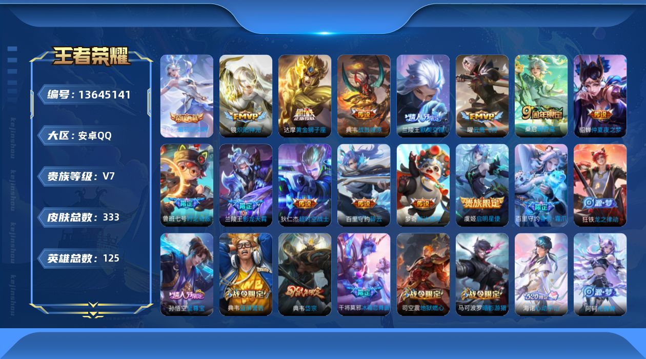 [13645141]无二次:贵族积分51035 安卓q-v7-永恒钻石iv段位-125英雄-333皮肤-1典藏-0珍品无双-0无双-0珍品传说-13传说-92史诗 荣耀典藏:伽罗最初的交响 钻石20783 星币2541 点卷5 皮肤碎片4 荣耀积分13 积分夺宝32抽 蔷薇之心142