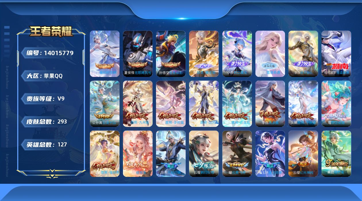 [14015779]可二次 小女号 贵族9 王者9星 贵族积分112729 苹果手q120区293皮3典藏23传说4无双1珍品传说v9 营地id529656295最强王者【珍品传说皮肤】:怪盗基德【无双皮肤】:碎月剑心时之魔女器灵·螭龙剑雪境奇遇【荣耀典藏】:最初的交响无限飓风号全息碎影【优质限定皮肤】:瑶时之祈愿神威至尊宝凤求凰【传说皮肤】:海洋之心神树通天千山共赴云诺千