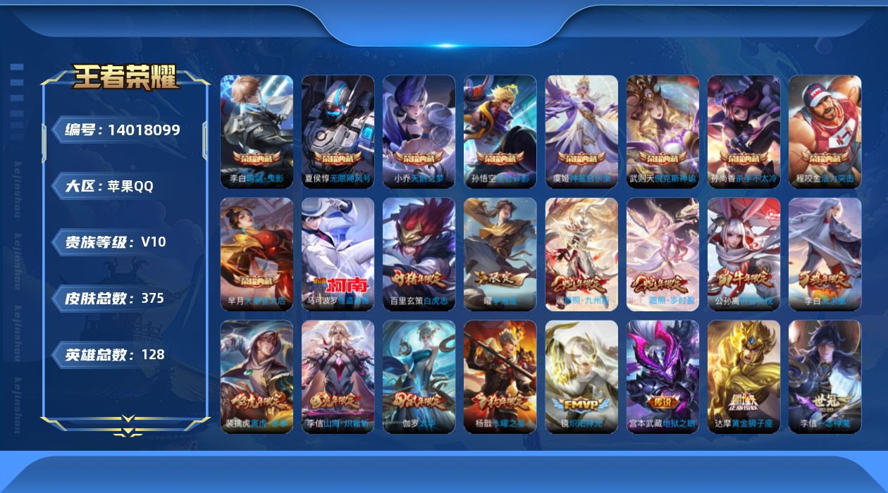 [14018099]苹果手q112区375皮9典藏45传说0无双1珍品传说v10 营地id1840062604非凡王者【珍品传说皮肤】:怪盗基德【荣耀典藏】:神鉴启示录大秦宣太后杀手不太冷倪克斯神谕活力突击鸣剑·曳影无限飓风号天鹅之梦全息碎影【优质限定皮肤】:山海·炽霜斩无双飞将凤求凰祈雪灵祝白虎志武圣至尊宝【传说皮肤】:神树通天幻光神呛愿照·岁时盈愿照·九州拓