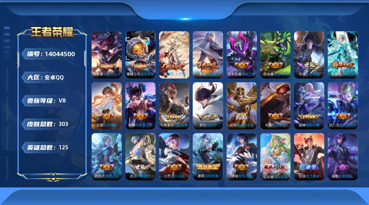 [14044500]贵族8 钻石一 贵族积分90073 安卓q-v8-永恒钻石i段位-125英雄-303皮肤-2典藏-0珍品无双-0无双-0珍品传说-19传说-77史诗 荣耀典藏:武则天英雄,孙尚香杀手不太冷,鲁班七号星空梦想 传说皮肤:澜愿照九州拓,云缨幻光神呛,李白诗剑行,赵云淬星耀世,周瑜音你心动,小乔音你心动,诸葛亮时雨天司,虞姬启明星使,李信一念神魔,刘备时之恋人,貂蝉猫影幻舞,干