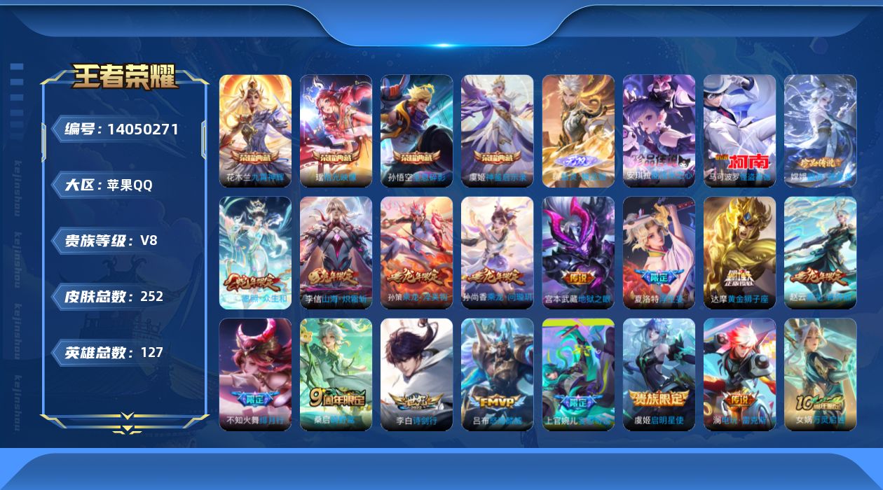[14050271]贵族8 王者6 苹果手q133区252皮4典藏16传说1无双3珍品传说v8 营地id1719921727最强王者【珍品传说皮肤】:酷洛米之心器灵·落星盏怪盗基德【无双皮肤】:器灵·螭龙剑【荣耀典藏】:拾光映像九霄神辉全息碎影神鉴启示录【优质限定皮肤】:山海·炽霜斩【传说皮肤】:地狱之眼神树通天黄金狮子座启明星使绯月行愿照·众生和妄想奇谈山海·炽